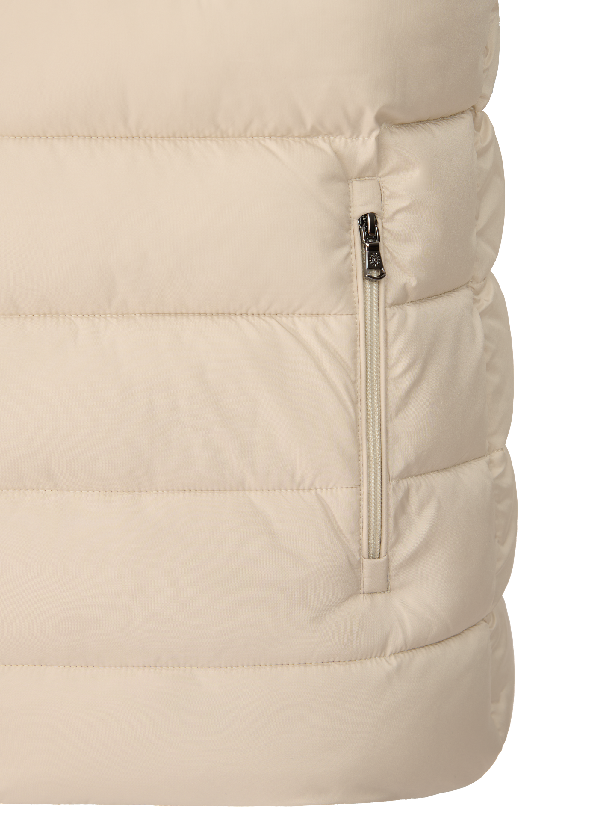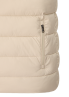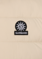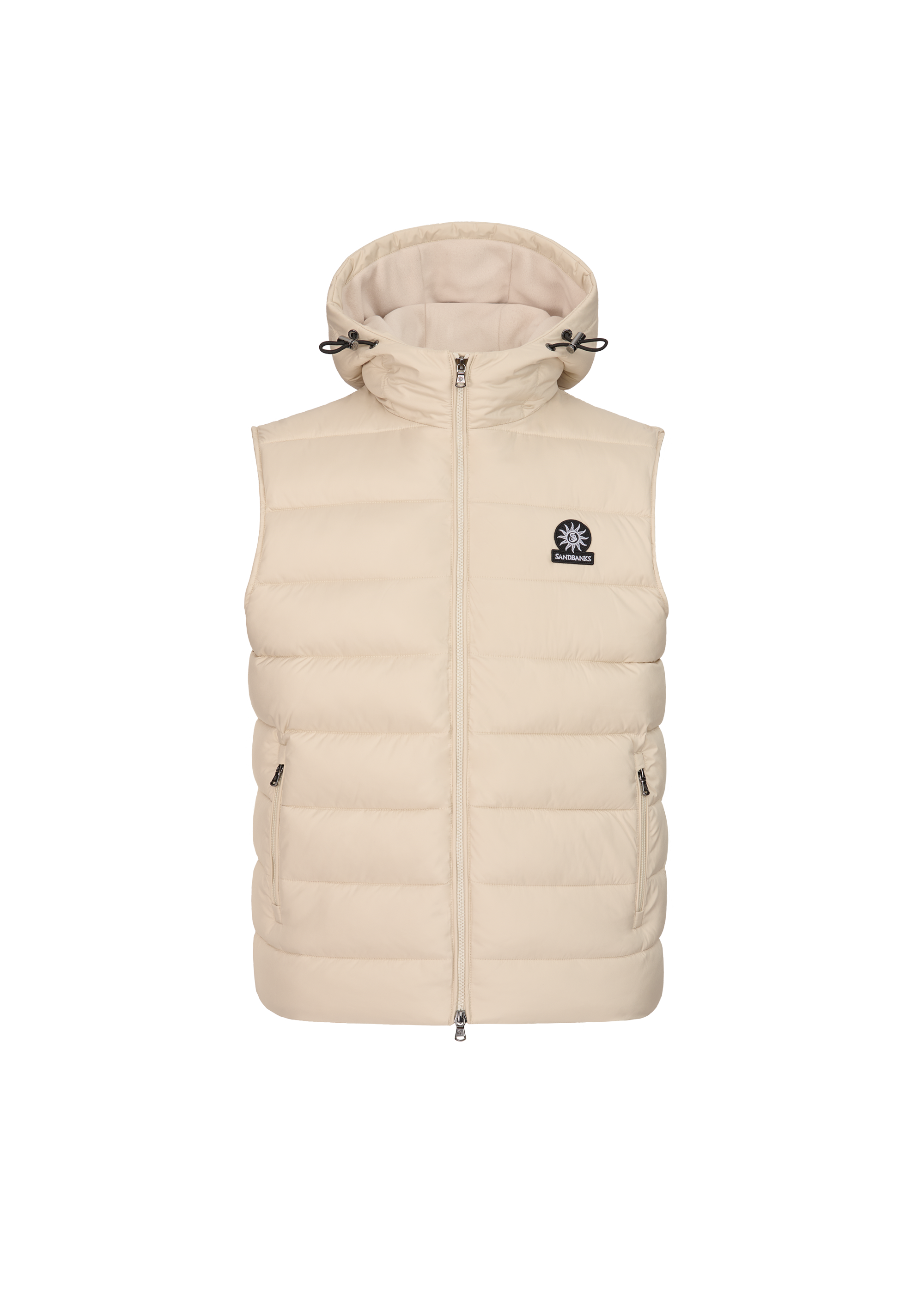 Sandbanks Frontier Hooded Puffer Gilet in stone. This lightweight gilet is made almost entirely from recycled plastic bottles and features a Sandbanks ottoman embroidered chest badge, a 2-way YKK Vislon central zip, YKK coil side entry pockets with fleece lining, and a micro polar fleece lined hood with cord adjusters.