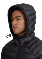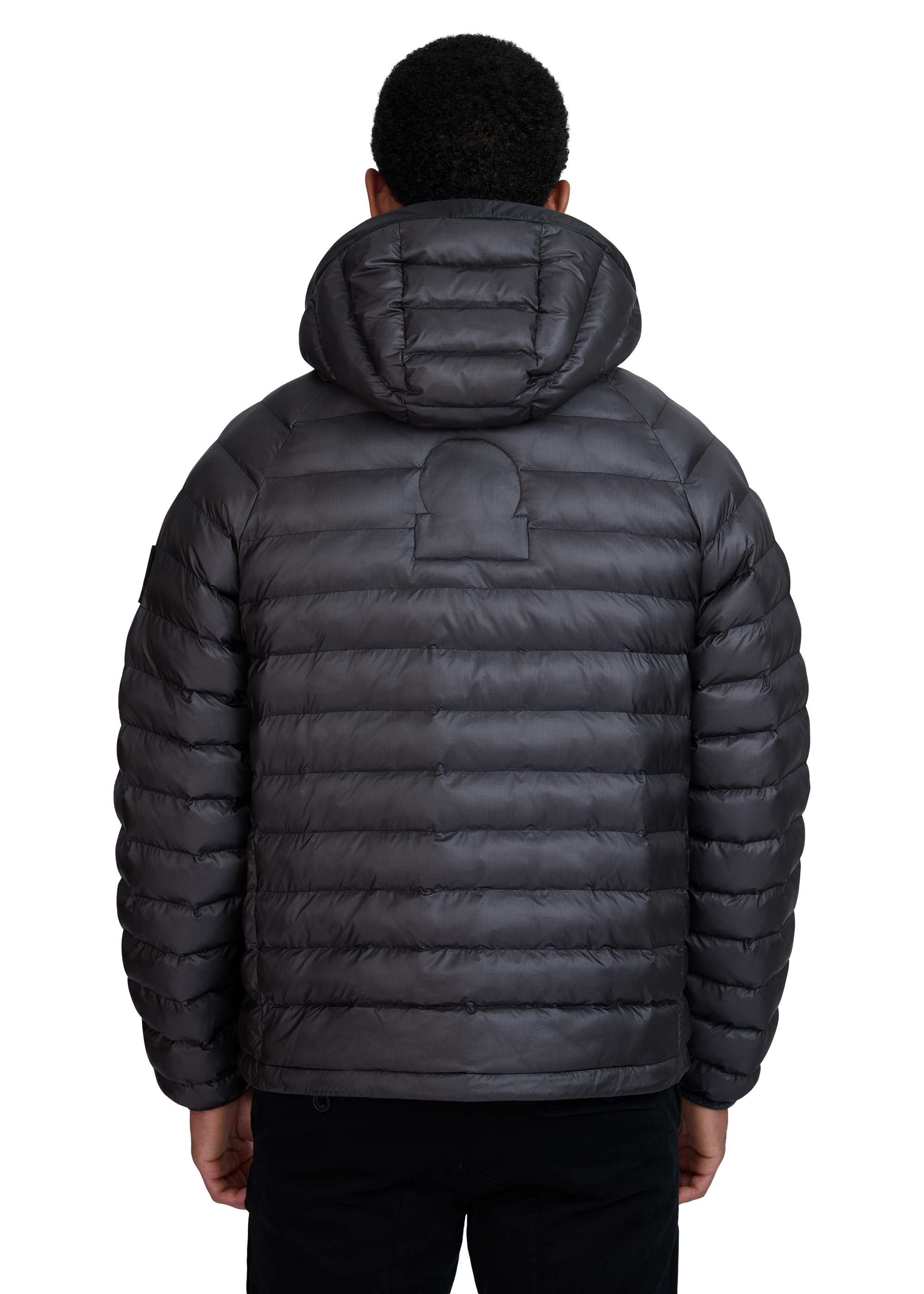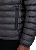 The Sandbanks Hooded Ripstop Micro Puffer Jacket in anthracite. A versatile outerwear piece, constructed from premium ripstop fabric with mixed-width baffles, delivers lightweight warmth in a classic silhouette. Features include raglan shoulders, an integrated hood with cord adjusters and zip pockets lined in Polartec® fleece to ensure comfort and protection.