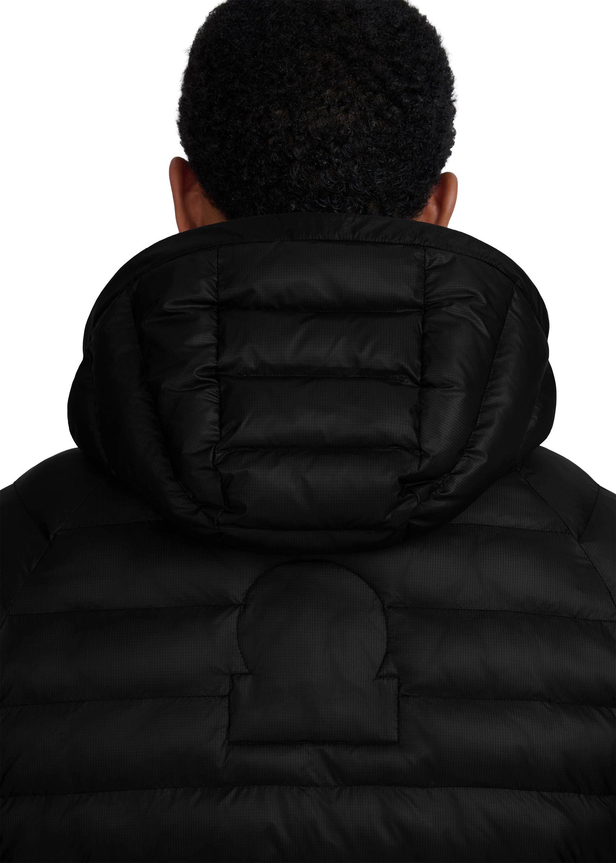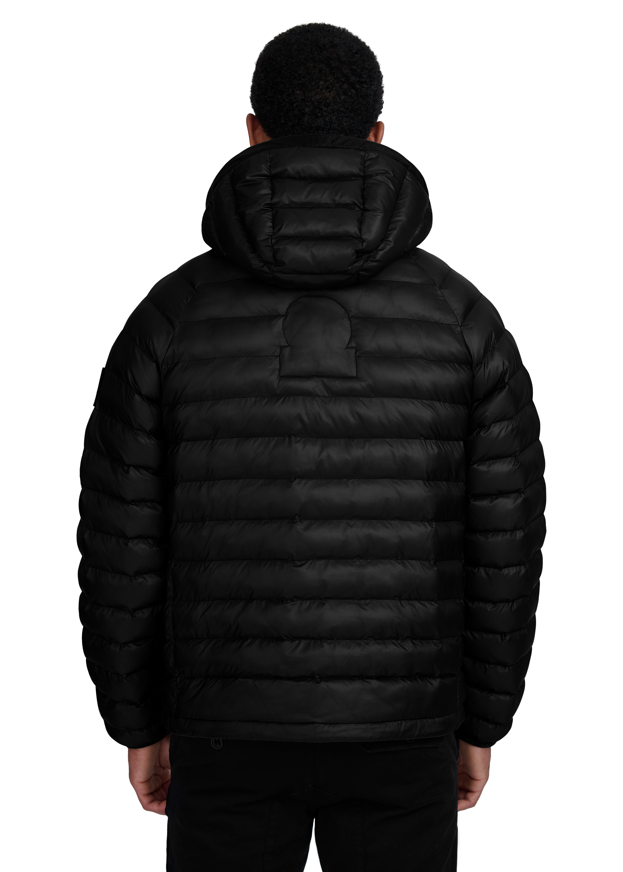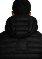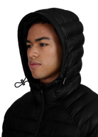 The Sandbanks Hooded Ripstop Micro Puffer Jacket in black. A versatile outerwear piece, constructed from premium ripstop fabric with mixed-width baffles, delivers lightweight warmth in a classic silhouette. Features include raglan shoulders, an integrated hood with cord adjusters and zip pockets lined in Polartec® fleece to ensure comfort and protection.