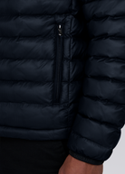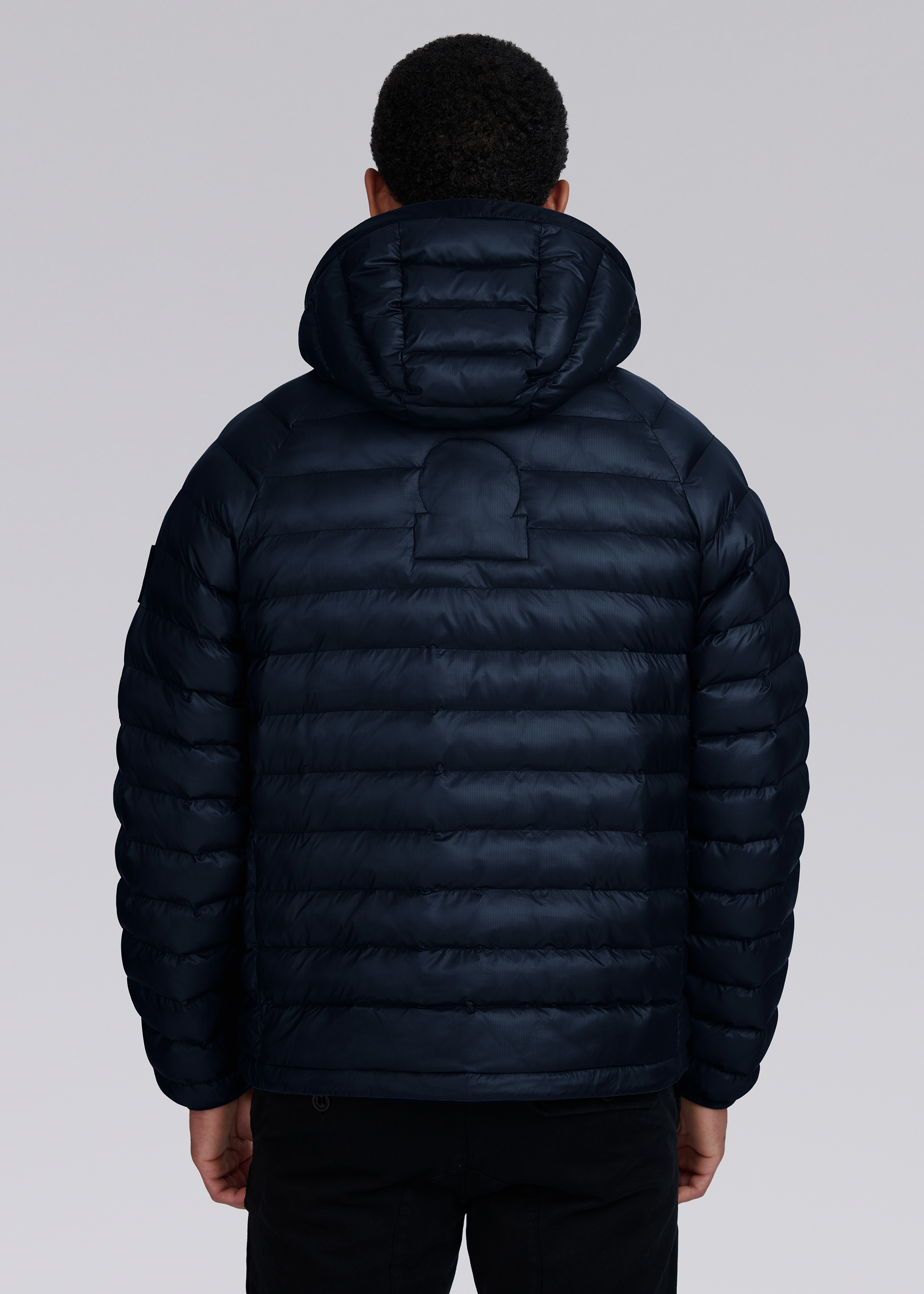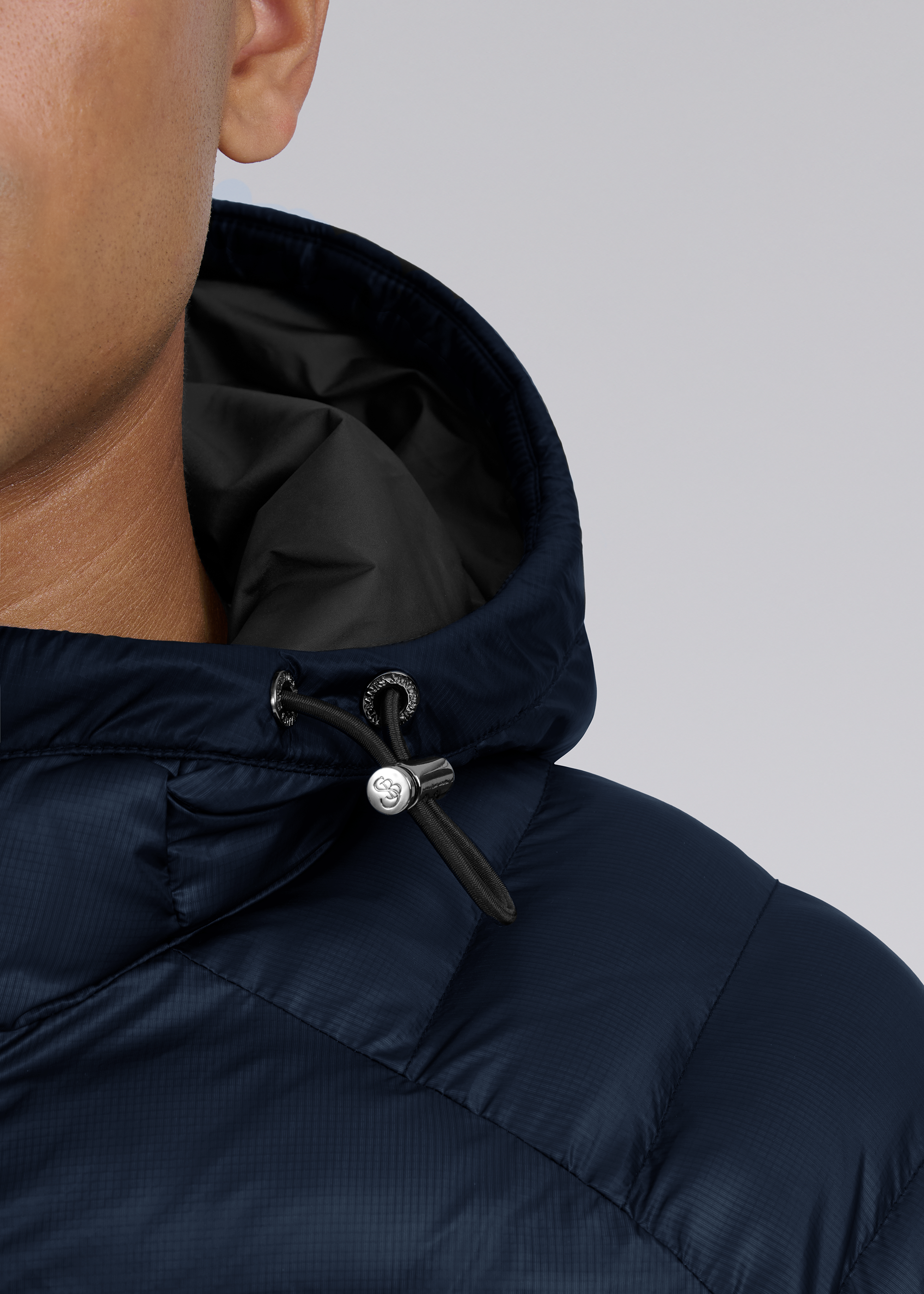 The Sandbanks Hooded Ripstop Micro Puffer Jacket in navy. A versatile outerwear piece, constructed from premium ripstop fabric with mixed-width baffles, delivers lightweight warmth in a classic silhouette. Features include raglan shoulders, an integrated hood with cord adjusters and zip pockets lined in Polartec® fleece to ensure comfort and protection.