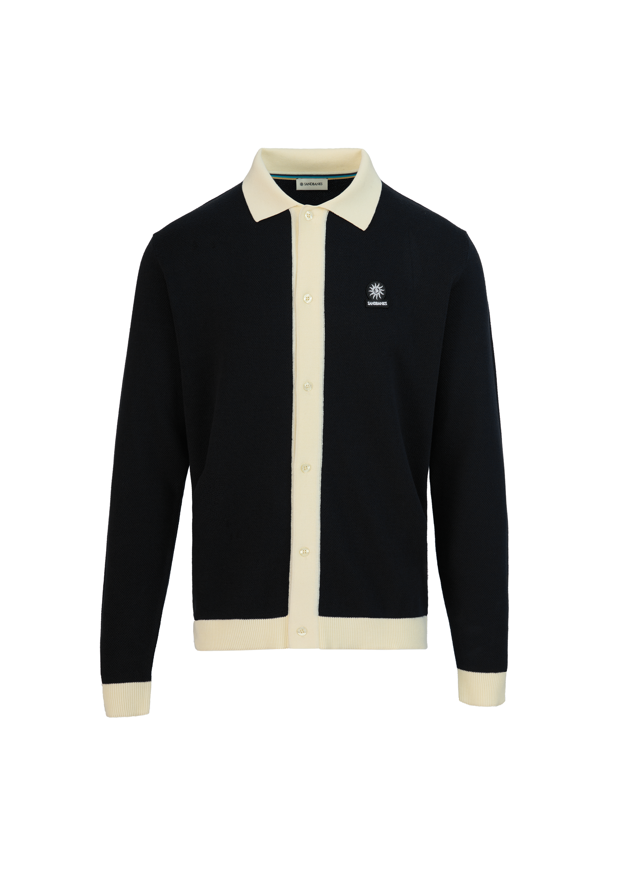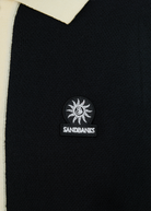 Sandbanks men’s fine gauge knitted long sleeve full button polo shirt in black, featuring a contrast ribbed collar, placket, cuffs, and hem. Crafted from 100% organic cotton, this lightweight knit offers a smooth, structured feel and a contemporary everyday look. Completed with a full button fastening and the signature Sandbanks embroidered chest badge.