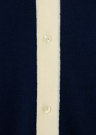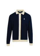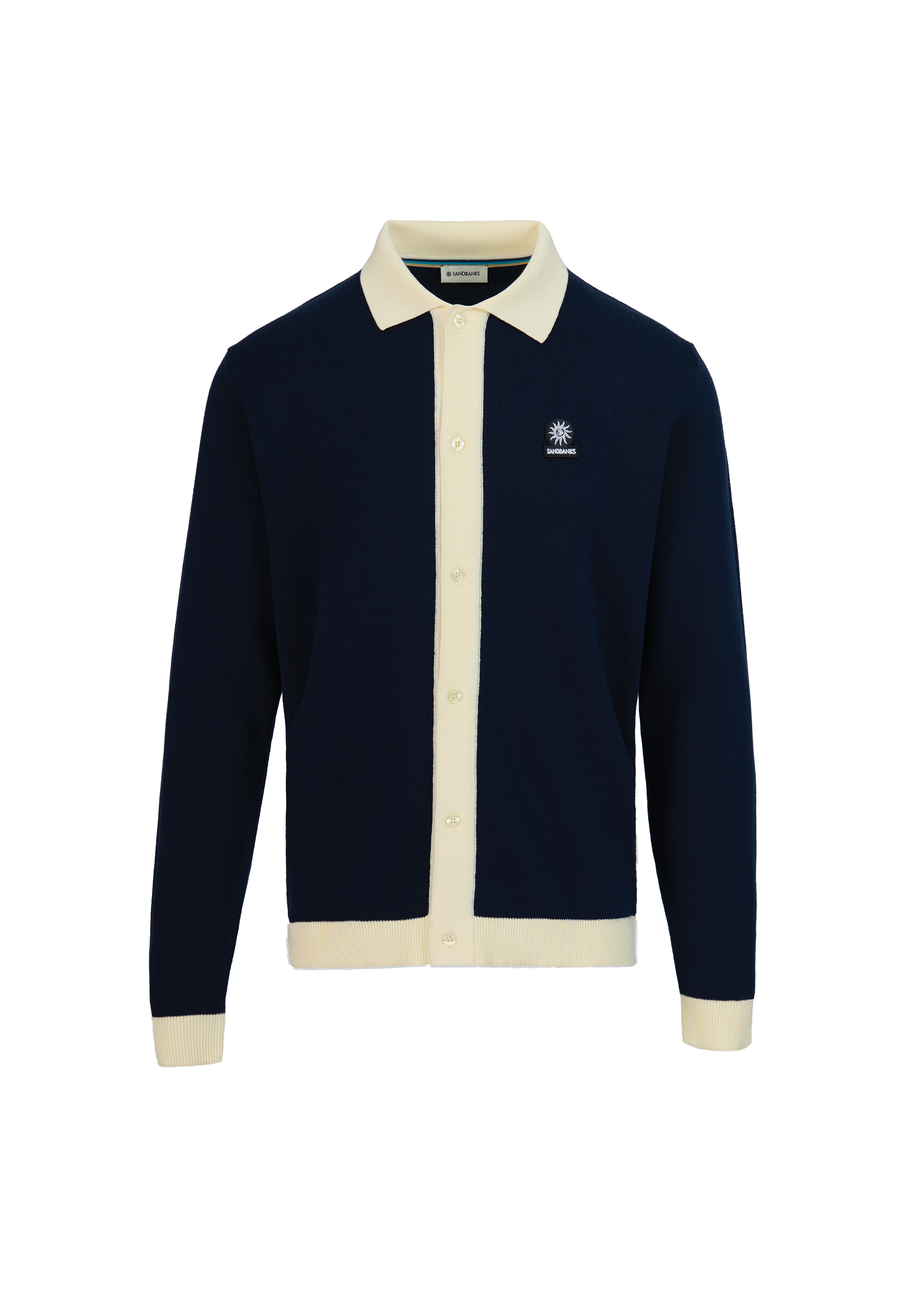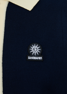 Sandbanks men’s fine gauge knitted long sleeve full button polo shirt in navy, featuring a contrast ribbed collar, placket, cuffs, and hem. Crafted from 100% organic cotton, this lightweight knit offers a smooth, structured feel and a contemporary everyday look. Completed with a full button fastening and the signature Sandbanks embroidered chest badge.