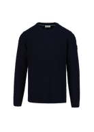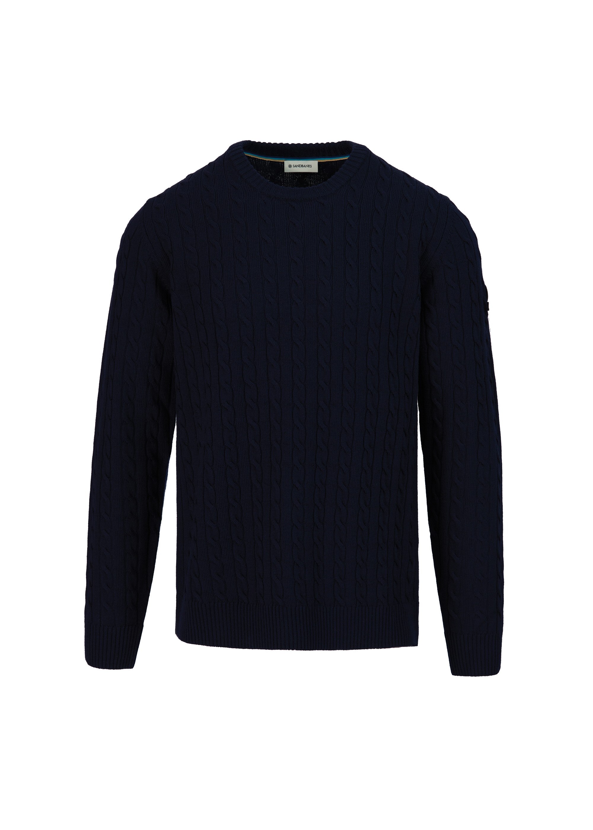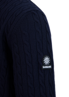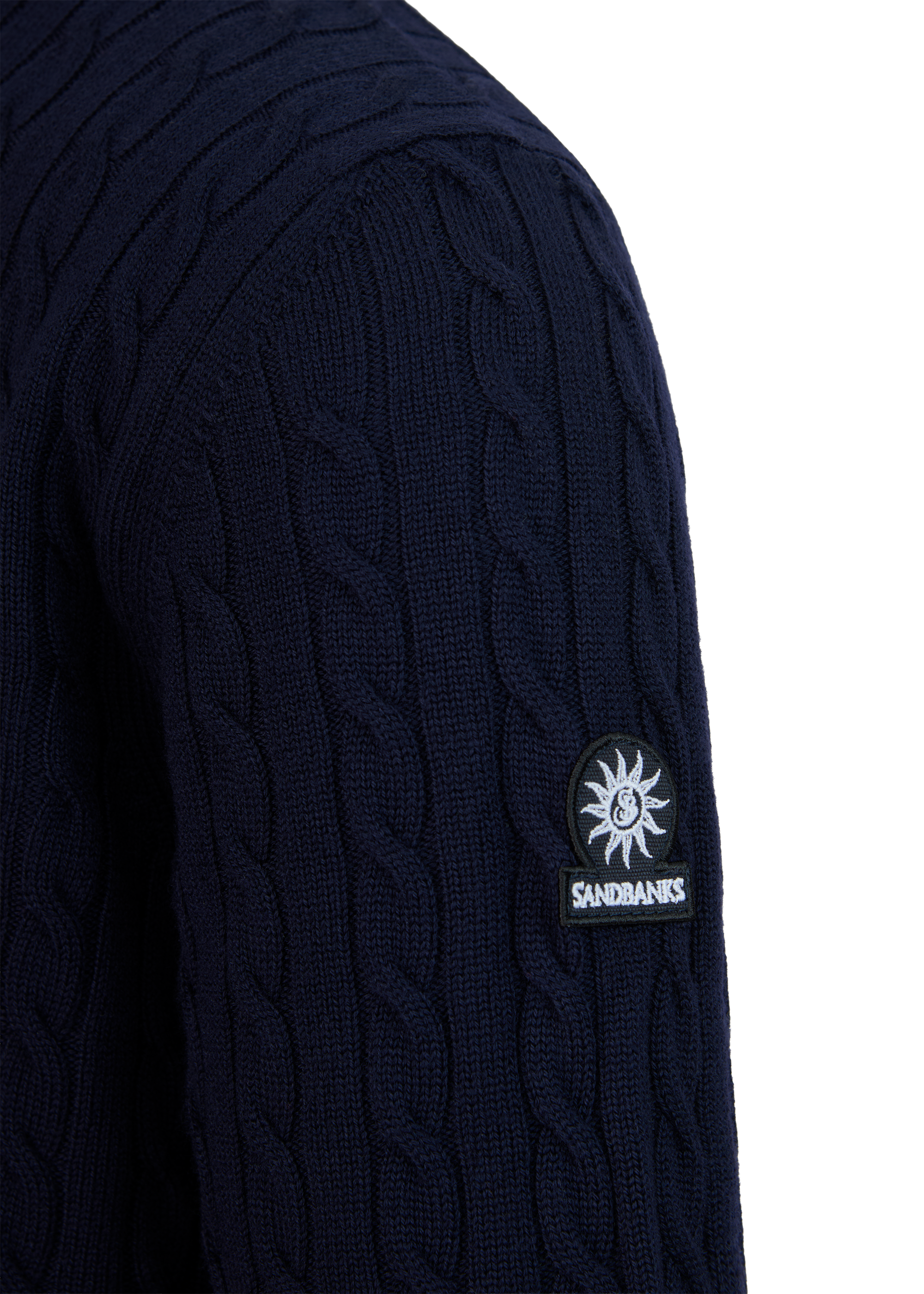 Sandbanks merino wool cable knit jumper in navy. This timeless long-sleeve jumper is crafted from durable 100% merino wool, offering exceptional softness and natural warmth through its classic cable knit design. Details include a tonal ribbed neckline, cuffs, and hem, complemented by the distinctive Sandbanks logo badge positioned on the sleeve.