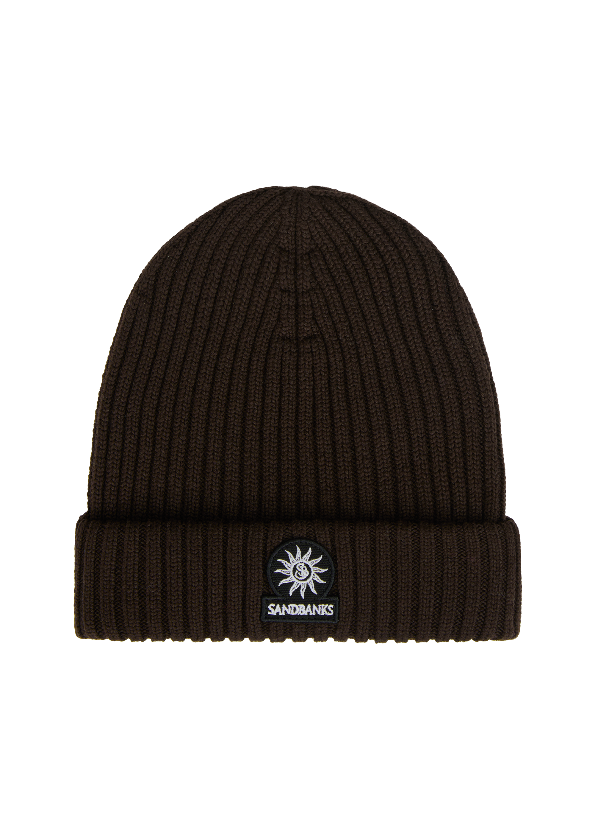 Sandbanks knitted badge logo beanie in brown, made from 100% Merino wool. Merino wool is known for its softness, warmth, and moisture-wicking properties, making it the perfect material for a comfortable and functional beanie.