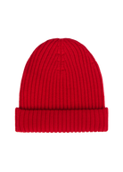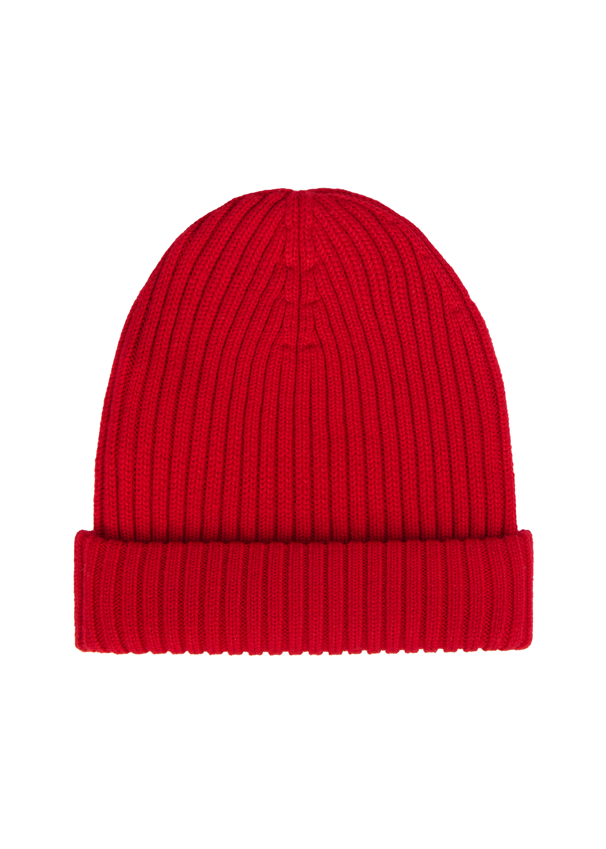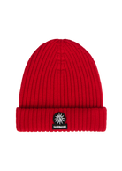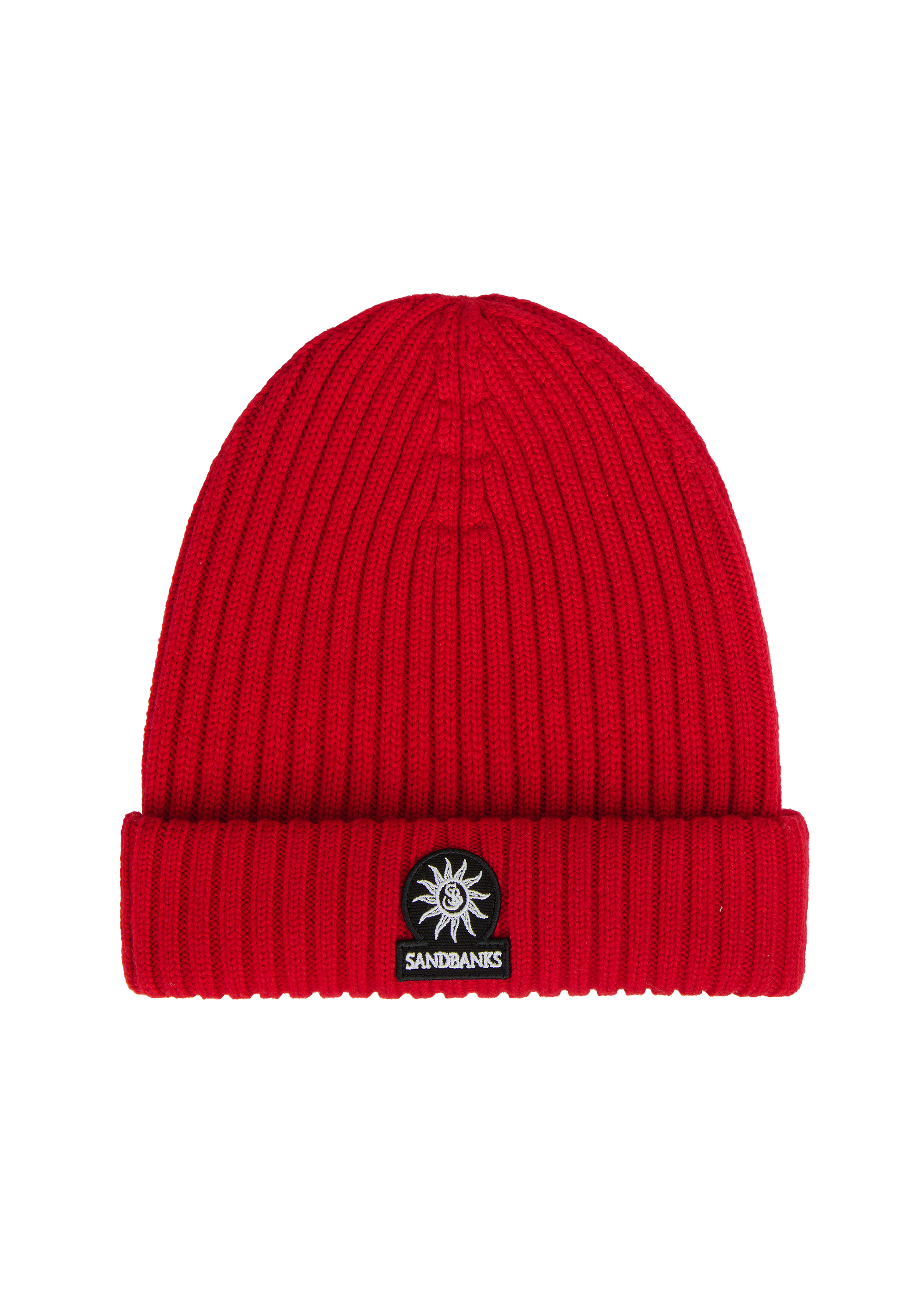 Sandbanks knitted badge logo beanie in red, made from 100% Merino wool. Merino wool is known for its softness, warmth, and moisture-wicking properties, making it the perfect material for a comfortable and functional beanie.