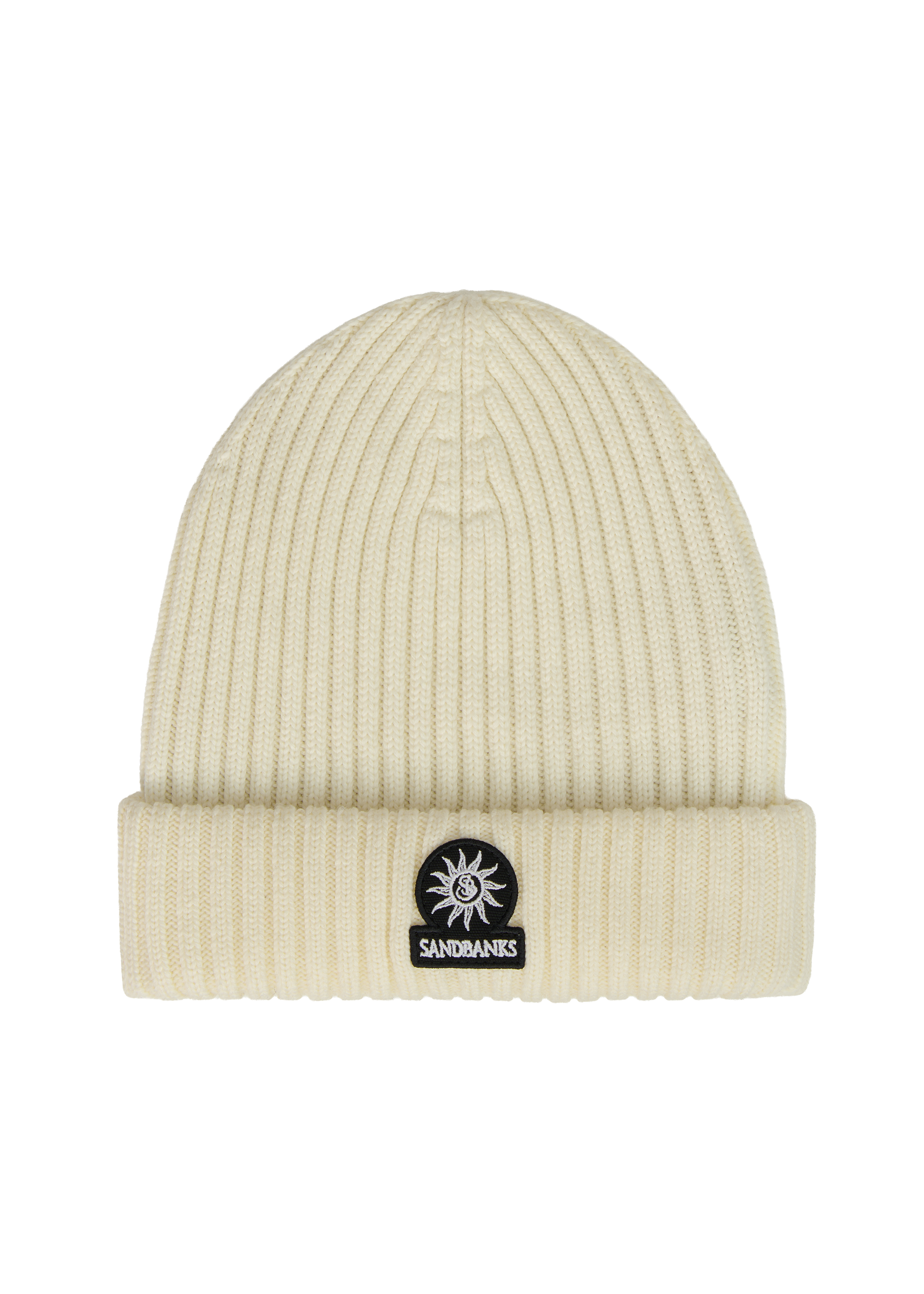 Sandbanks knitted badge logo beanie in stone, made from 100% Merino wool . Merino wool is known for its softness, warmth, and moisture-wicking properties, making it the perfect material for a comfortable and functional beanie.