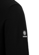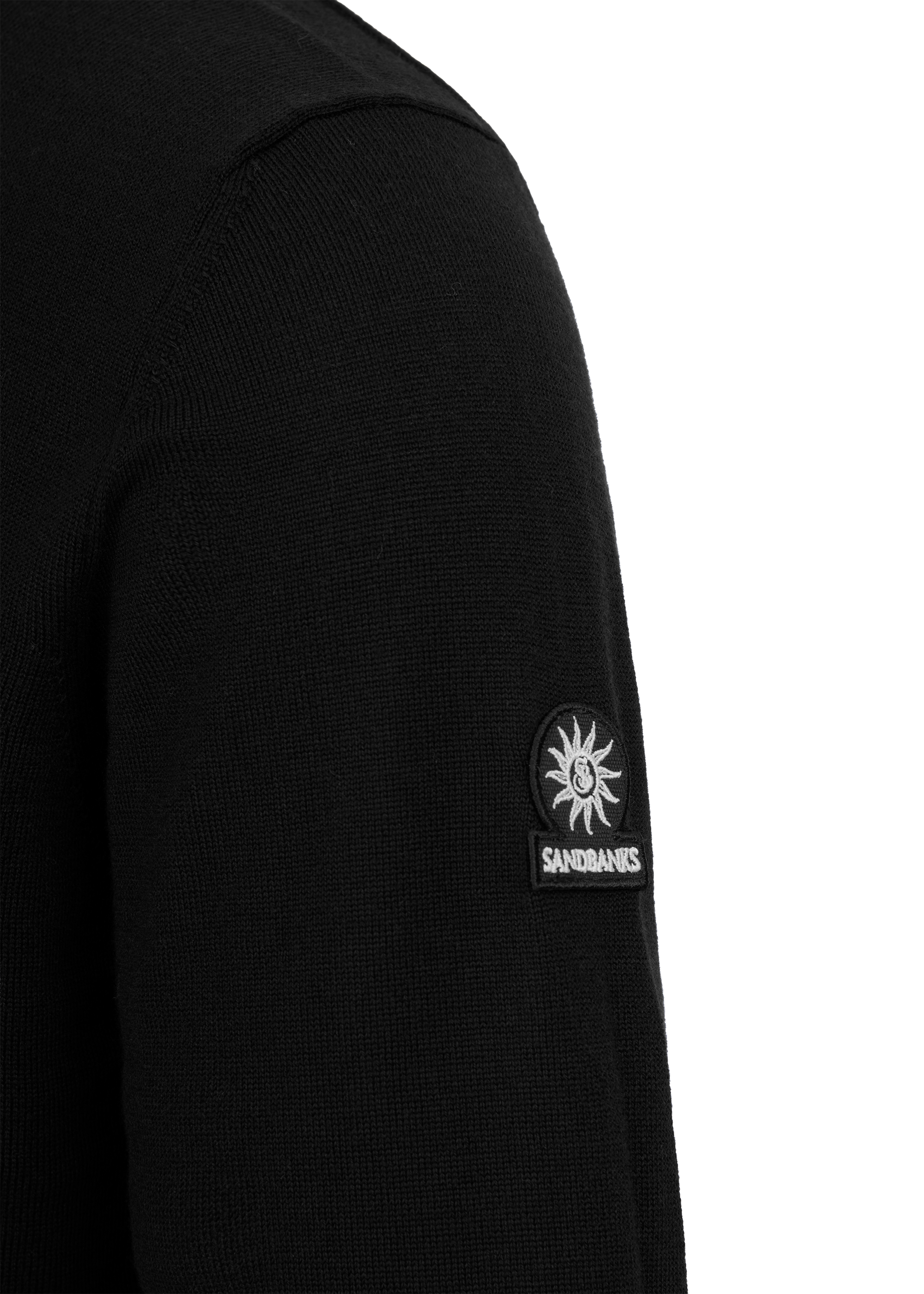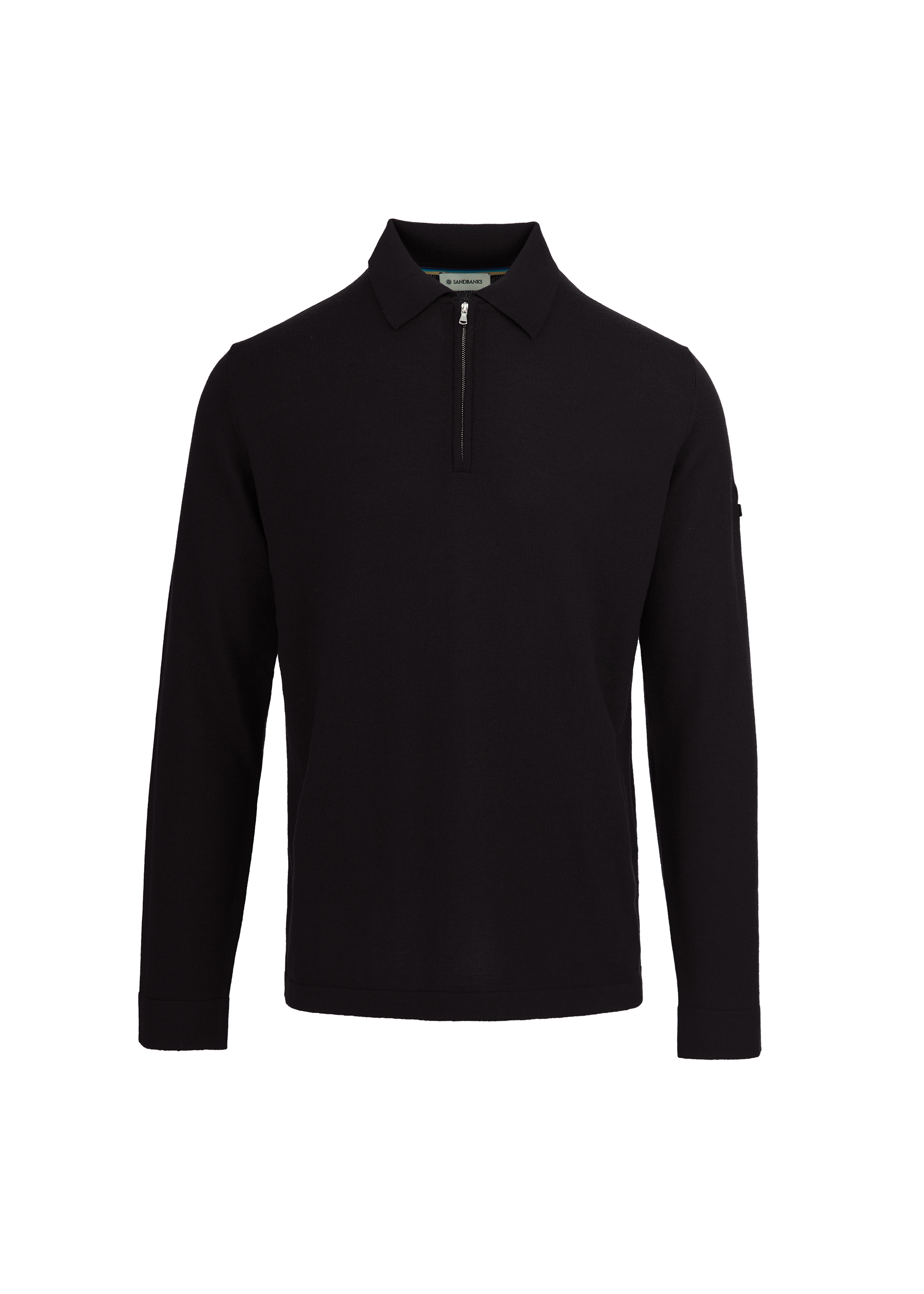 Sandbanks merino wool zip polo shirt in black. This long-sleeved polo shirt is crafted from 100% fine-knit Italian merino wool, offering exceptional warmth and comfort. Features include a silver Lampo zip with an engraved logo puller, fine knit hems and cuffs and the signature Sandbanks embroidered badge.