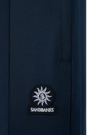 Sandbanks pleated tricot track pant in navy. Relaxed track pants crafted from smooth 360 GSM tricot fabric. Detailed with front and rear pleats, elasticated waist band with internal drawstring, signature embroidered badge, concealed zip side entry pockets and branded metal side zips at the hem. Designed to pair with the matching track jacket.