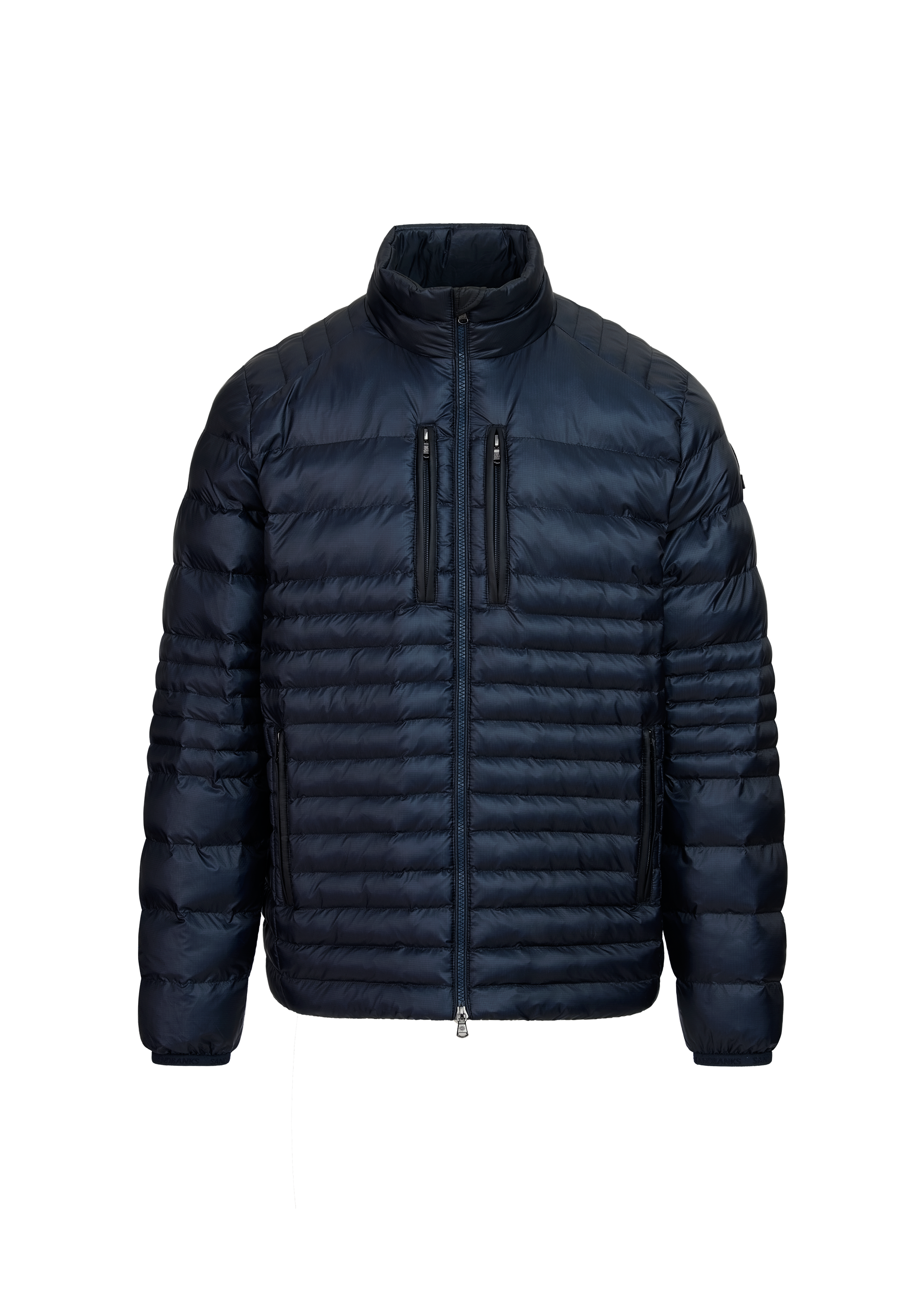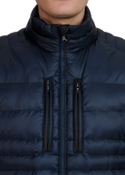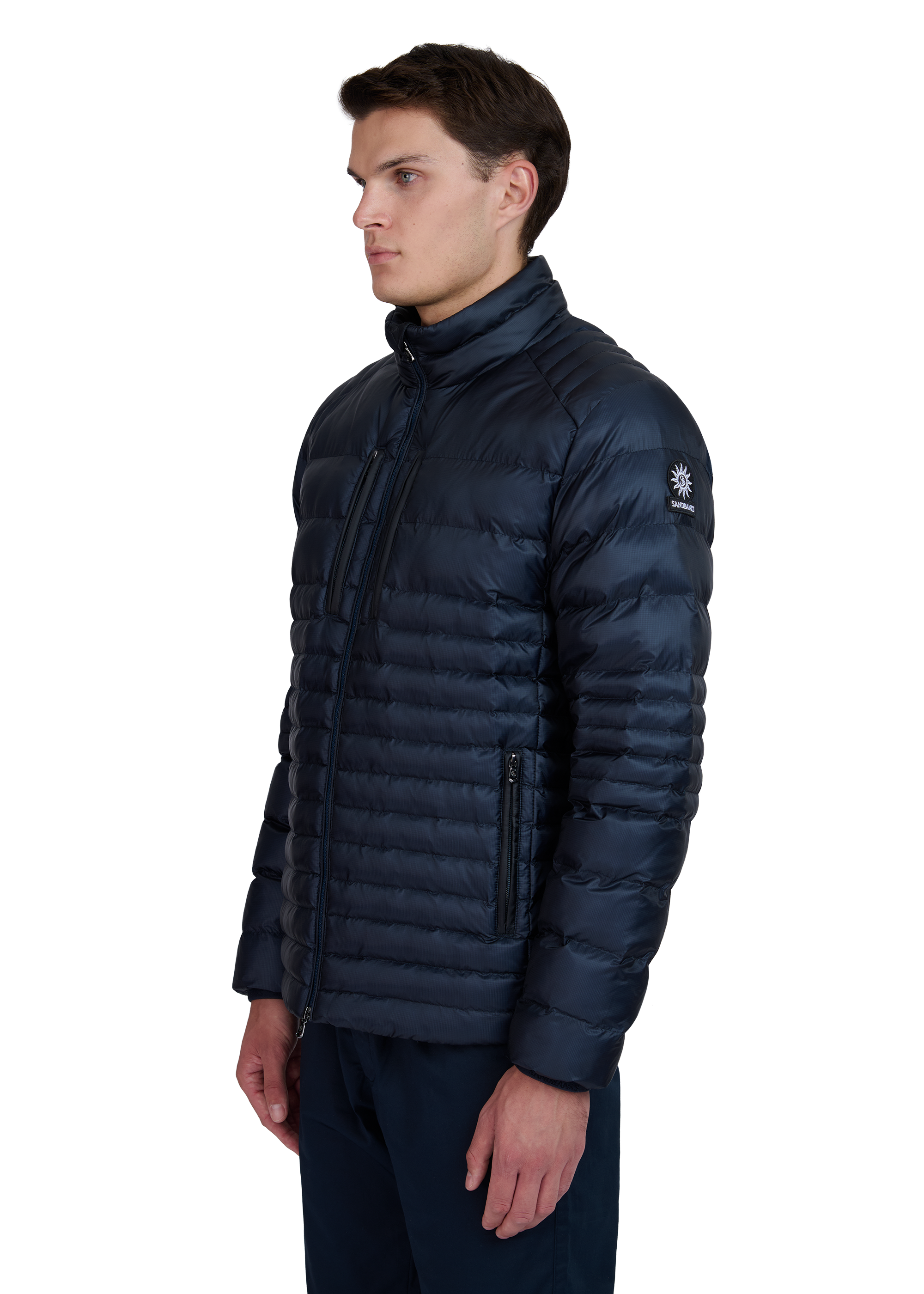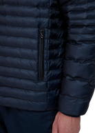 The Sandbanks Ripstop Micro Puffer Jacket in navy is constructed from premium ripstop fabric with mixed-width baffles, delivering lightweight warmth in a slim silhouette. Features include a quilted funnel neck collar with a concealed wind placket, and zip pockets lined in Polartec® fleece for comfort and protection.