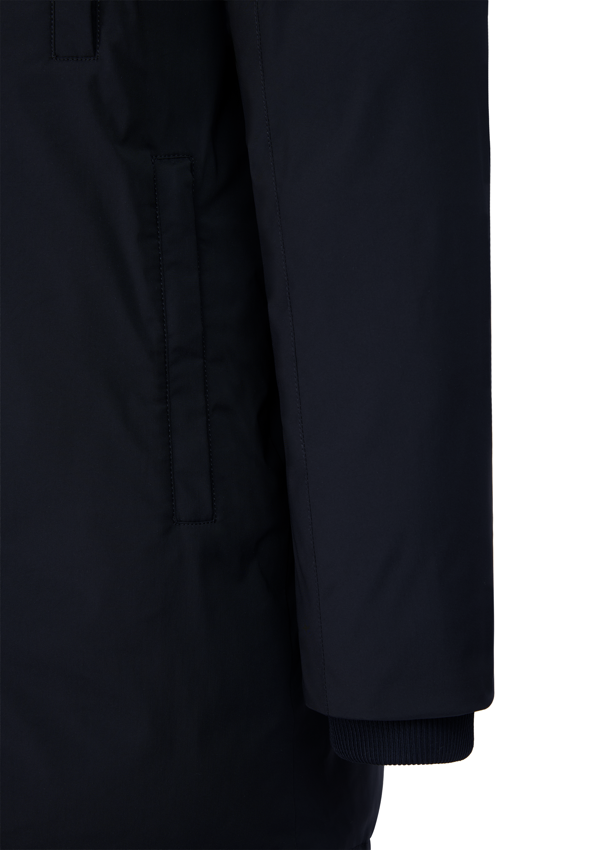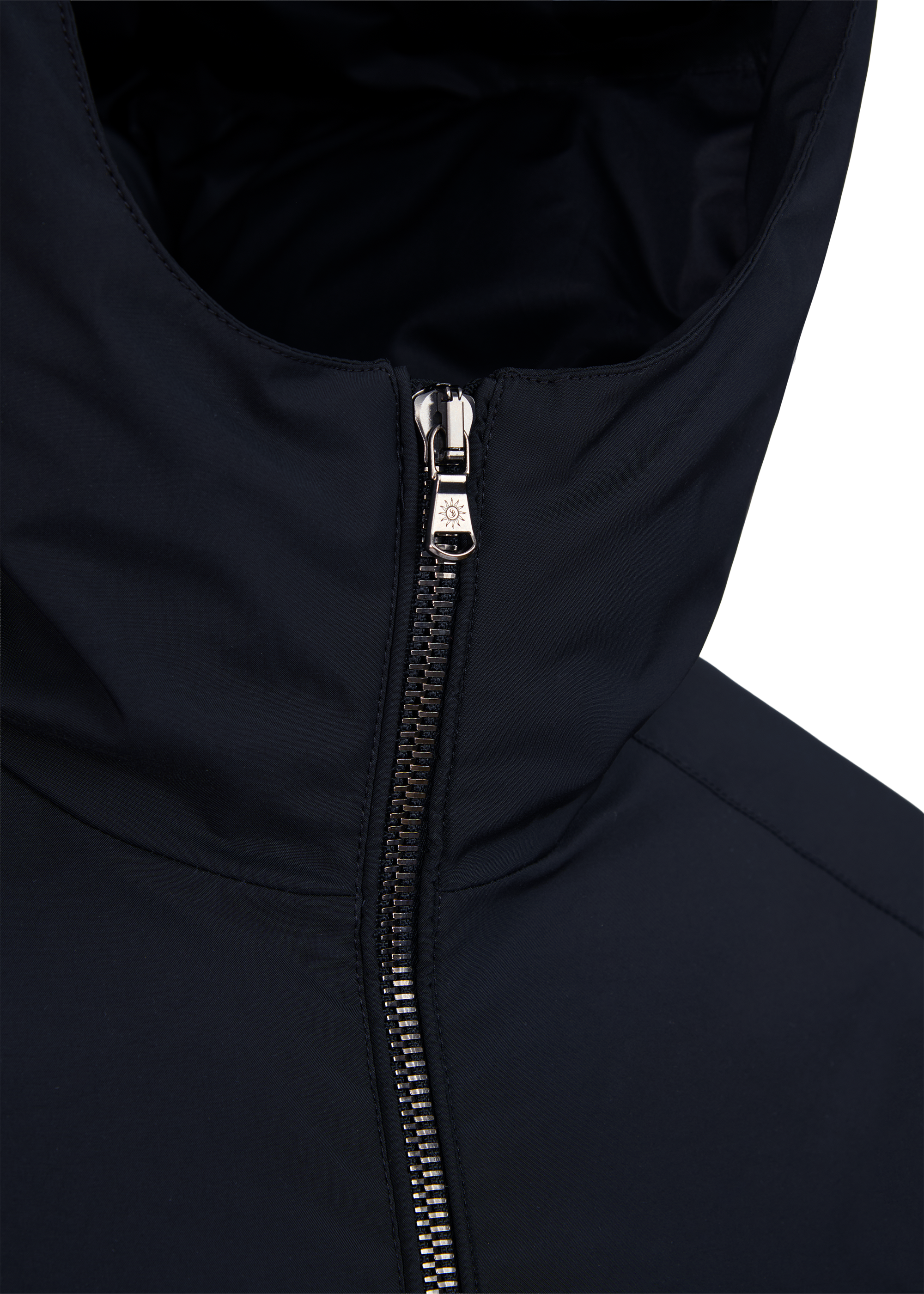 The Sandbanks Canford Terrace Jacket is engineered for performance and comfort in changing conditions. Crafted from a water-resistant shell, it offers protection from light rain and wind while remaining lightweight and easy to layer. The design features an A-line silhouette, two-way metal Lampo zip with metal pullers a high collar with a concealed hood adjuster for added coverage. Eco-down insulation ensures warmth with minimal weight, while the versatile 4 front zip pockets benefit from fleece lining to provide extra comfort. Finished with engraved metal components and an embroidered Sandbanks sleeve badge.