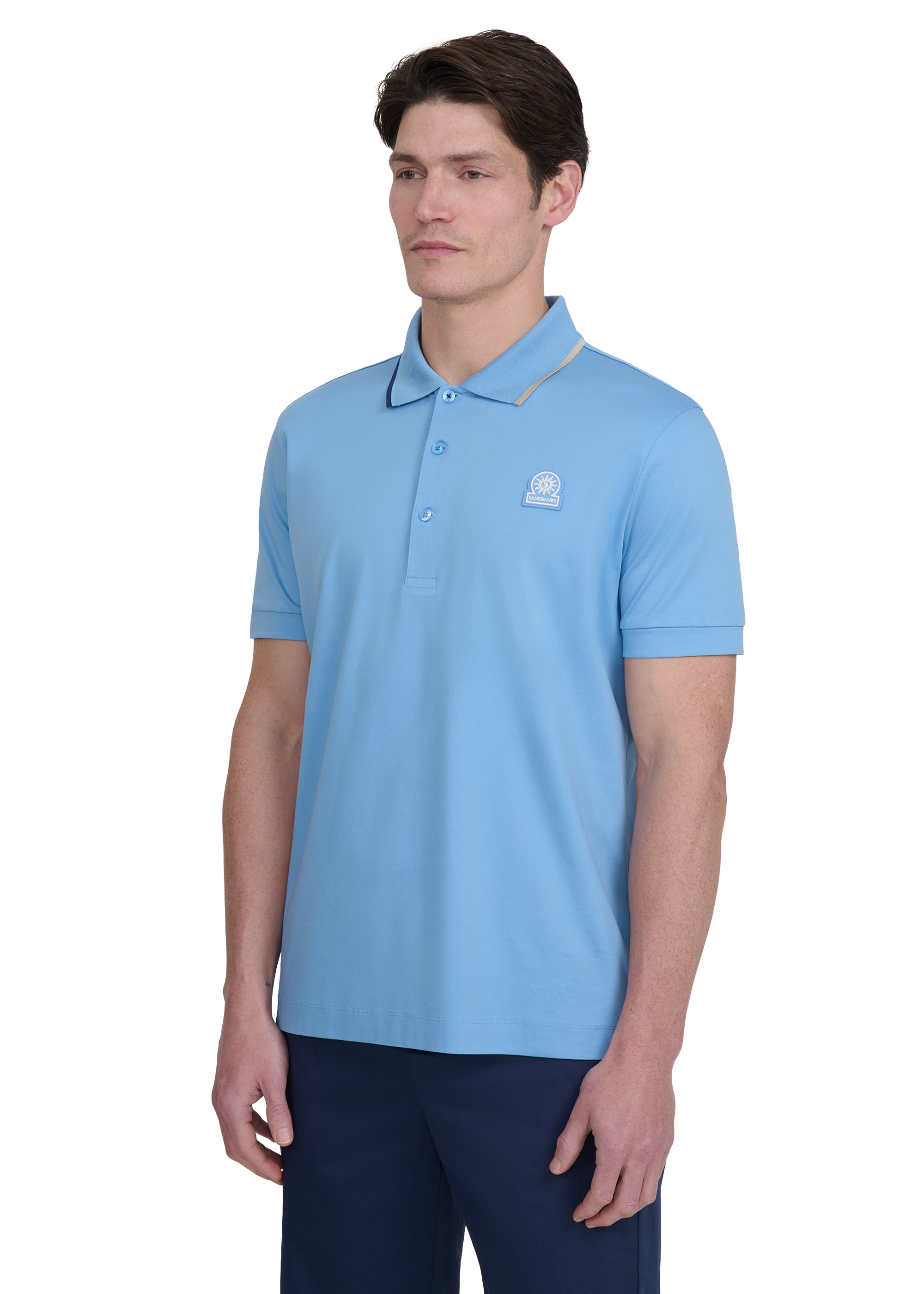 Crafted from 100% BCI mercerised cotton, our men’s Sandbanks tri-colour tipped polo shirt in dusty blue offers a timeless design. The mercerisation process refines the cotton fibres, enhancing colour depth and softness while giving the fabric a subtle, silk-like sheen. Cut in a classic fit, it features a three-button placket and a distinctive tri-colour collar. It’s finished with Sandbanks-engraved buttons and a rubberised logo badge on the chest.
