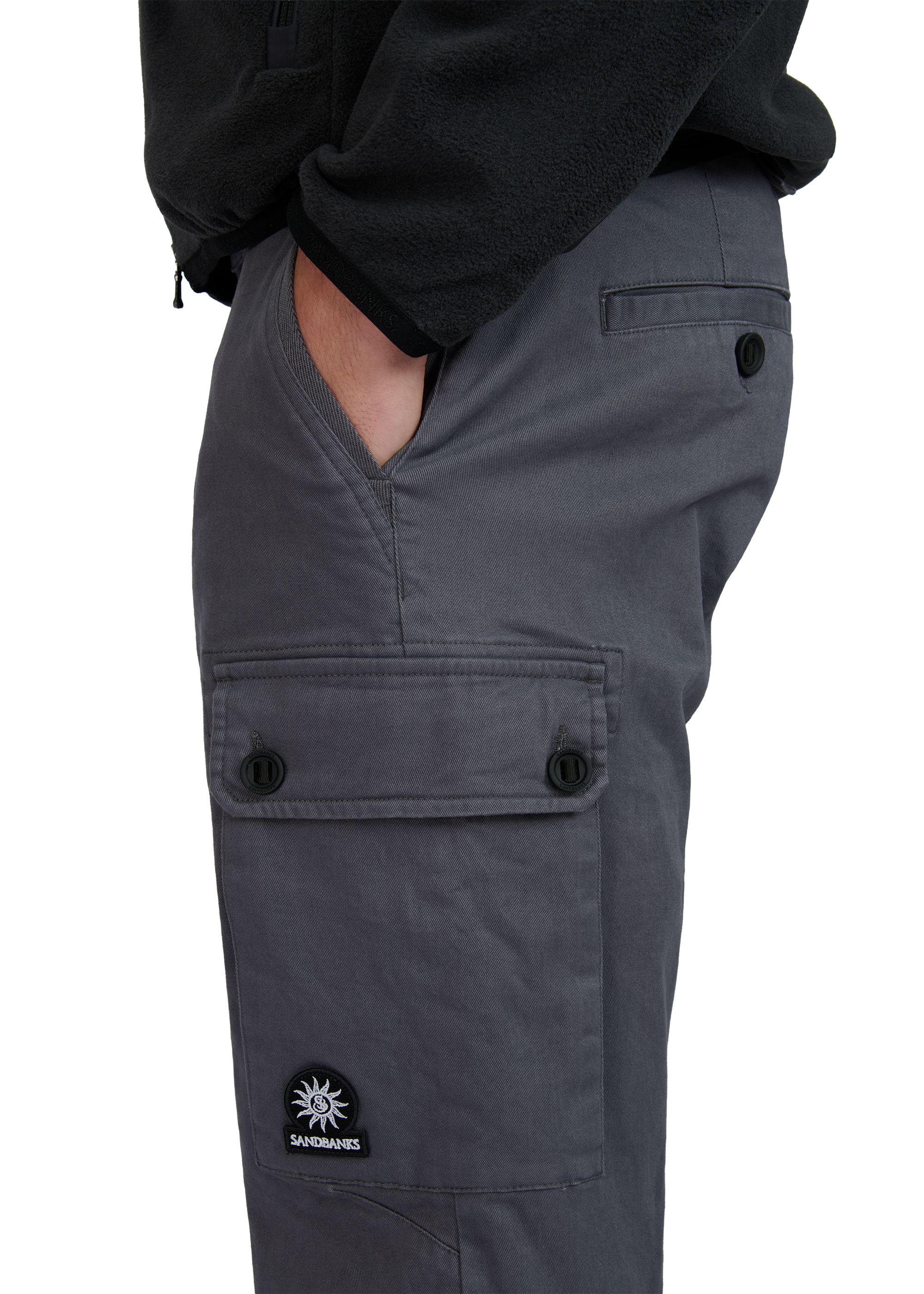Made from organic stretch cotton with a robust 290 GSM. Detailing includes multiple utility cargo pockets with secure fastenings, branded buttons and a Sandbanks embroidered badge.