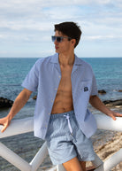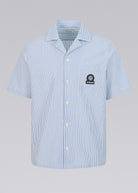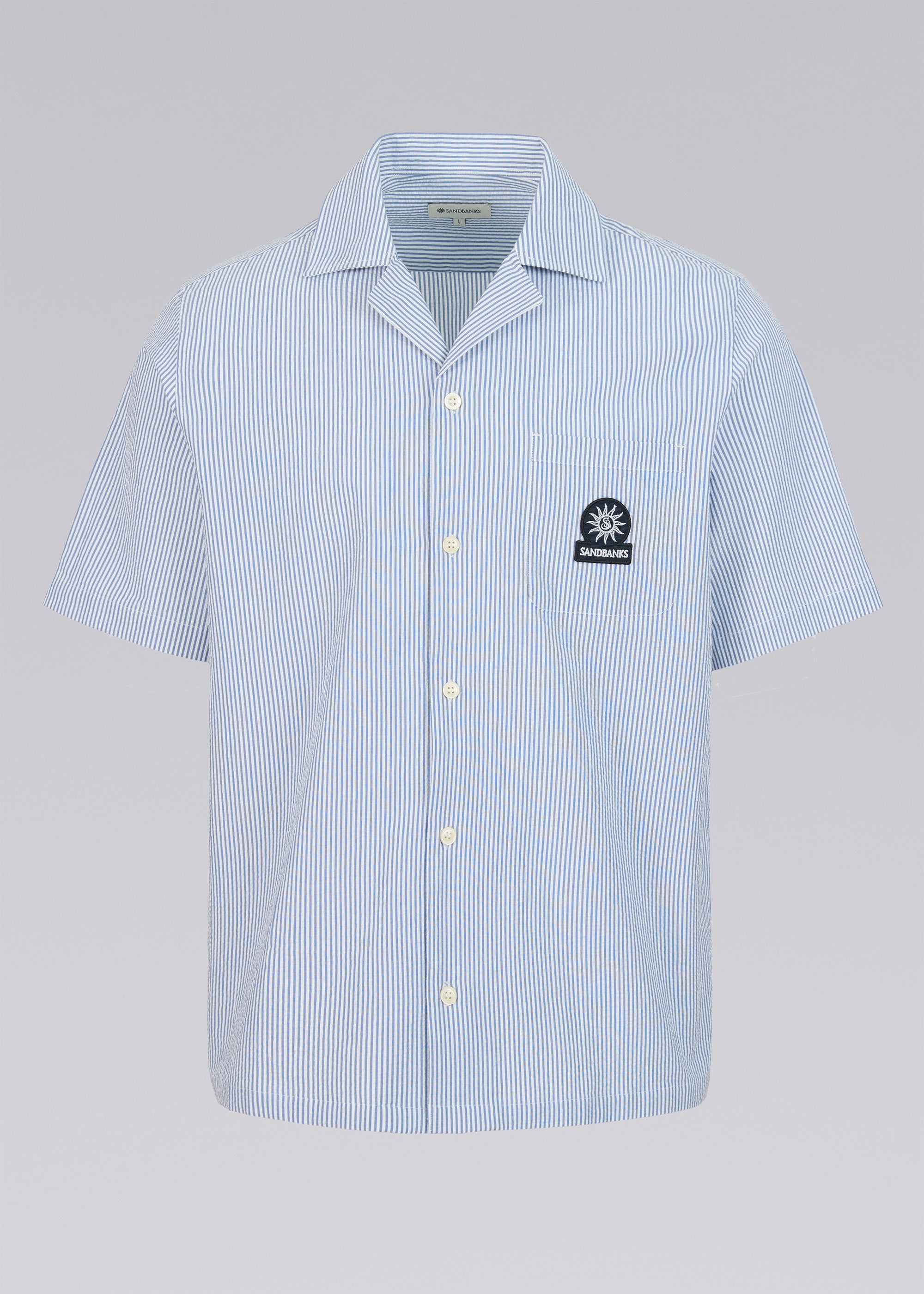 Sandbanks striped seersucker resort shirt in a fine navy and white stripe design. The shirt features a sophisticated revere collar, embroidered badge logo and breathable fabric.