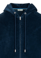 The Sandbanks Towelling Zip Hoodie in Navy is crafted from 100% BCI Cotton velour fabric. This sophisticated men's hoodie features a two-way zip with custom engraved pullers, complemented by engraved eyelets and cord ends. The ribbed cuff and hem are detailed with white and crystal blue contrast stripes for a refined finish.