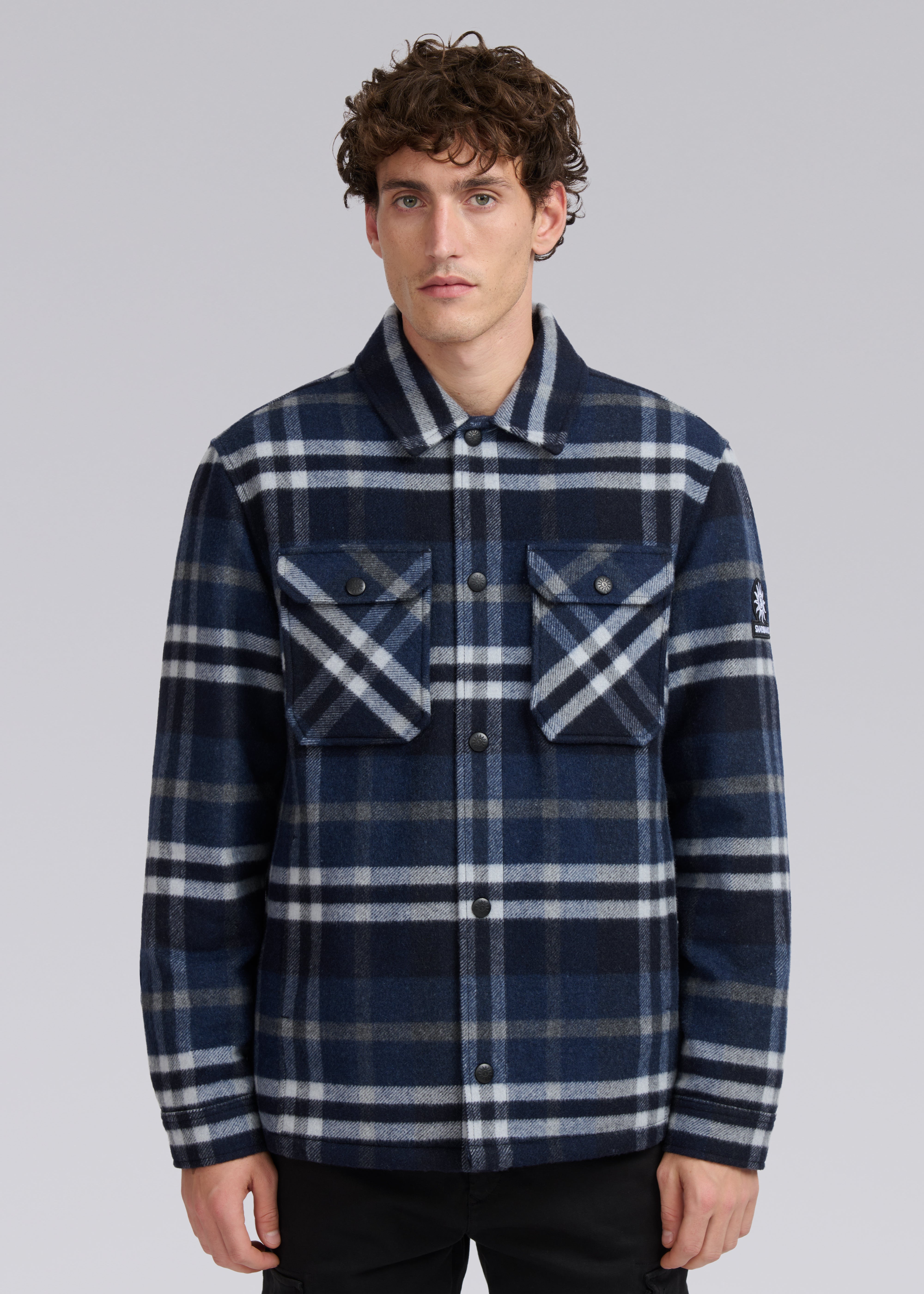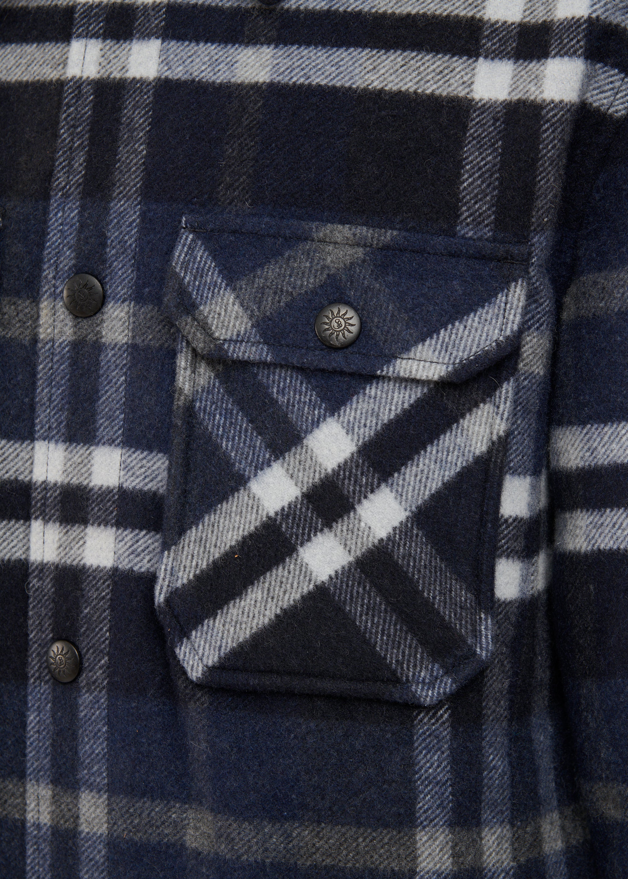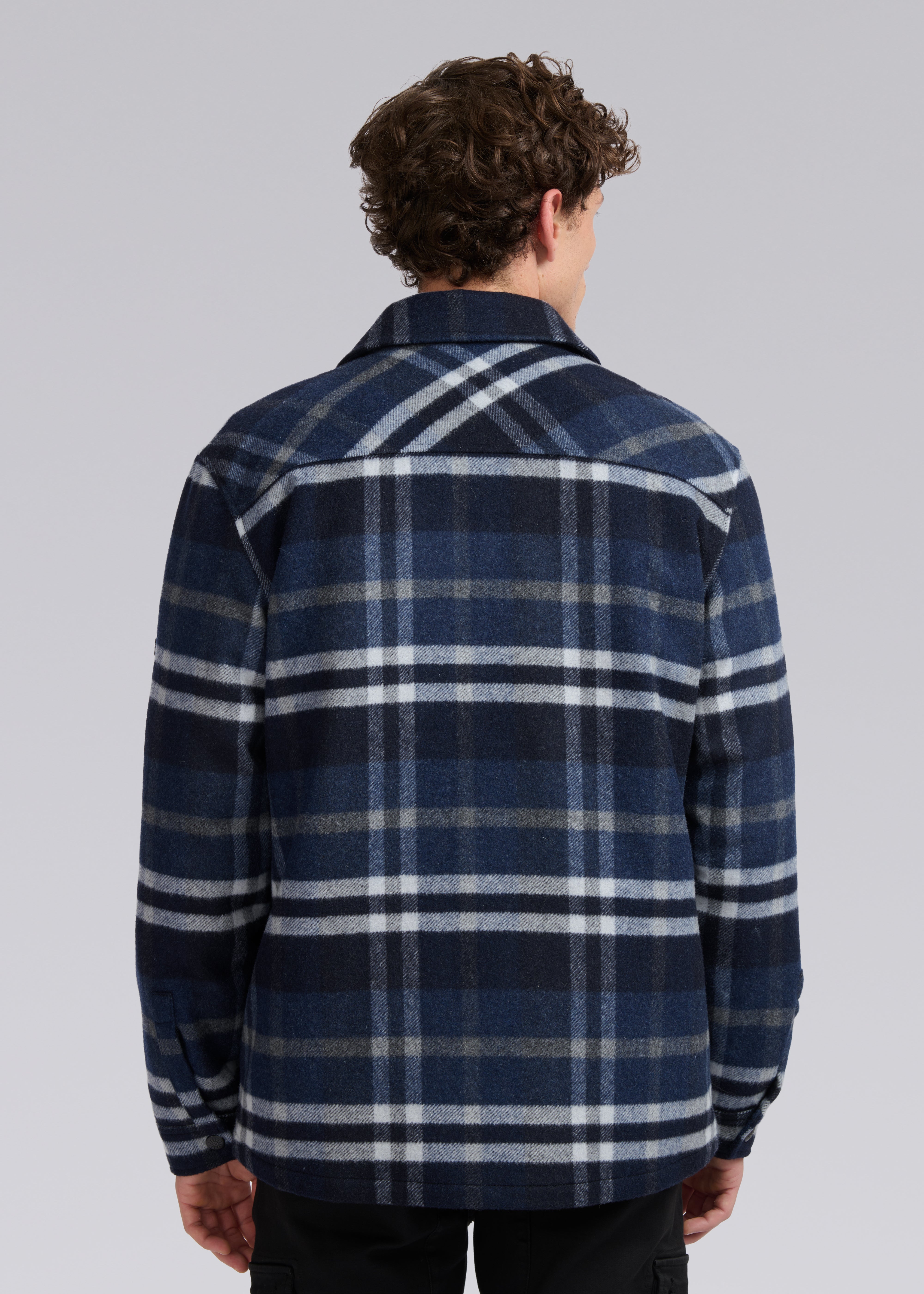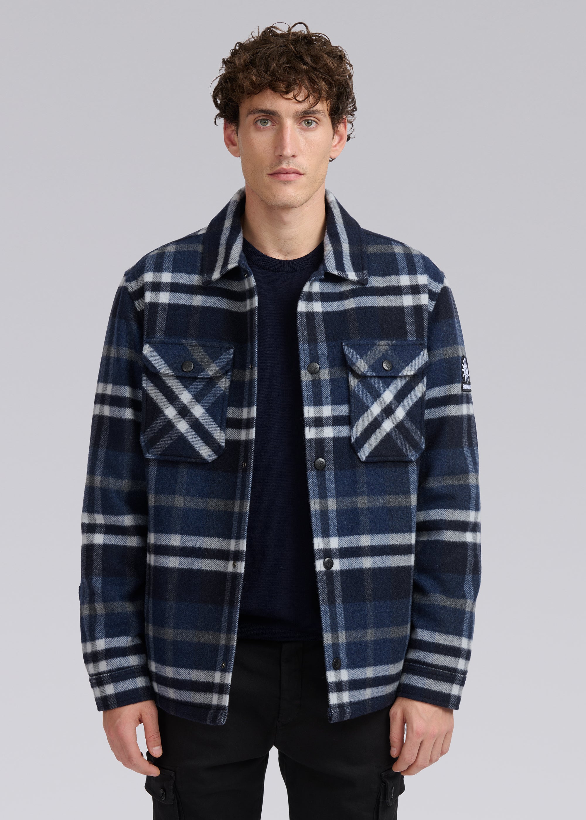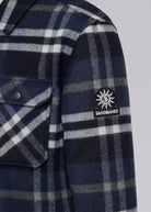 The Sandbanks Badbury check quilted overshirt in navy. Crafted from a premium Italian wool blend fabric, it boasts a soft and opulent handle that will keep you warm for the season. This quilted jacket features black branded popper close buttons, 2 chest pockets with snap closure, 2 side pockets with invisible snaps and a Sandbanks embroidered badge logo.
