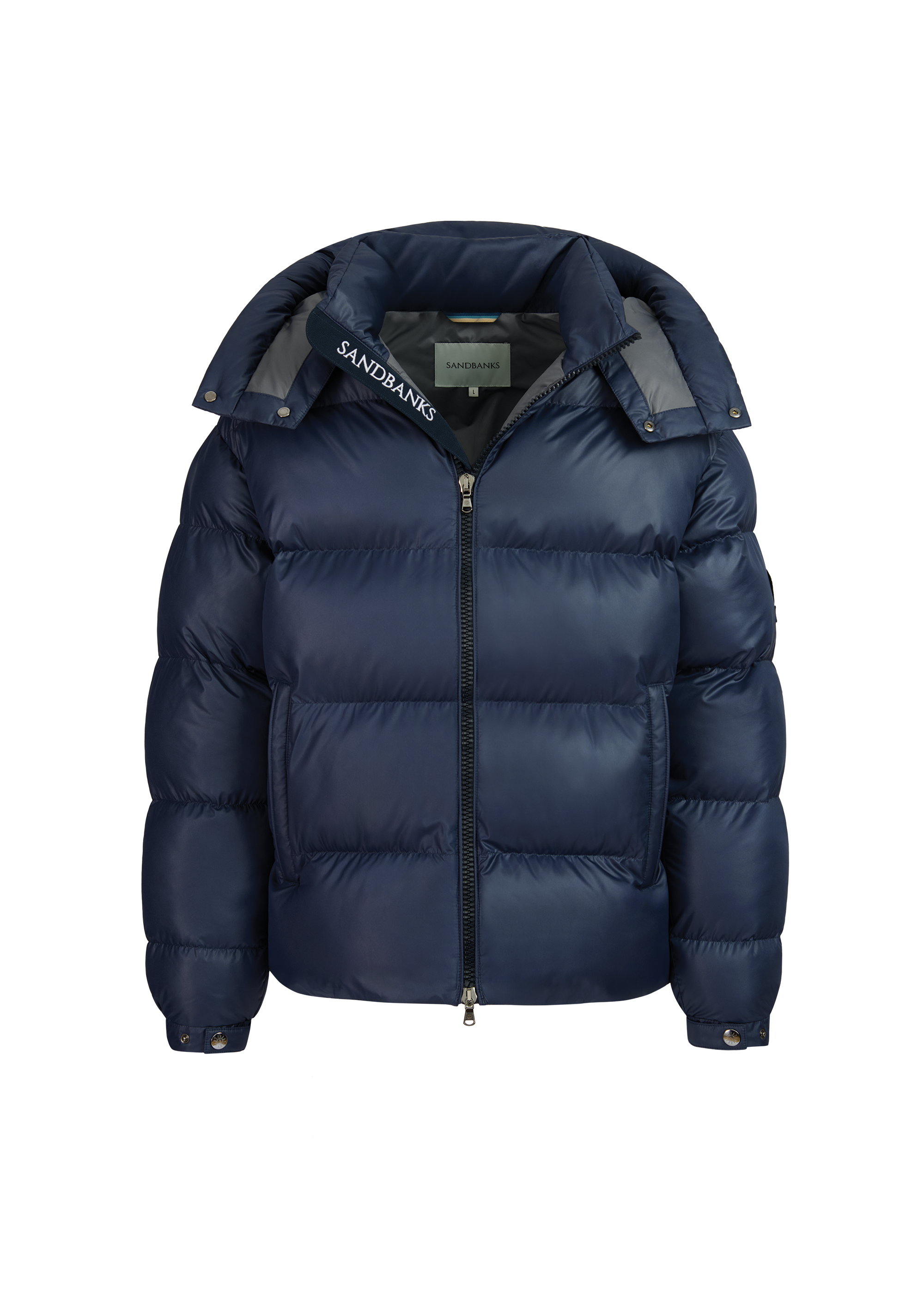 The Horizon Puffer Jacket blends craftsmanship with sustainable design, insulated with Ecodown for advanced thermal performance. Its navy shell delivers an understated finish, detailed with a Lampo two-way gunmetal zip, detachable hood with popper fastenings, and a Sandbanks embroidered sleeve badge.