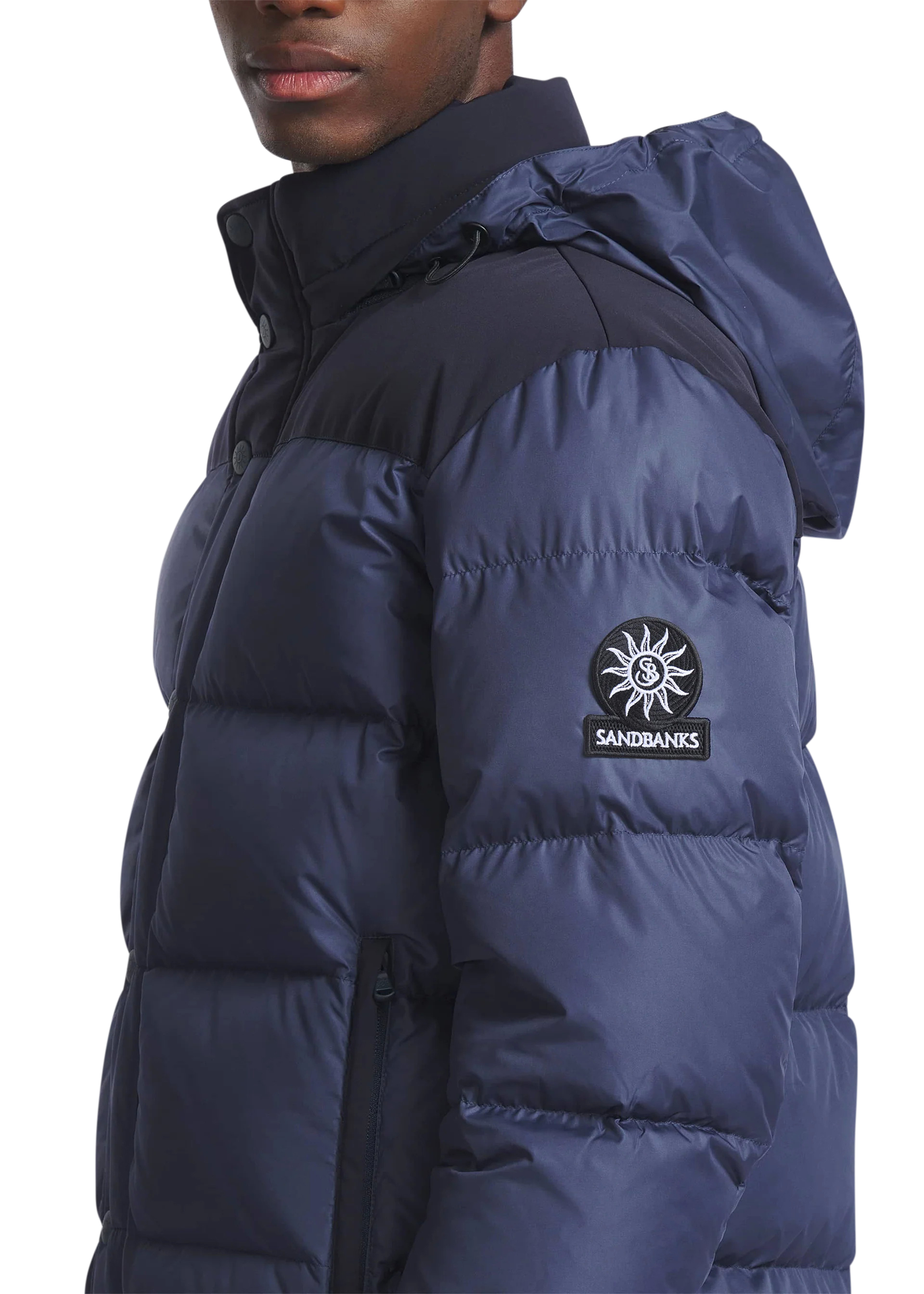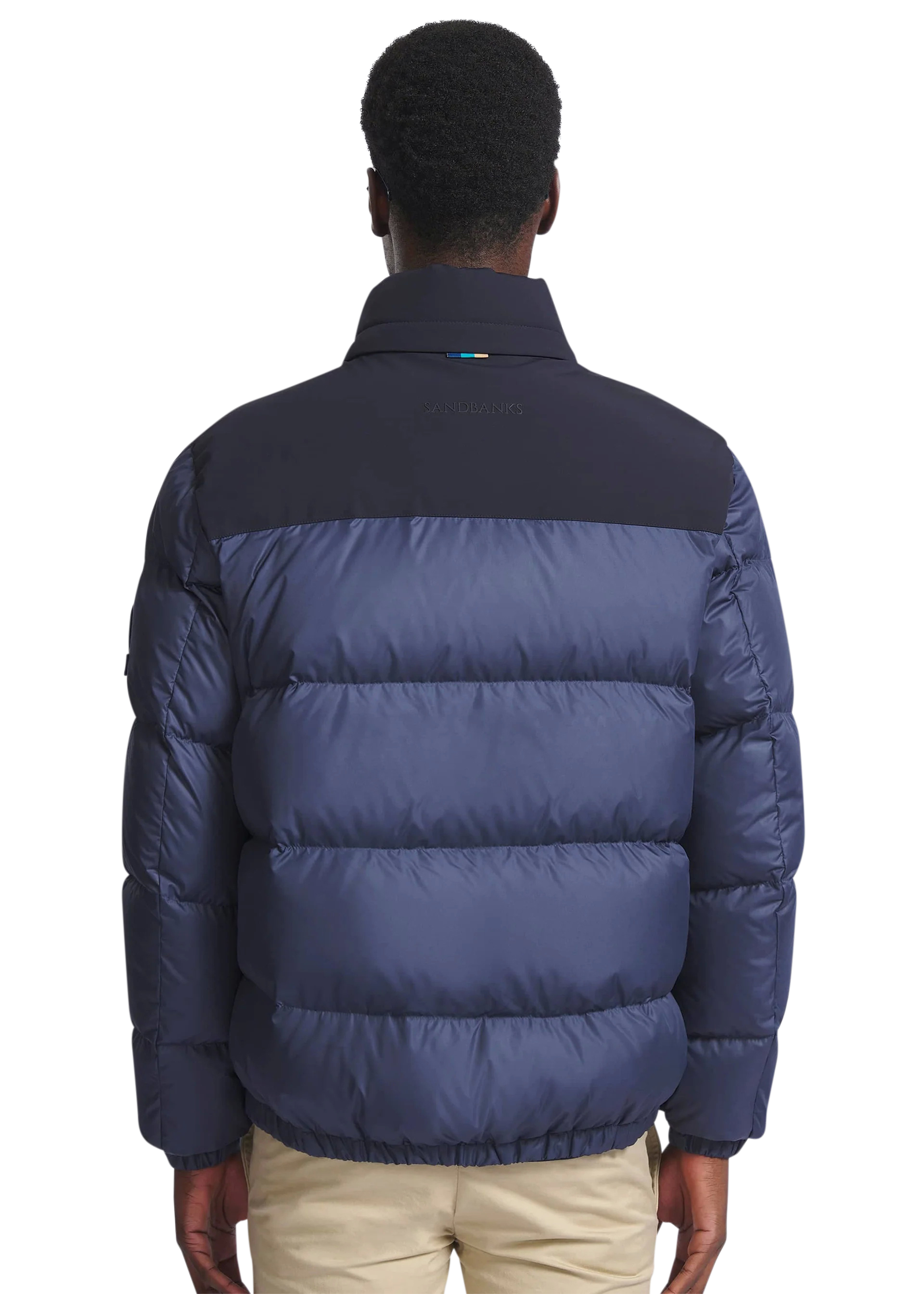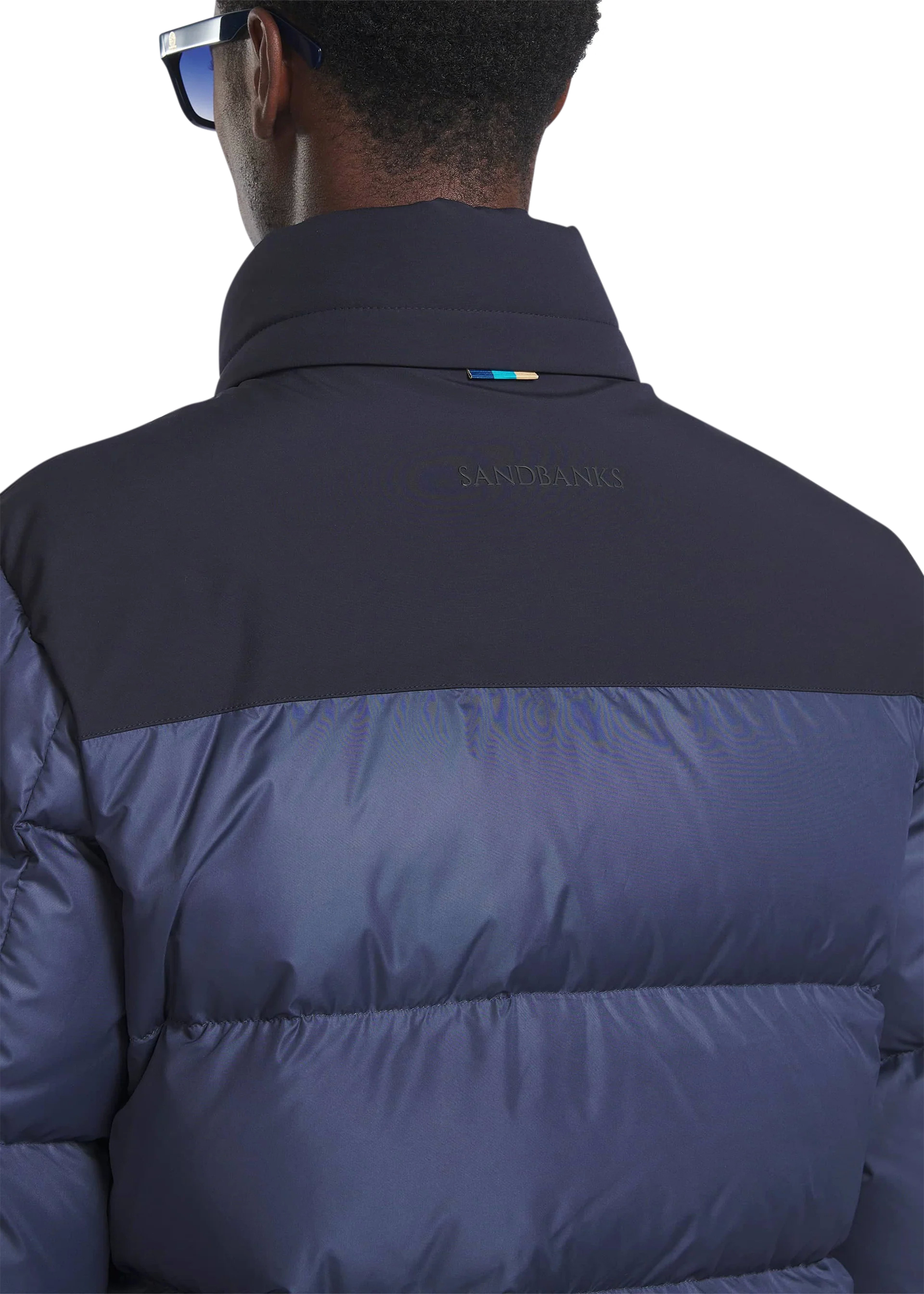 Online exclusive - the Sandbanks Peninsula puffer jacket in navy. This light weight Sandbanks puffer jacket features a felt and embroidered logo badge, tonal rubberised buttons, Lampo 2-way zip with rubberised pullers, contrast shoulder/collar, Sandbanks rear logo details and zip out hood.