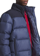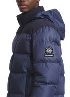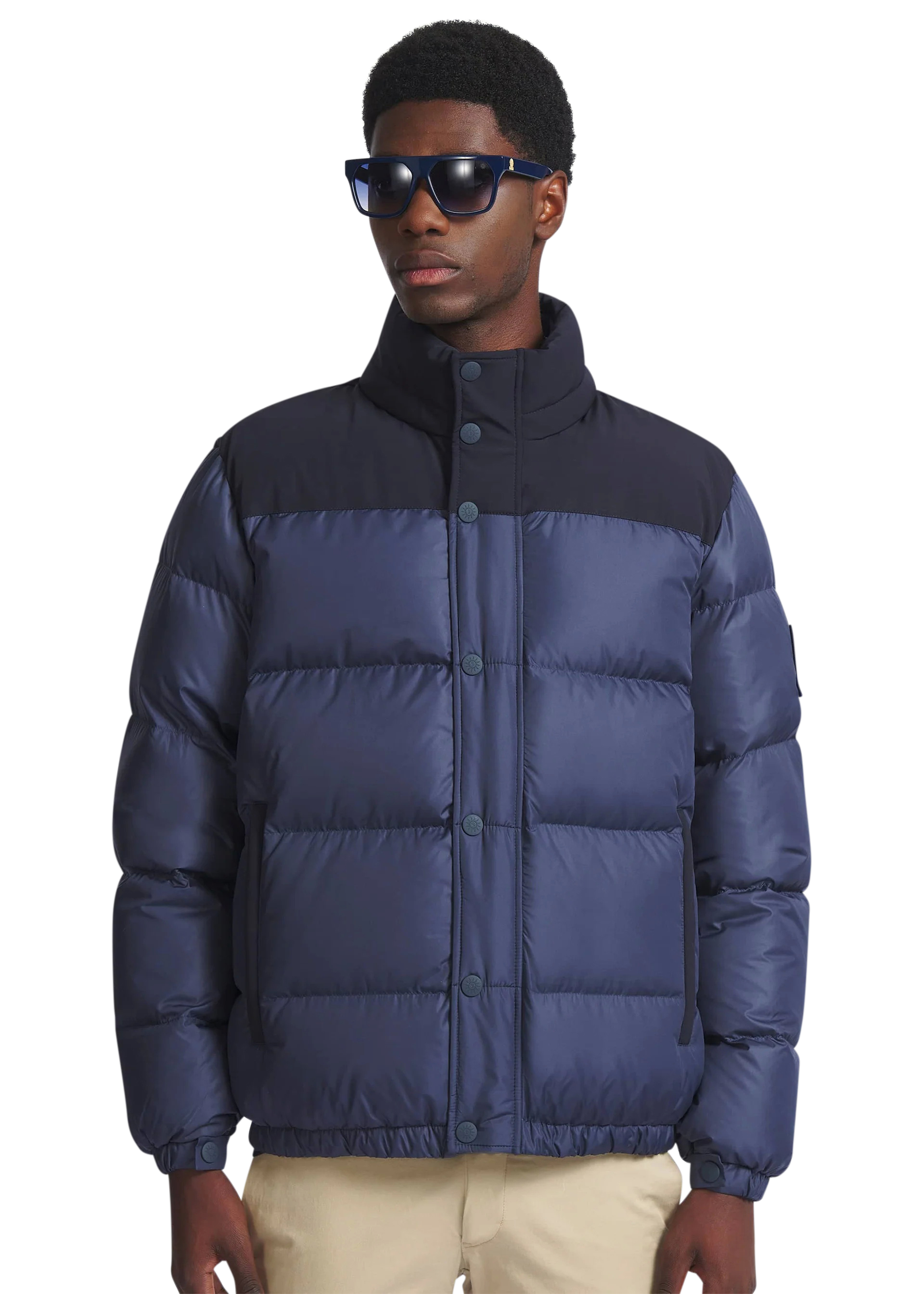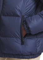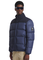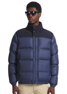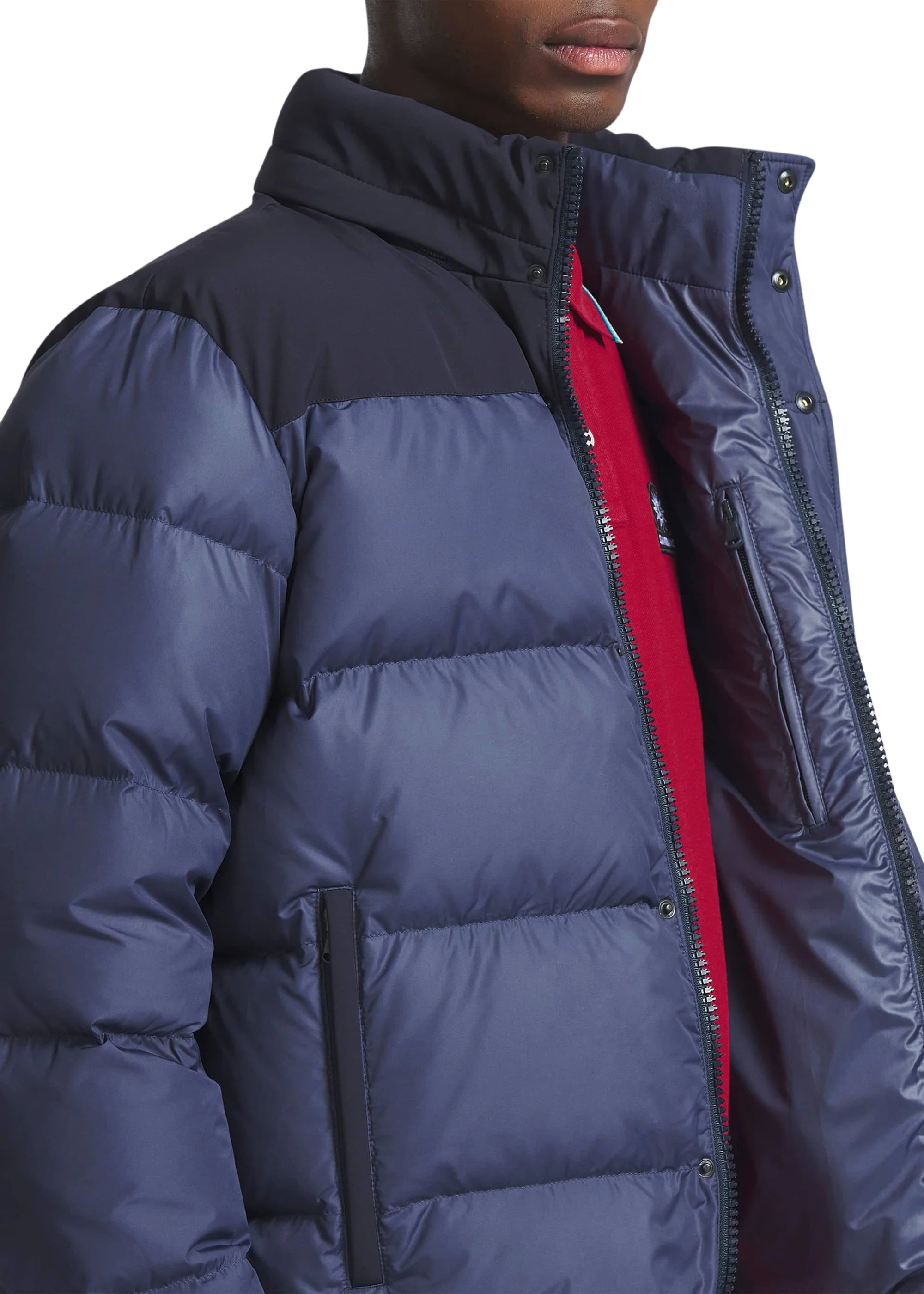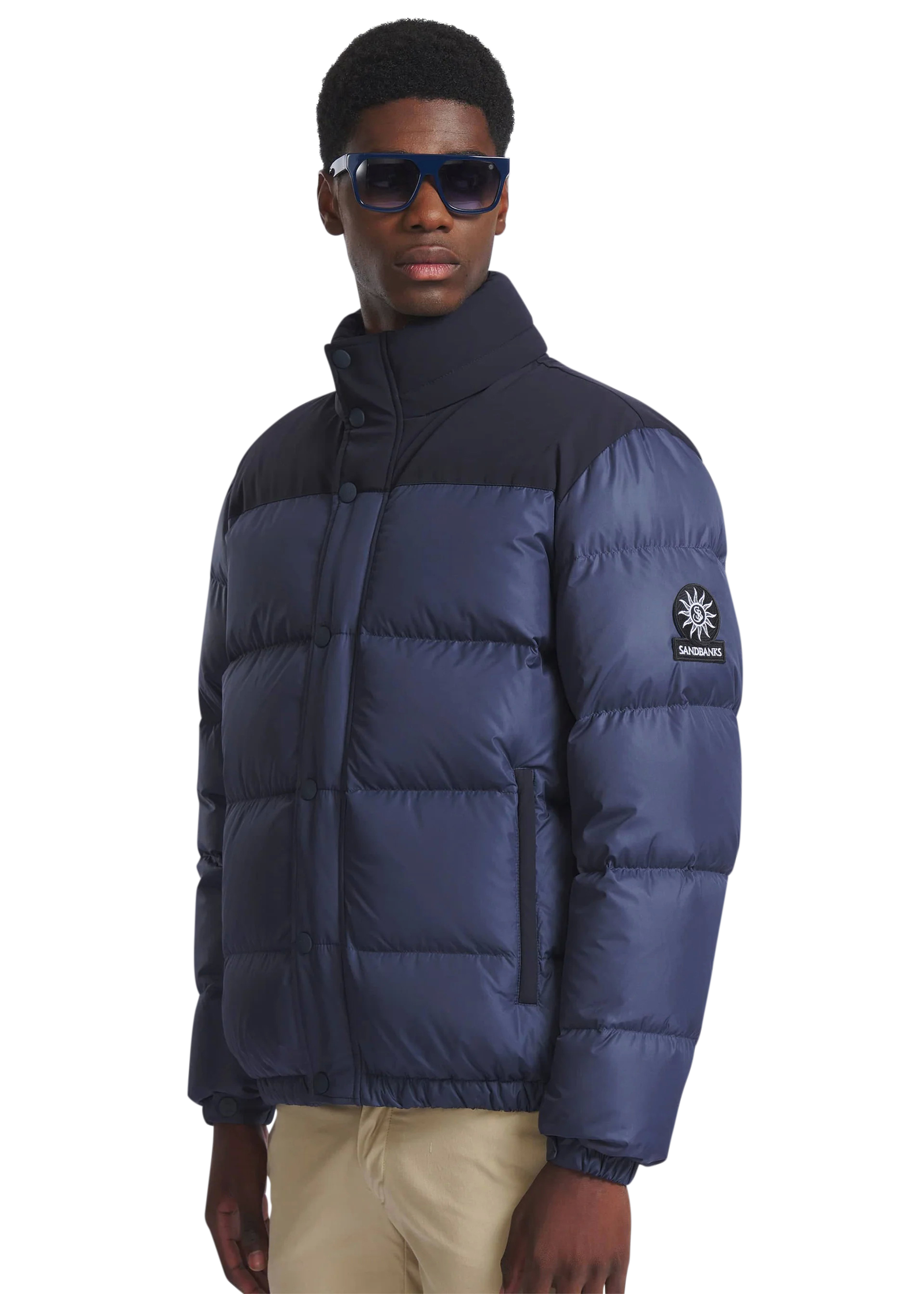 Online exclusive - the Sandbanks Peninsula puffer jacket in navy. This light weight Sandbanks puffer jacket features a felt and embroidered logo badge, tonal rubberised buttons, Lampo 2-way zip with rubberised pullers, contrast shoulder/collar, Sandbanks rear logo details and zip out hood.