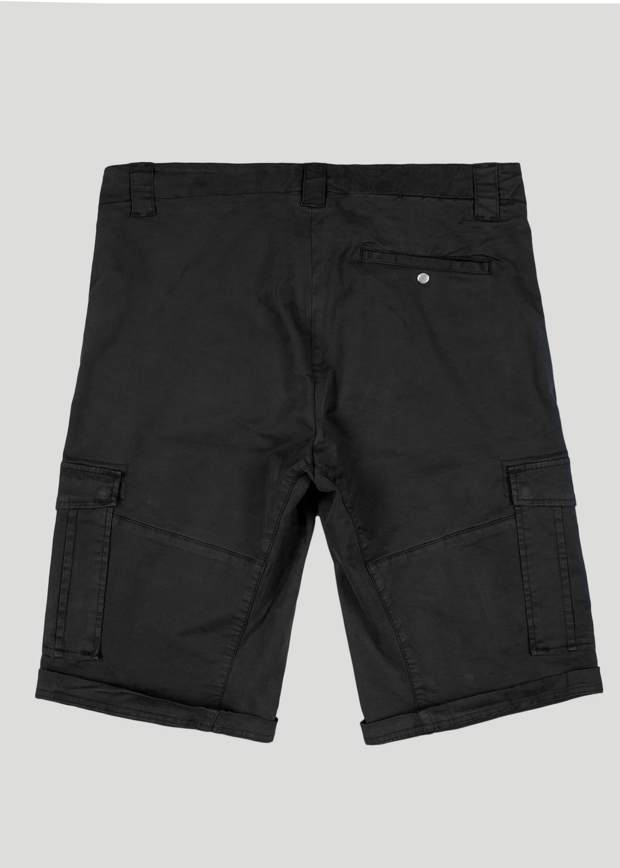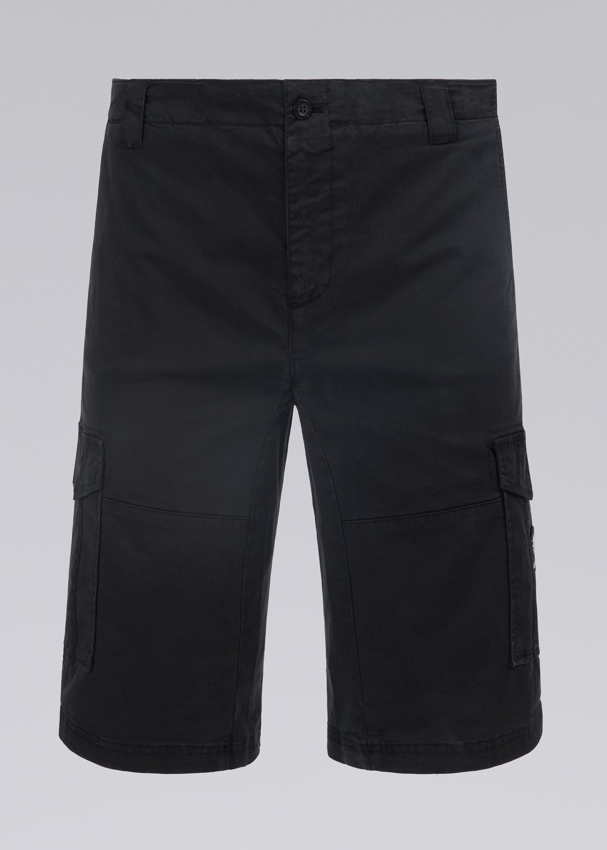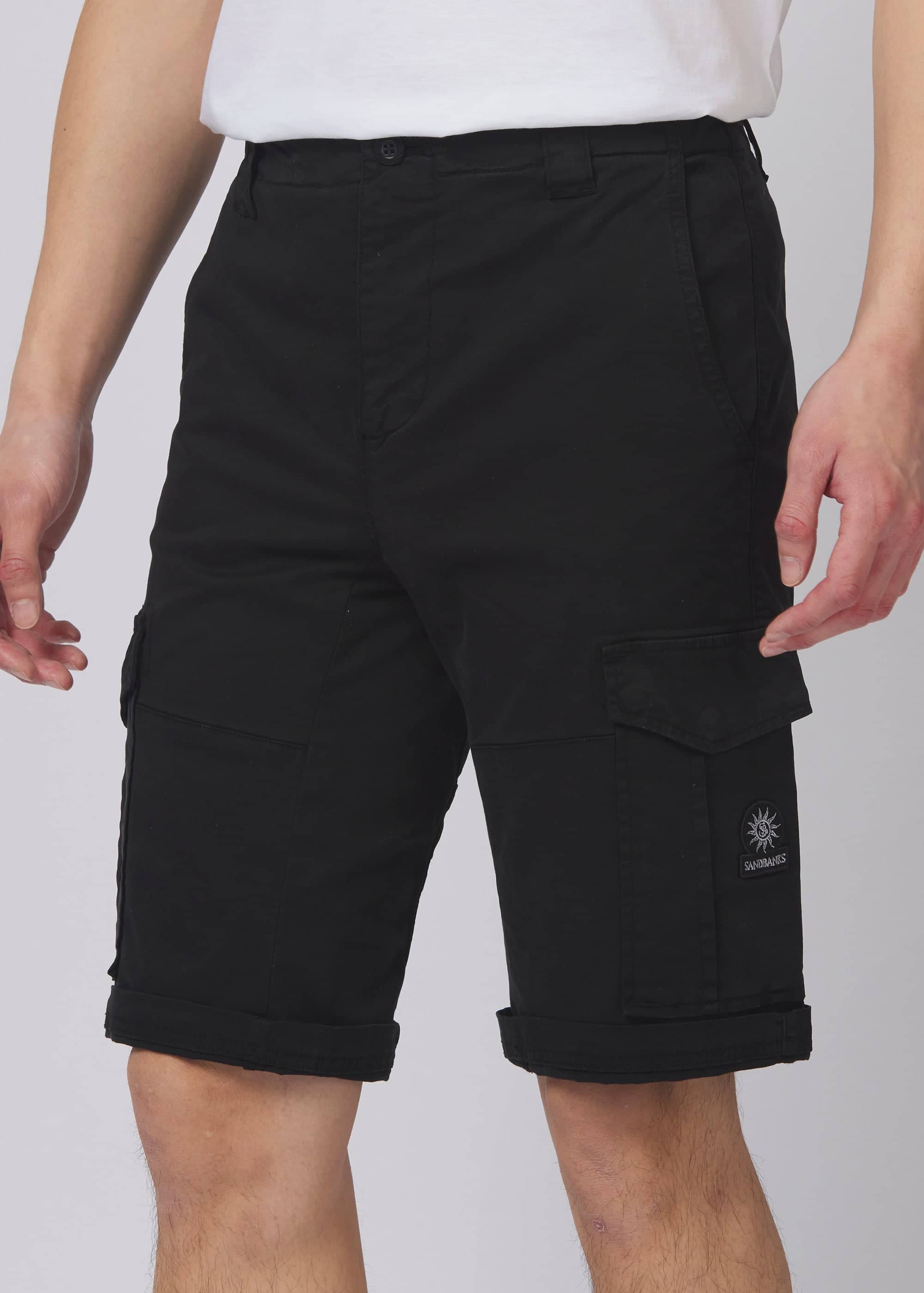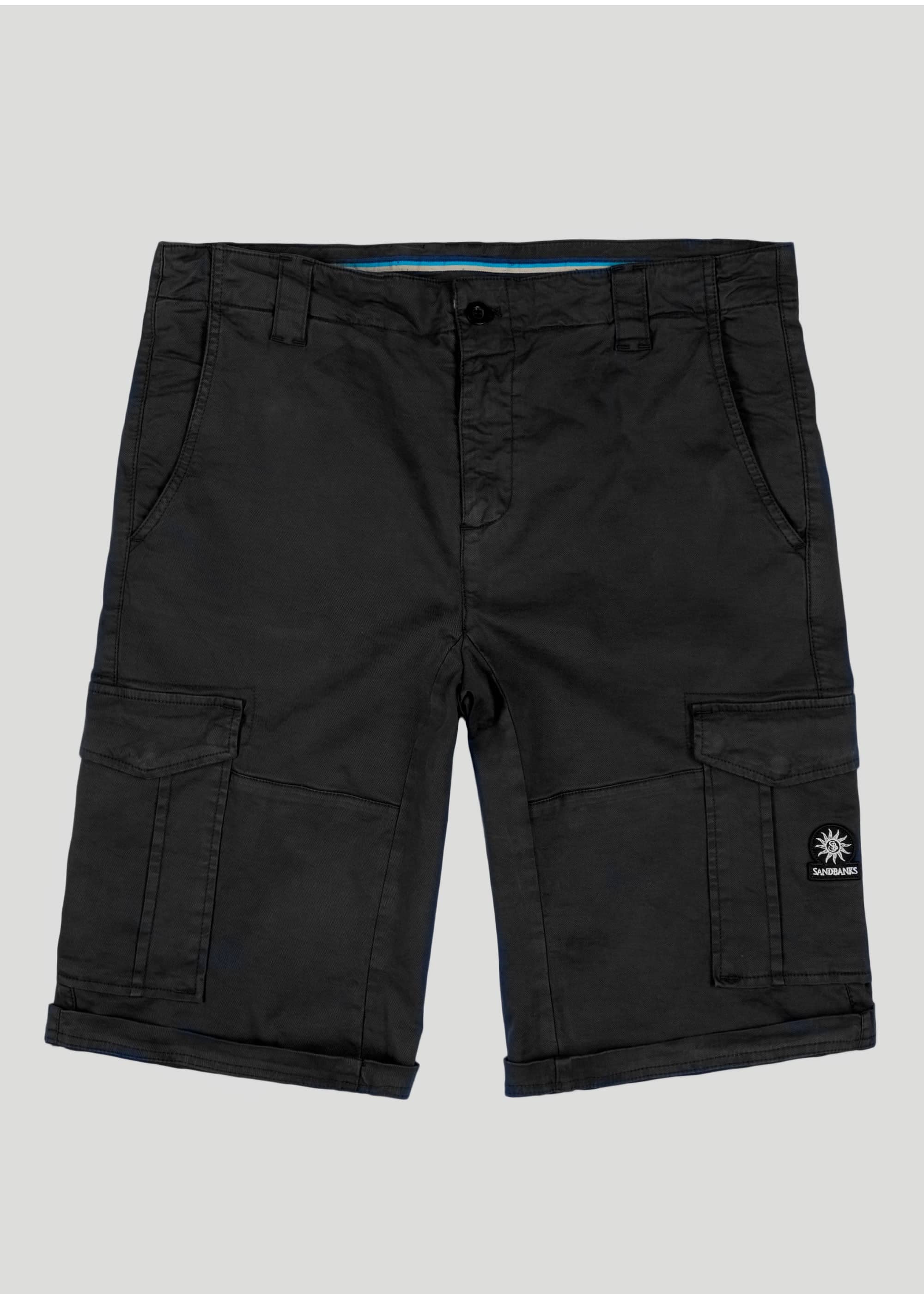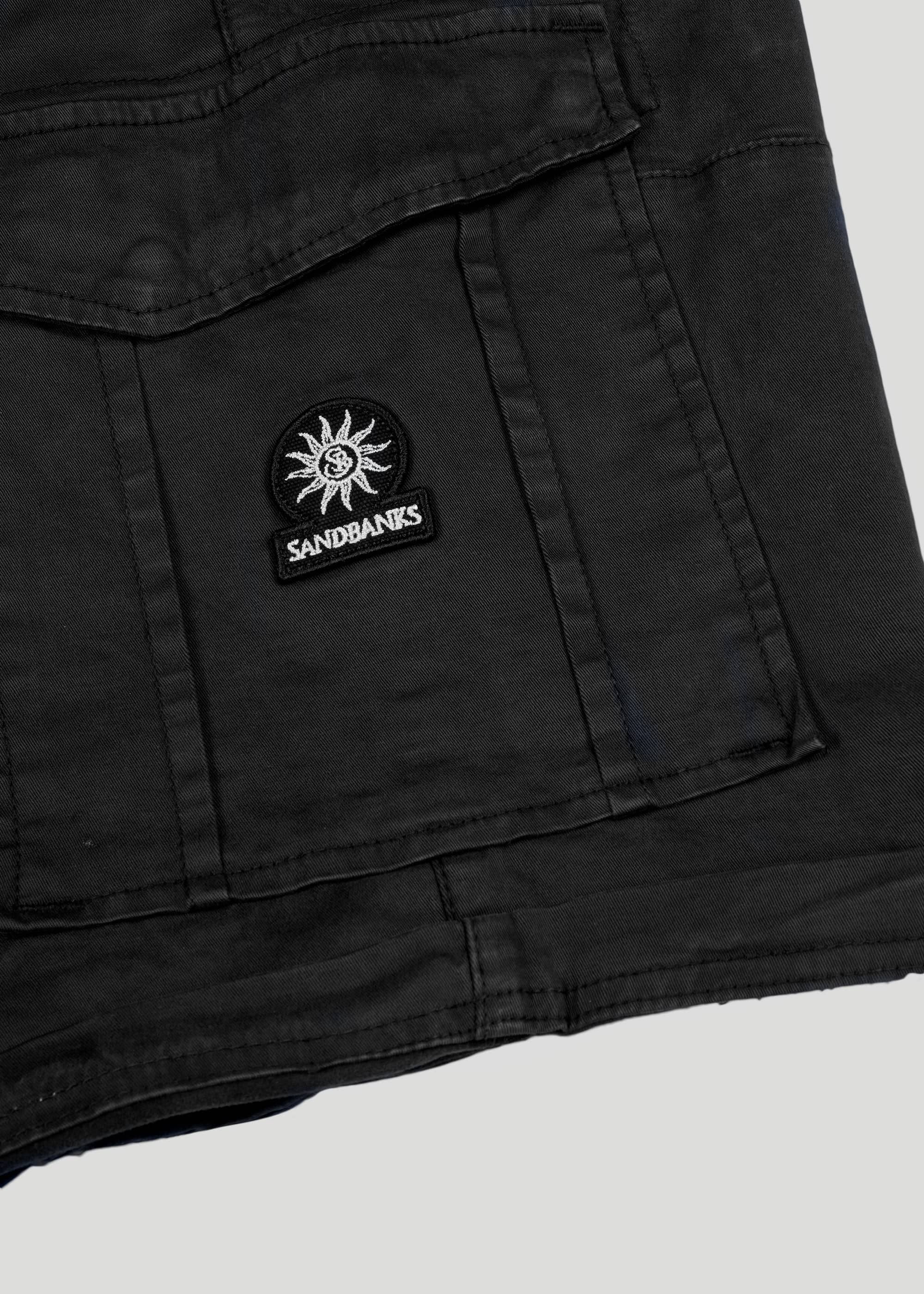 Sandbanks men's badge logo cargo short in black, made from 98% Organic Cotton and 2% Elastane for a comfortable fit. This cargo short features a Sandbanks logo badge embroidery on the thigh pocket, Sandbanks branded front button, front zip and rear engraved enamel snap button pocket.