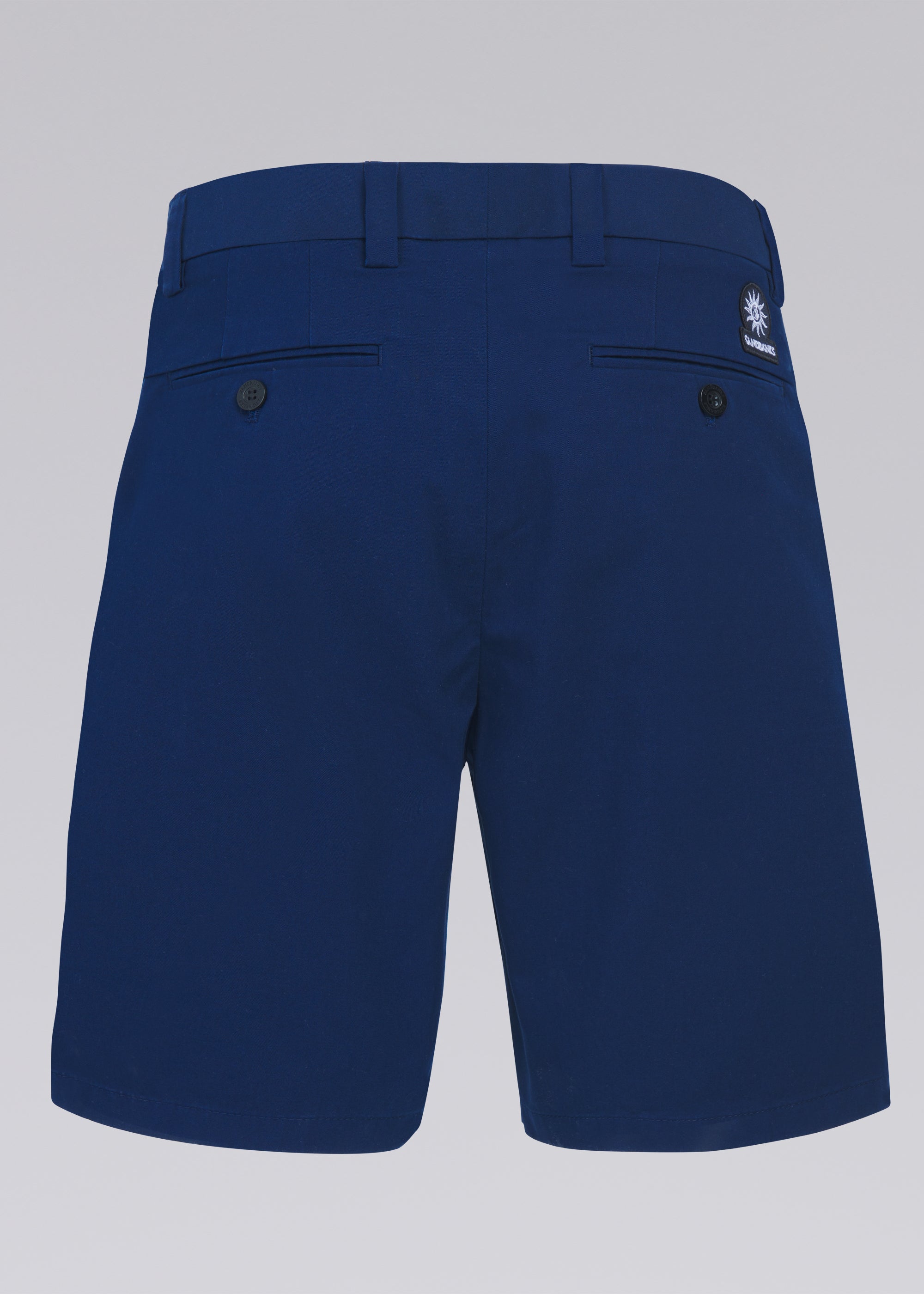Sandbanks men's badge logo chino short in navy, made from 97% Organic Cotton and 3% Elastane to allow for a comfortable fit. This chino short features a Sandbanks logo badge embroidery on the back, sandbanks branded buttons, front YKK zip, tri-colour turn back tab and belt loops.