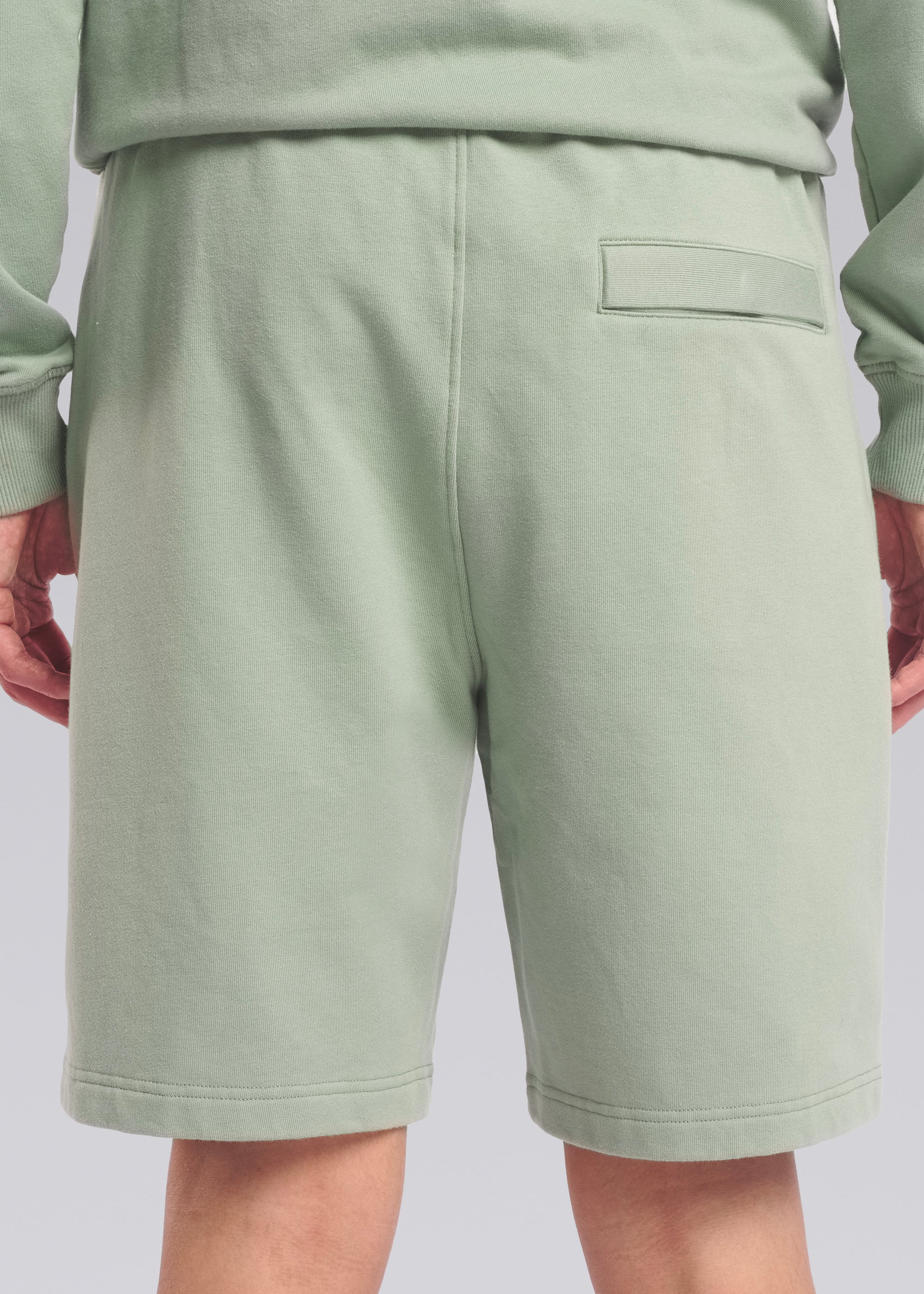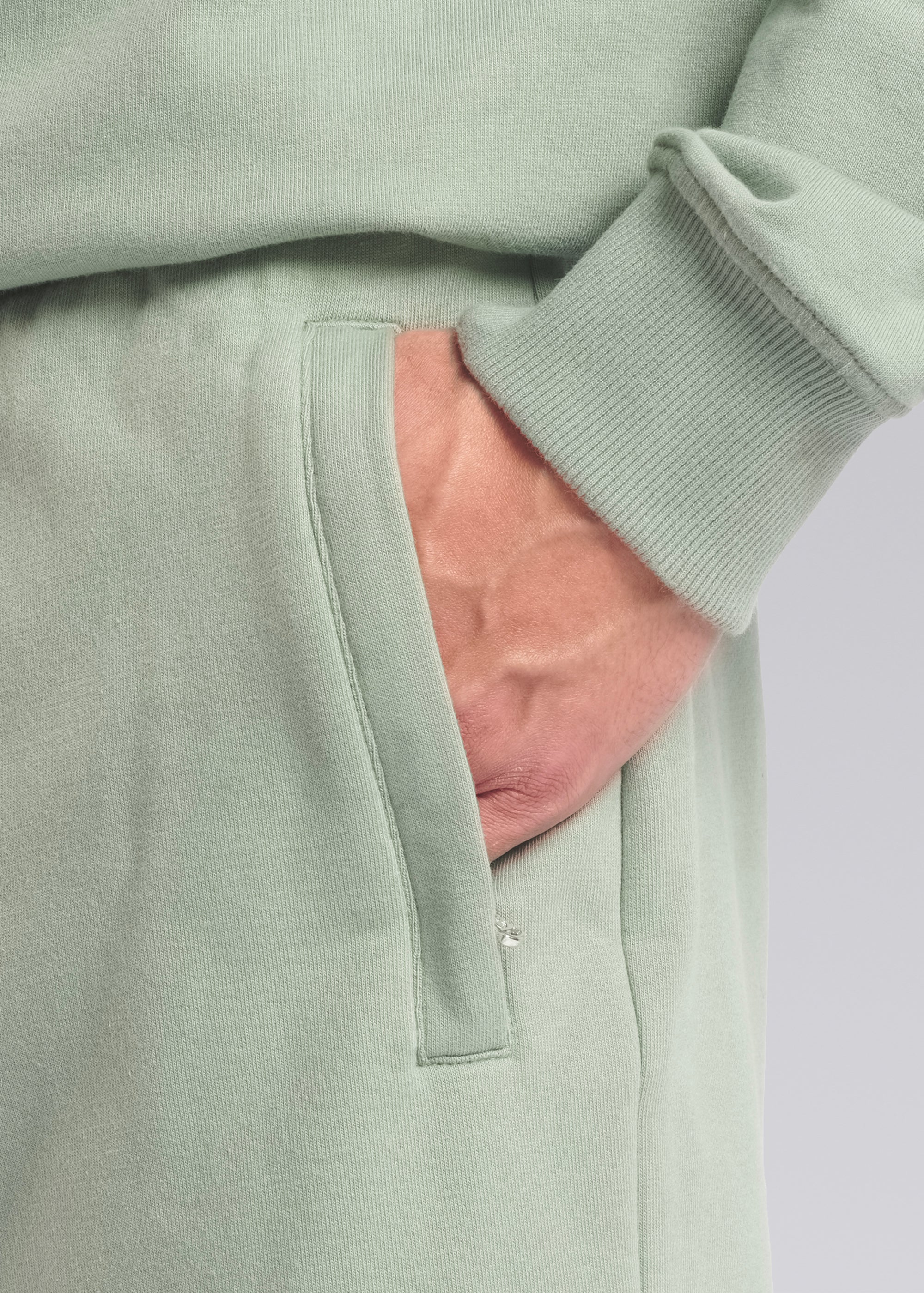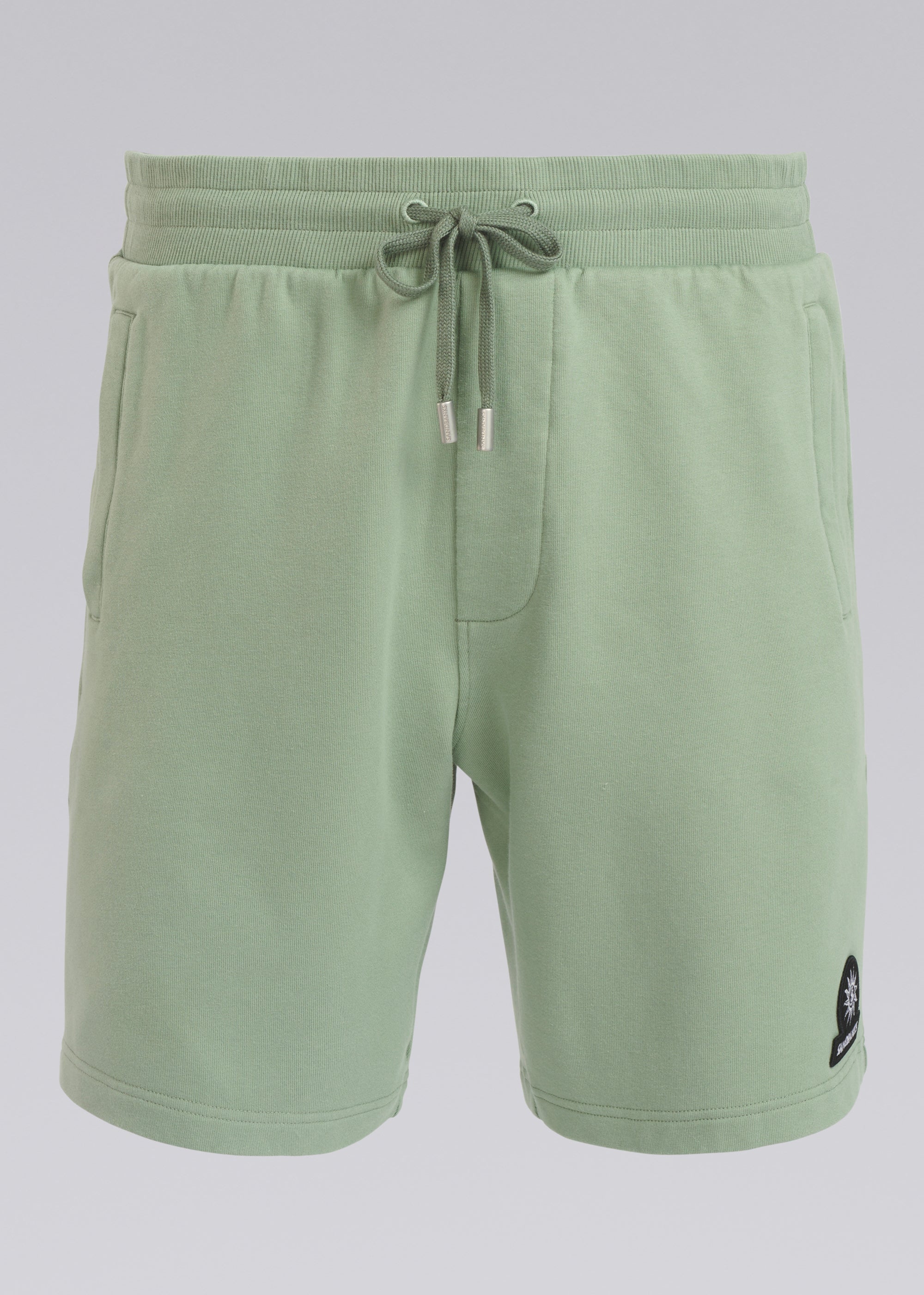 Our new and improved men's Sandbanks badge logo sweat shorts in sage. This garment has been upgraded with a 400gsm diagonal weave knitted fabric that features a slight brushed back for a superior soft feeling, whilst remaining breathable. Made from a 95% cotton 5% elastane for improved feel, shape retention, finished with an embroidered badge logo, and side zip pockets with engraved pullers.