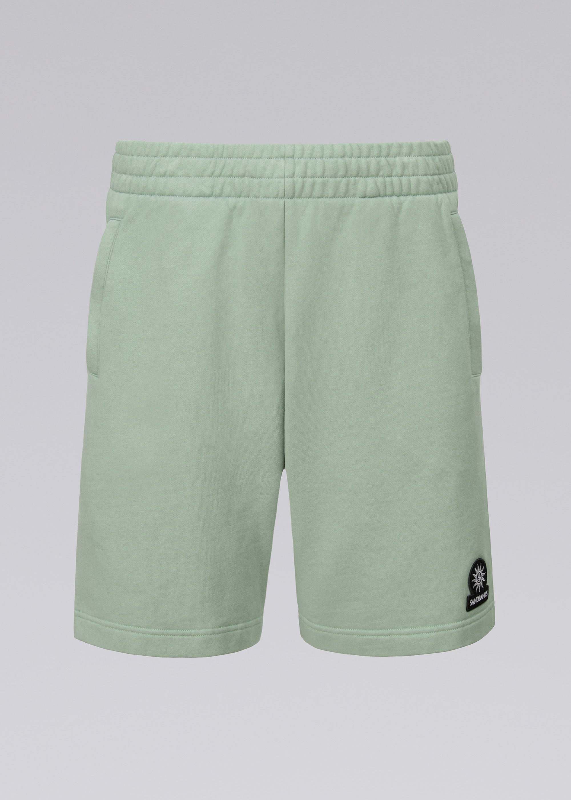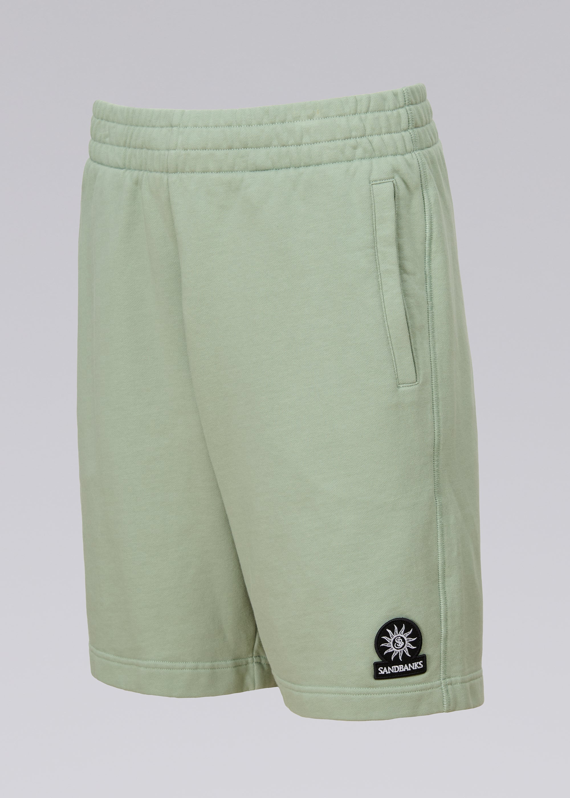 Sandbanks badge logo sweat shorts in sage constructed with a 400gsm diagonal weave knitted fabric that features a slight brushed back for a superior soft feeling, whilst remaining breathable. Made from a 95% cotton 5% elastane for improved feel, shape retention, finished with an embroidered badge logo, and side zip pockets with engraved pullers.