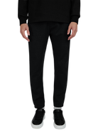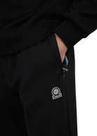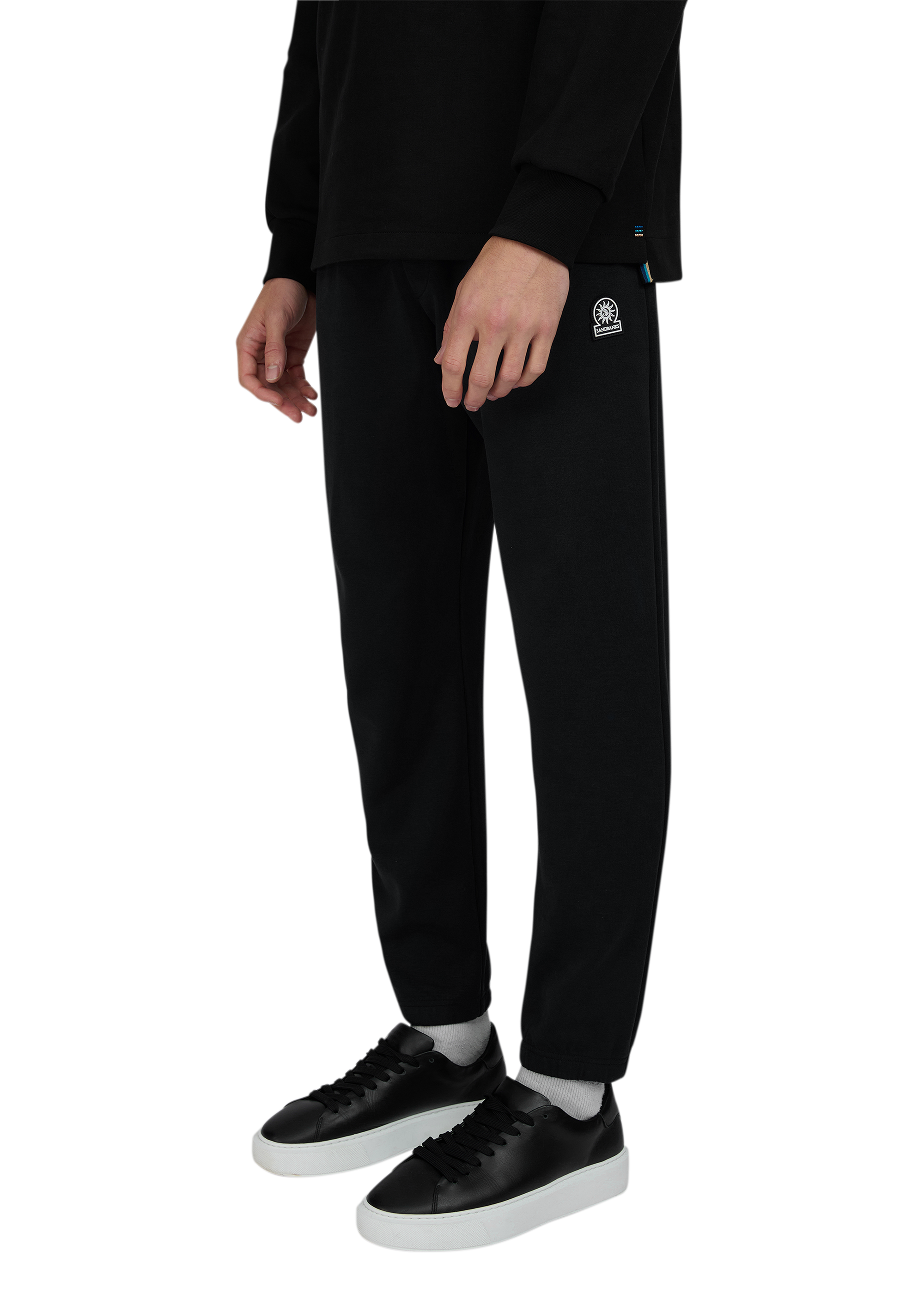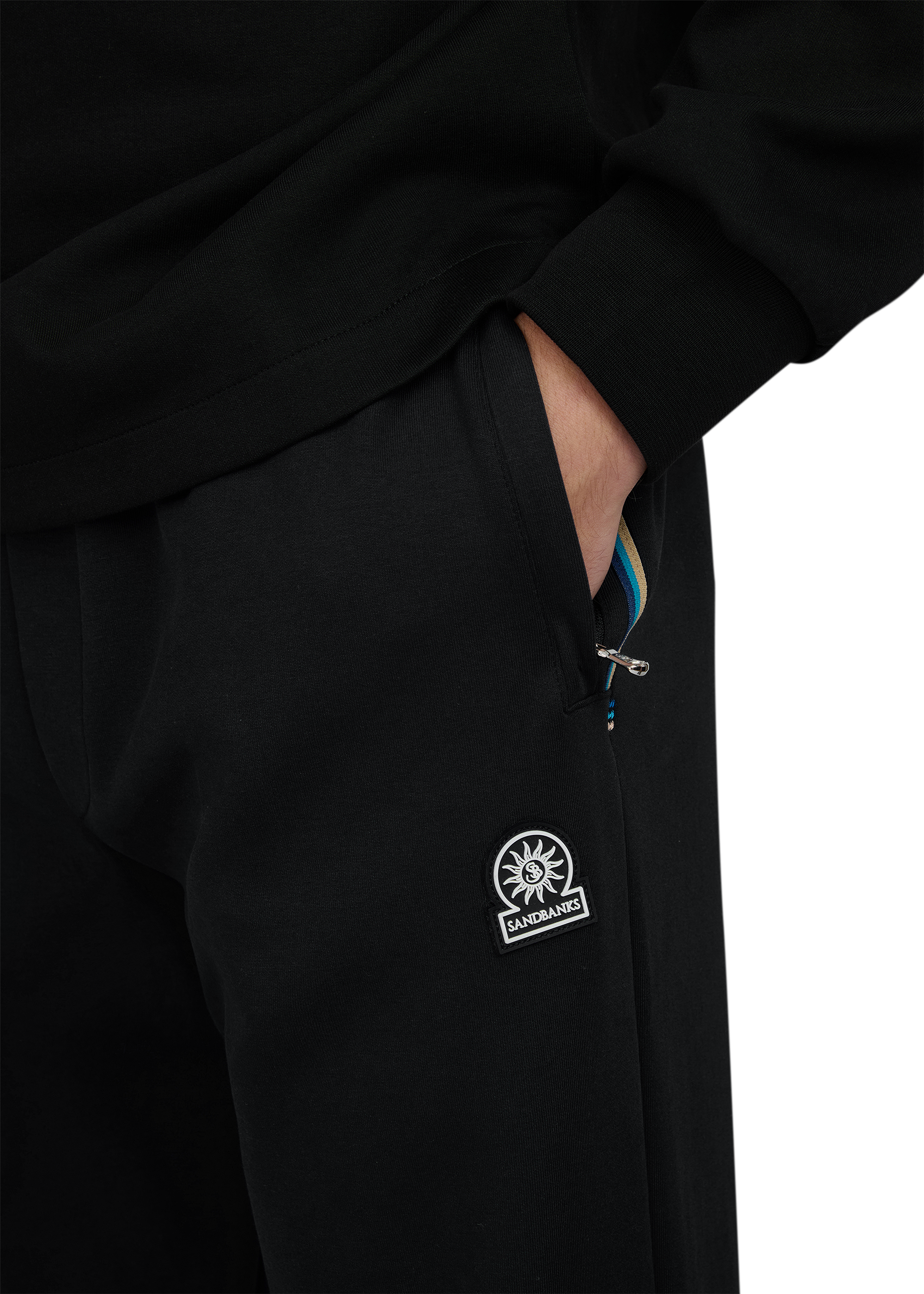 Sandbanks interlock sweat pant in black. Constructed from premium 350 GSM cotton interlock fabric, these regular fit pants combine durability with everyday comfort. Features include a tri-colour internal drawstring, side entry pockets and the signature sandbanks rubber badge.