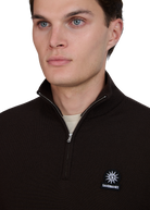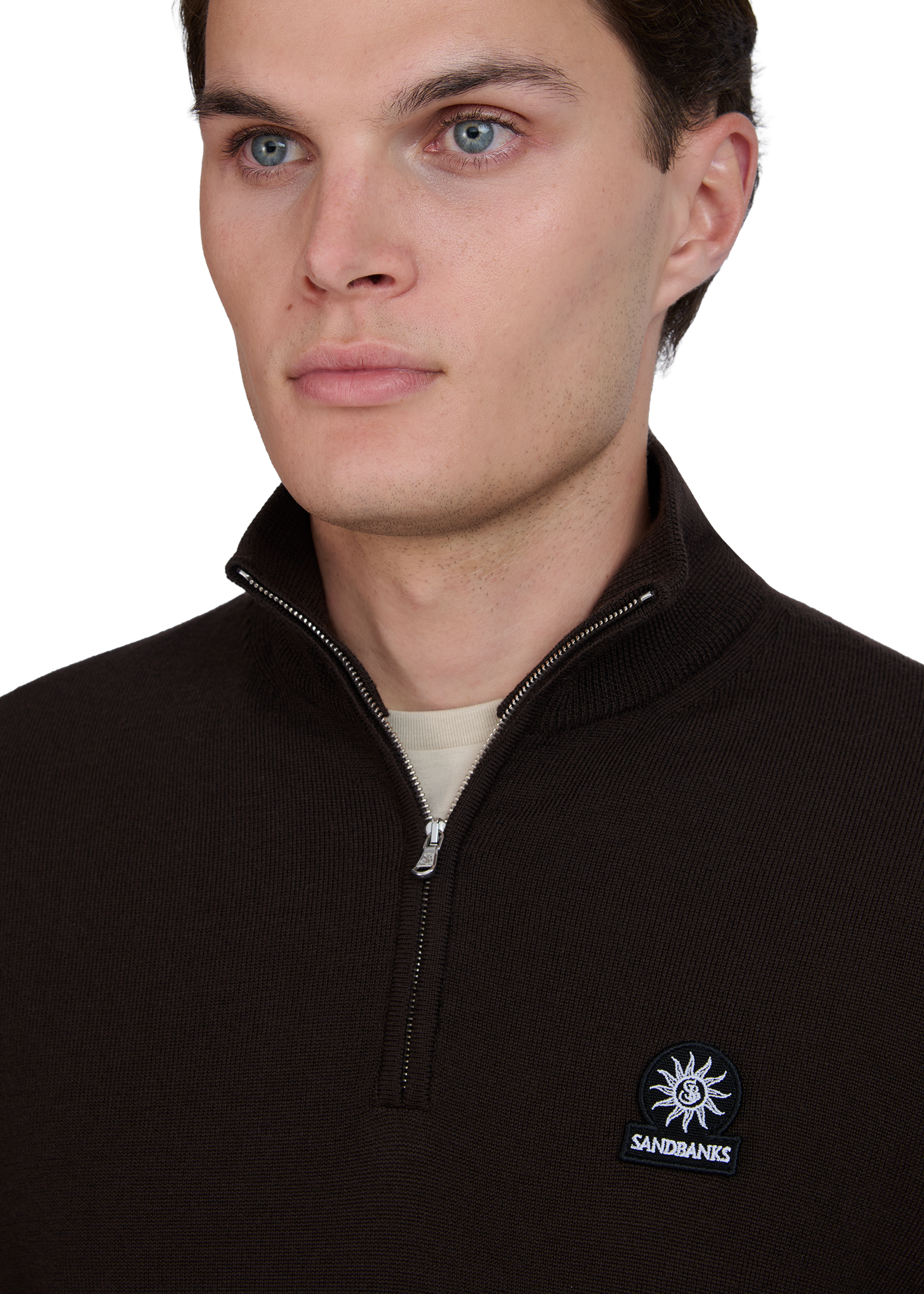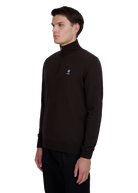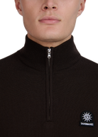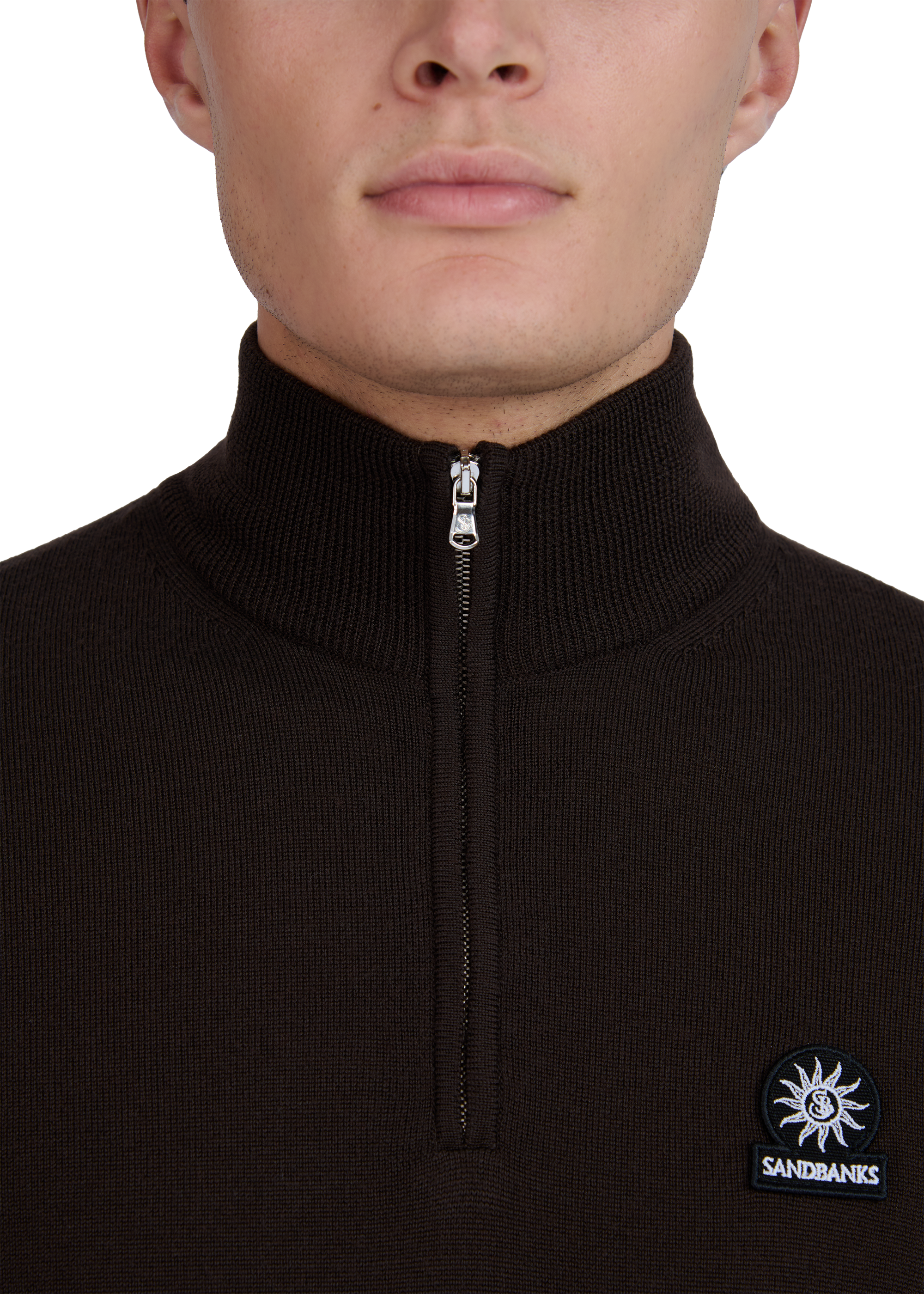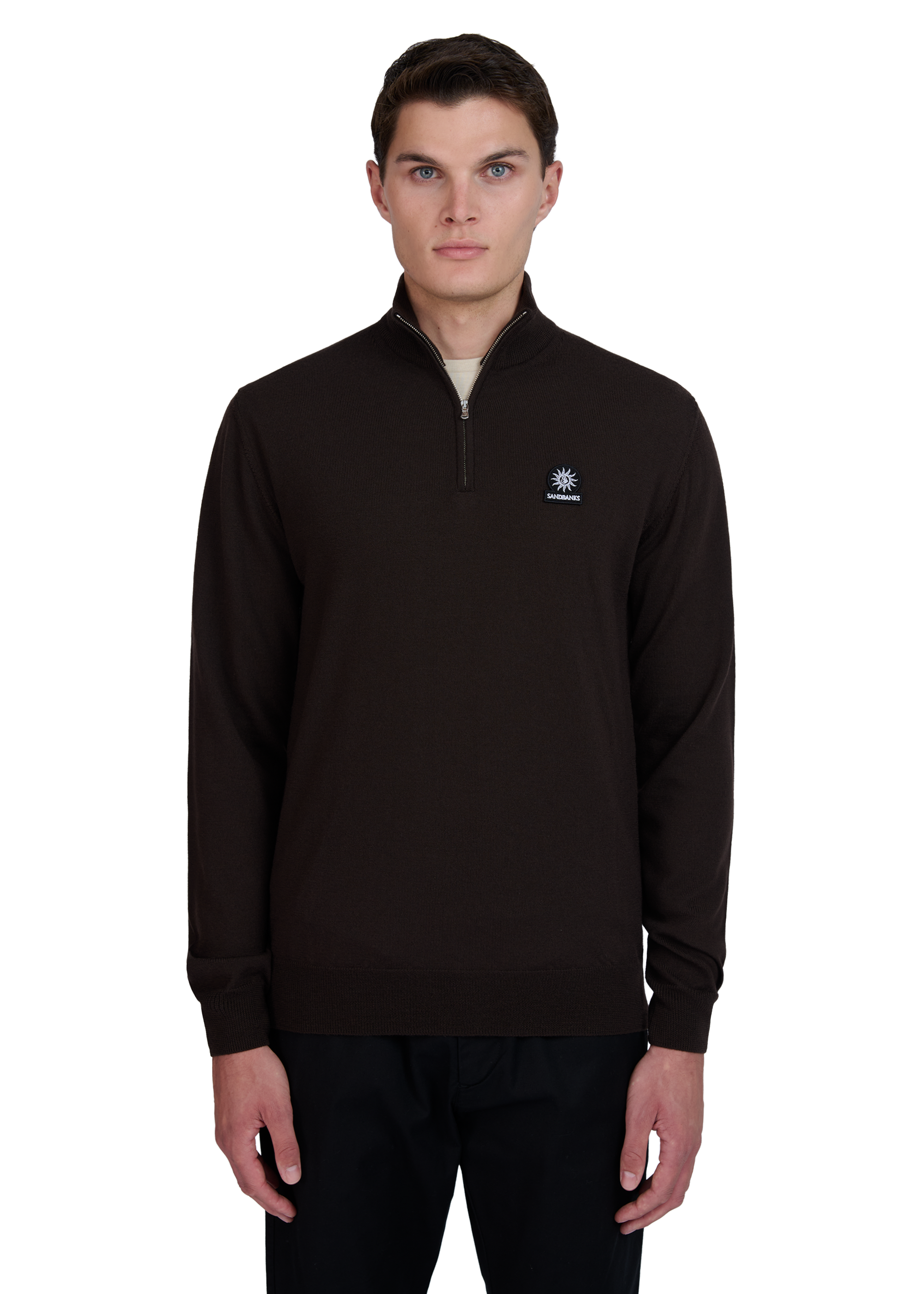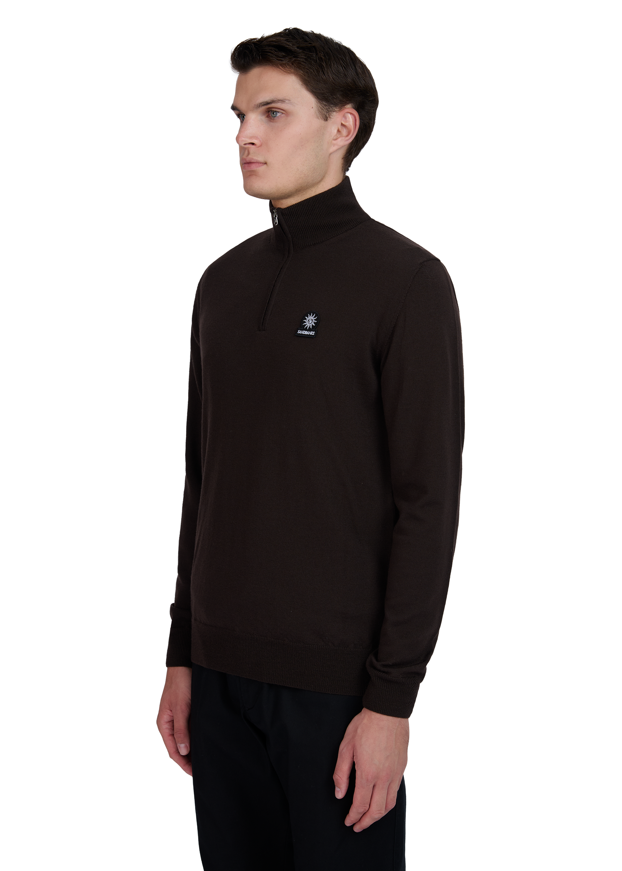 The Sandbanks Merino Wool Quarter Zip Jumper in brown is crafted with ultra fine 100% Merino Wool from Italy. It boasts a Sandbanks logo badge embroidery on the chest, a funnel neck design, and a Sandbanks branded Lampo engraved zip.