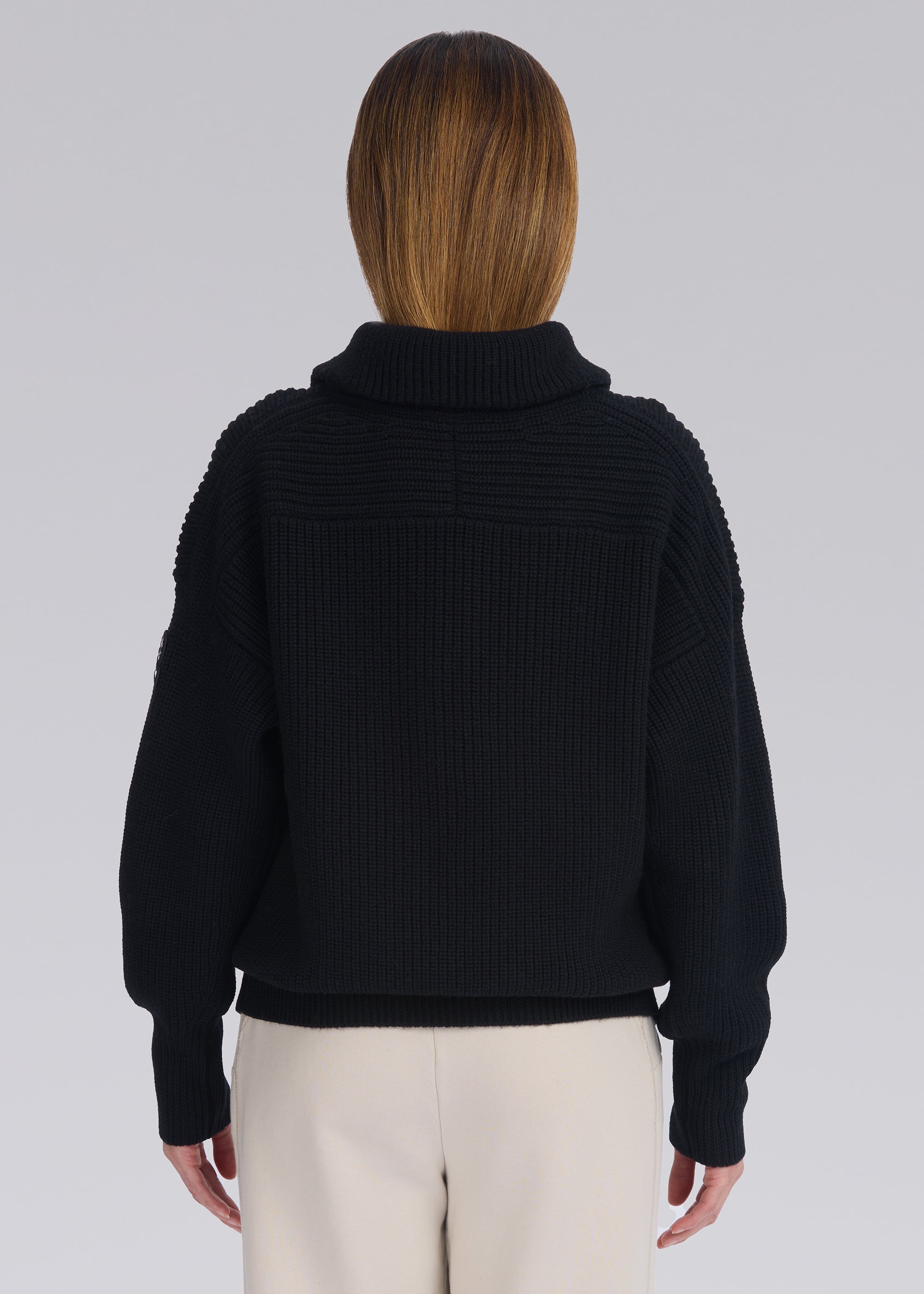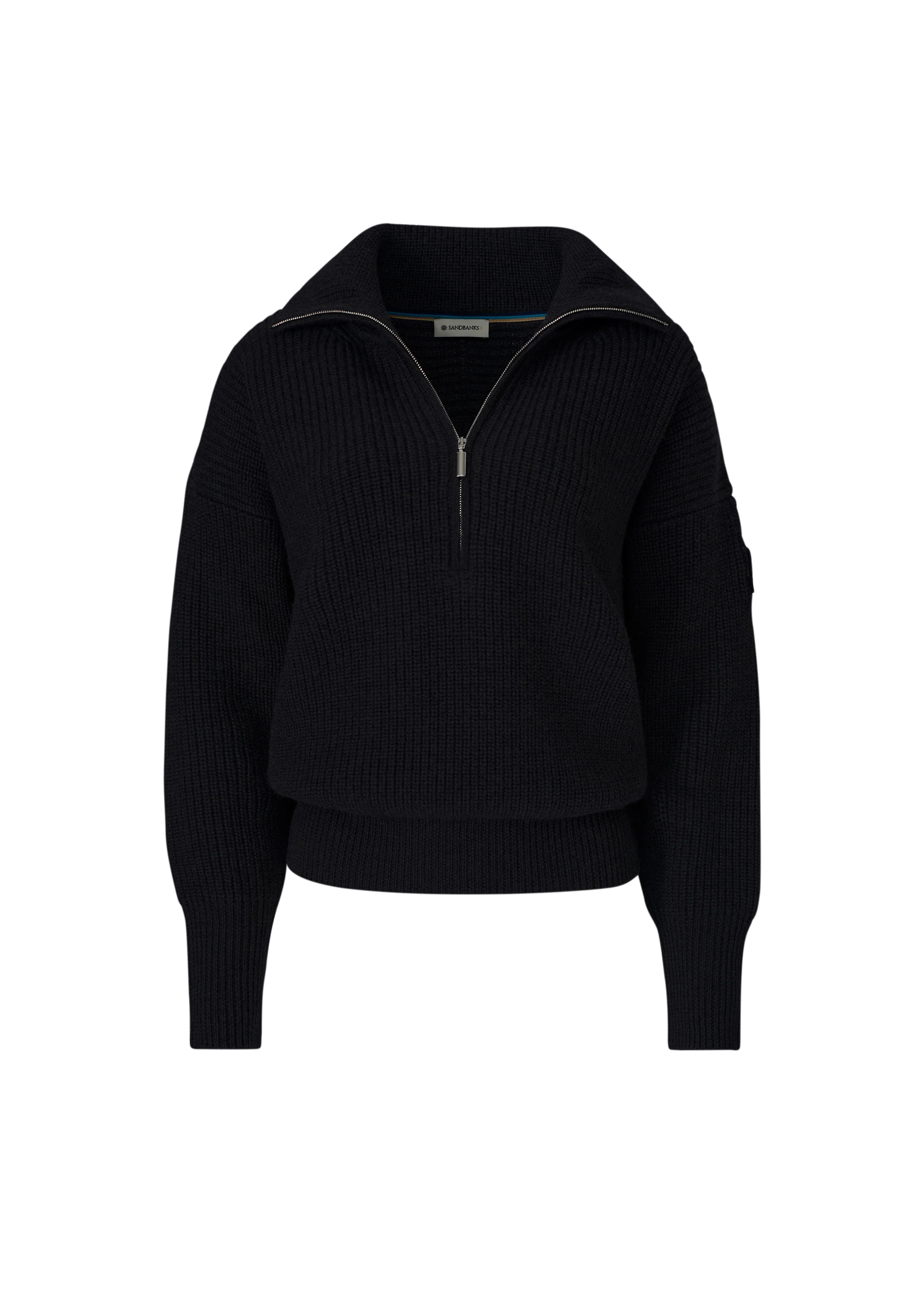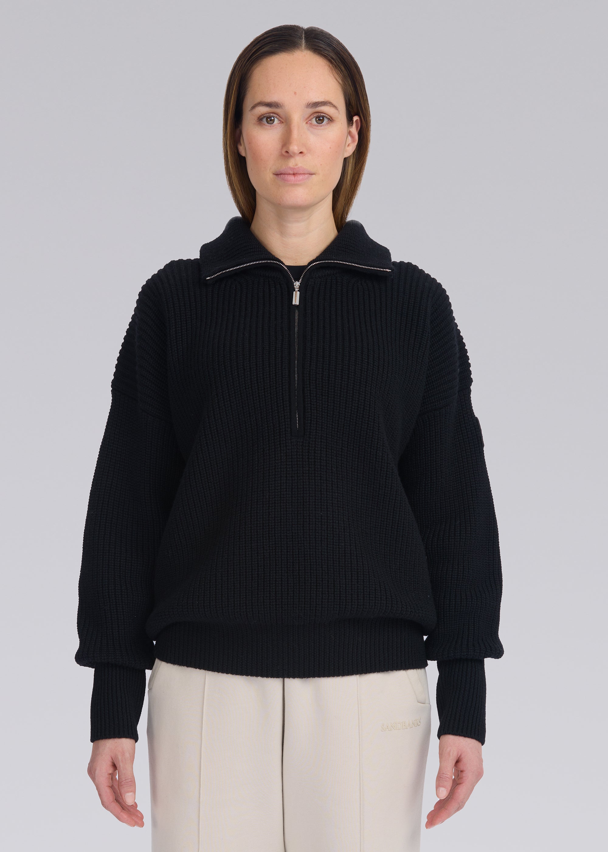 Sandbanks half zip knitted jumper in black, made from an extra fine merino wool for a cosy feel. This luxury jumper features a funnel neck with silver Lampo half zip, engraved Sandbanks zip puller and embroidered sleeve badge logo.