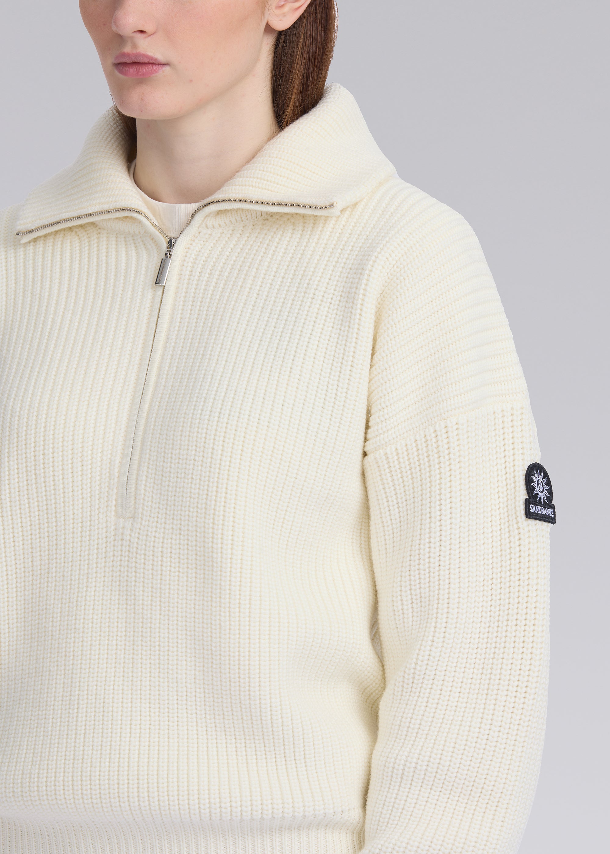 Sandbanks half zip knitted jumper in ecru, made from an extra fine merino wool for a cosy feel. This luxury jumper features a funnel neck with silver Lampo half zip, engraved Sandbanks zip puller and embroidered sleeve badge logo.