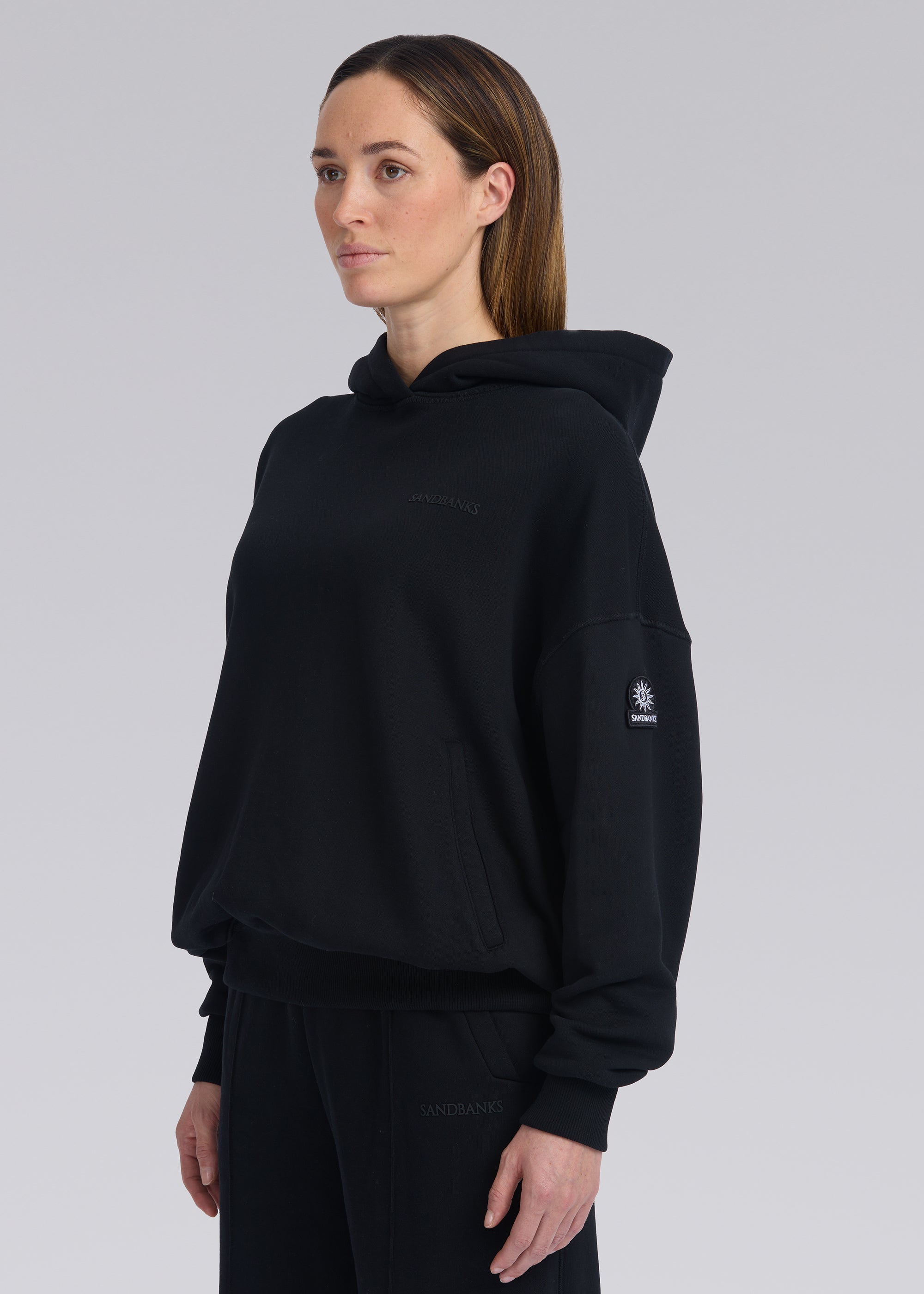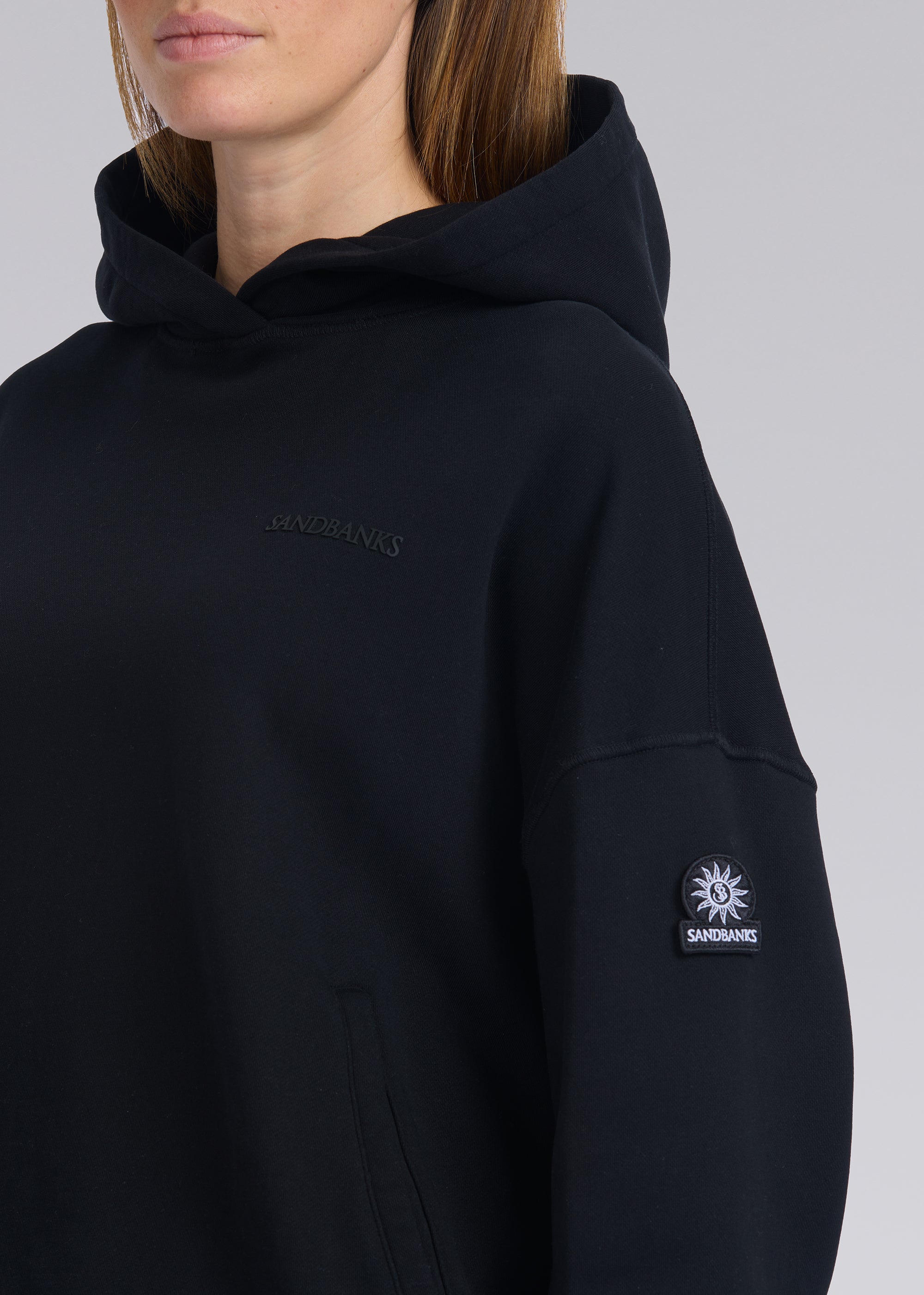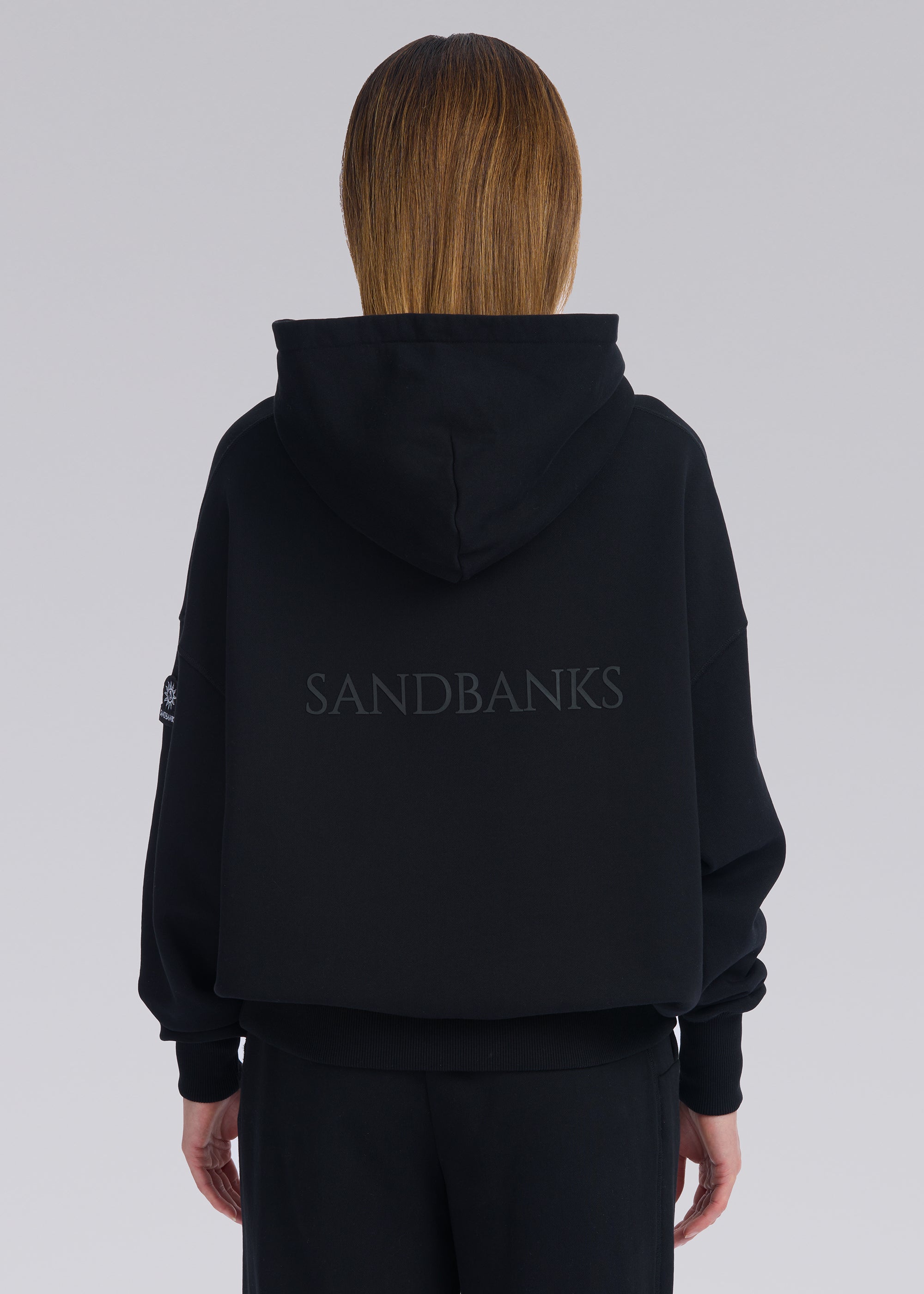 Our women's Sandbanks badge logo hoodie in black is constructed with 400gsm diagonal knitted fabric that features a slight brushed back for a superior soft feeling and warmth, whilst remaining breathable. Made from 100% BCI Cotton with a sleeve embroidered badge logo and cover stitch details.