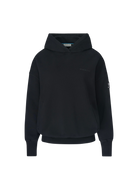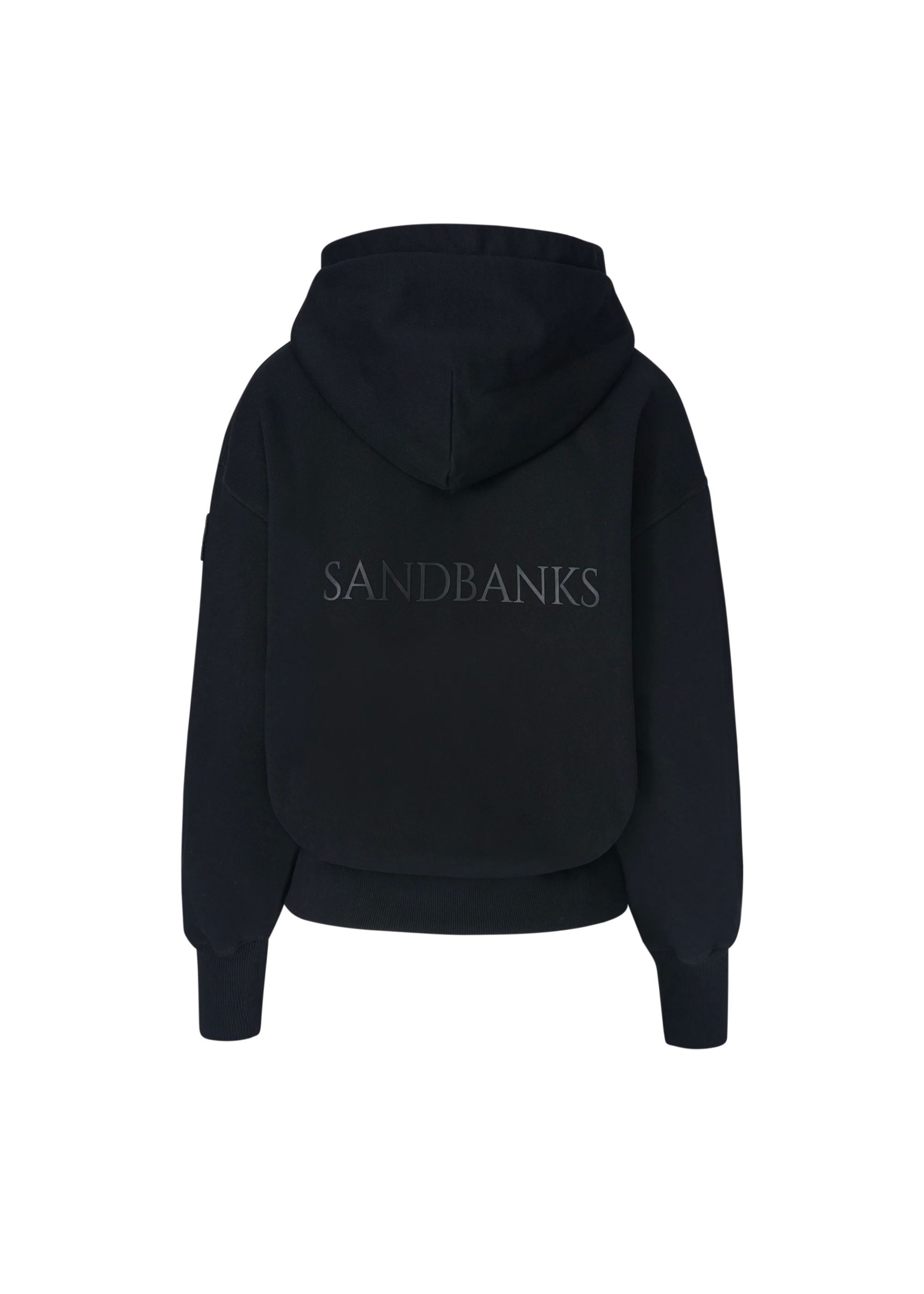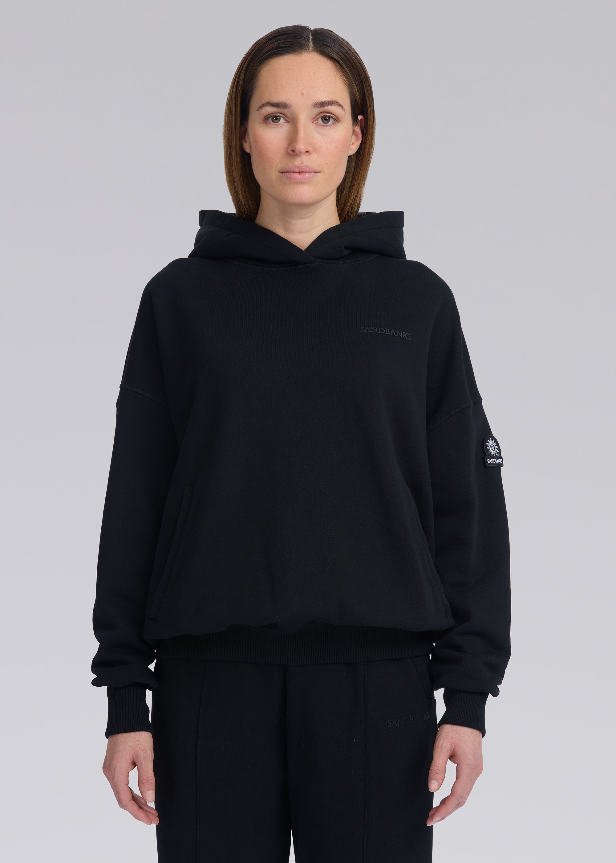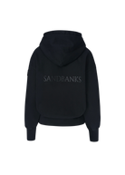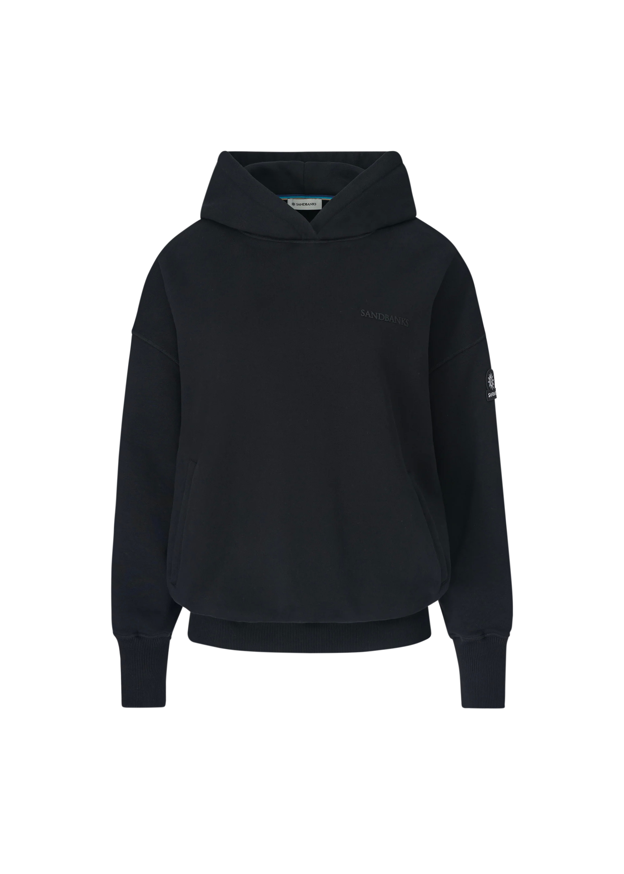 Our women's Sandbanks badge logo hoodie in black is constructed with 400gsm diagonal knitted fabric that features a slight brushed back for a superior soft feeling and warmth, whilst remaining breathable. Made from 100% BCI Cotton with a sleeve embroidered badge logo and cover stitch details.