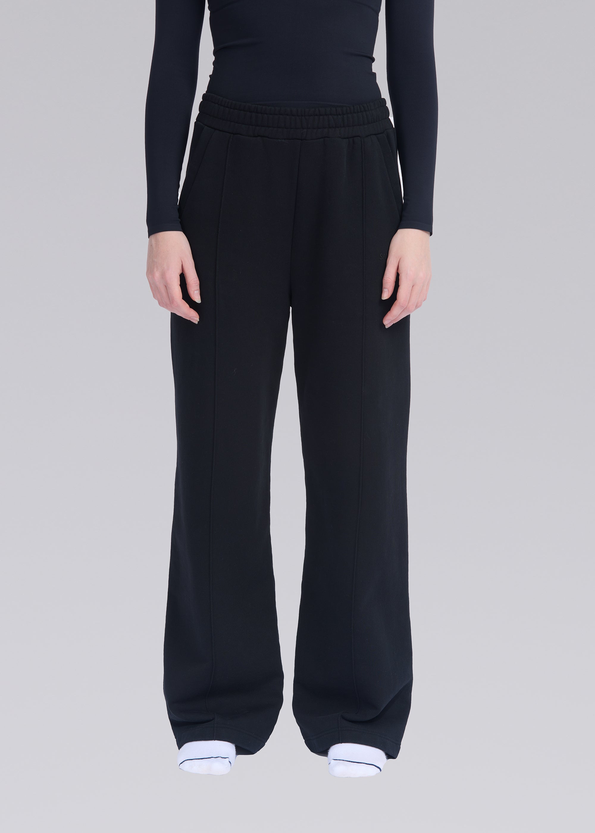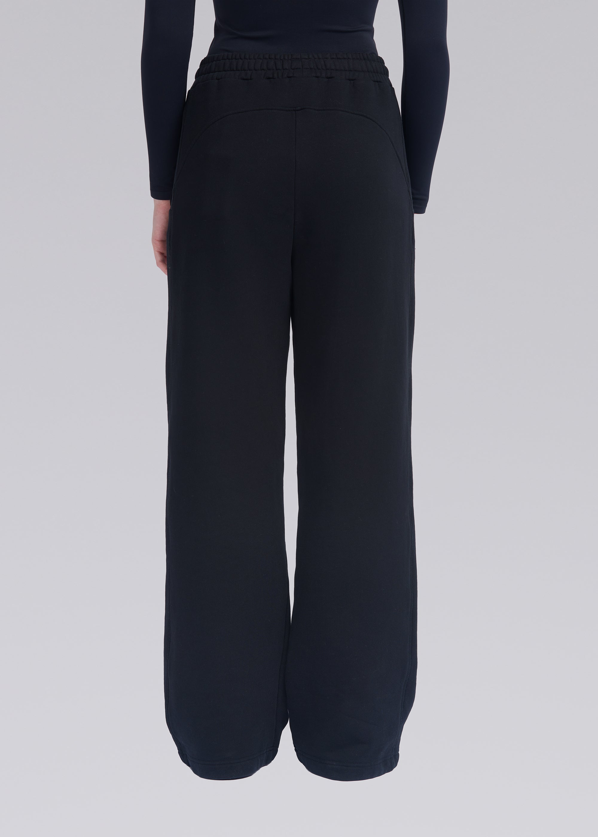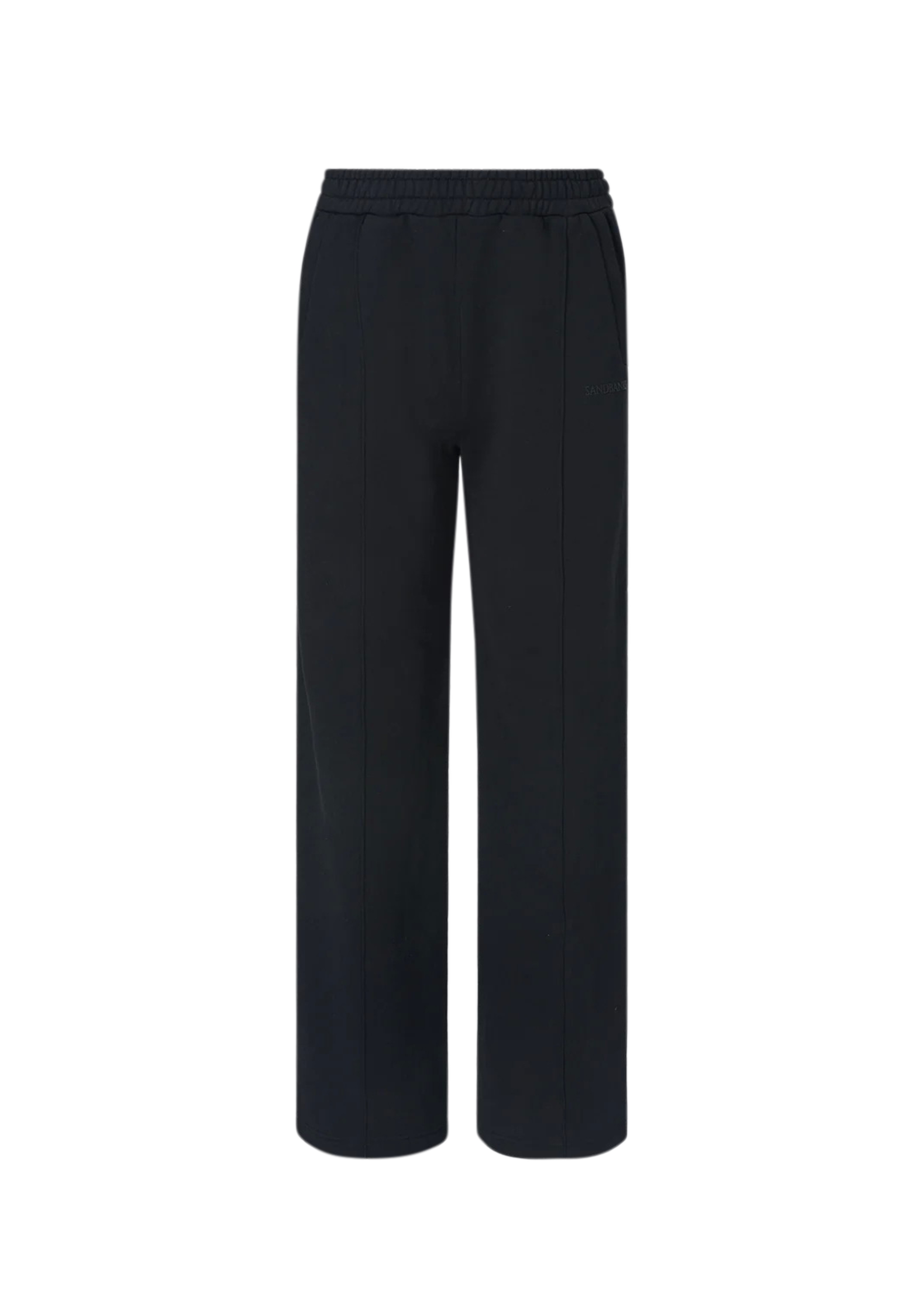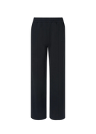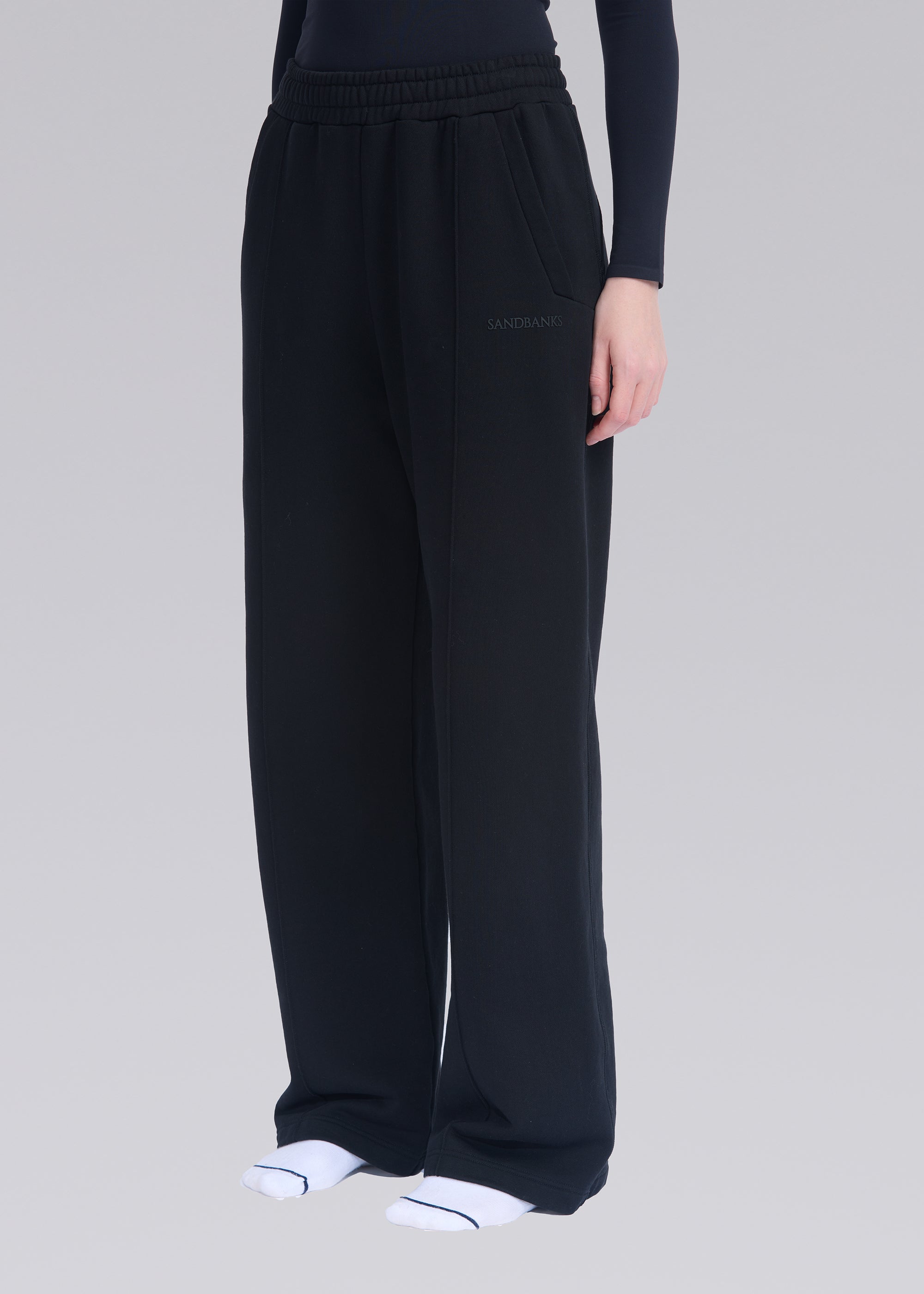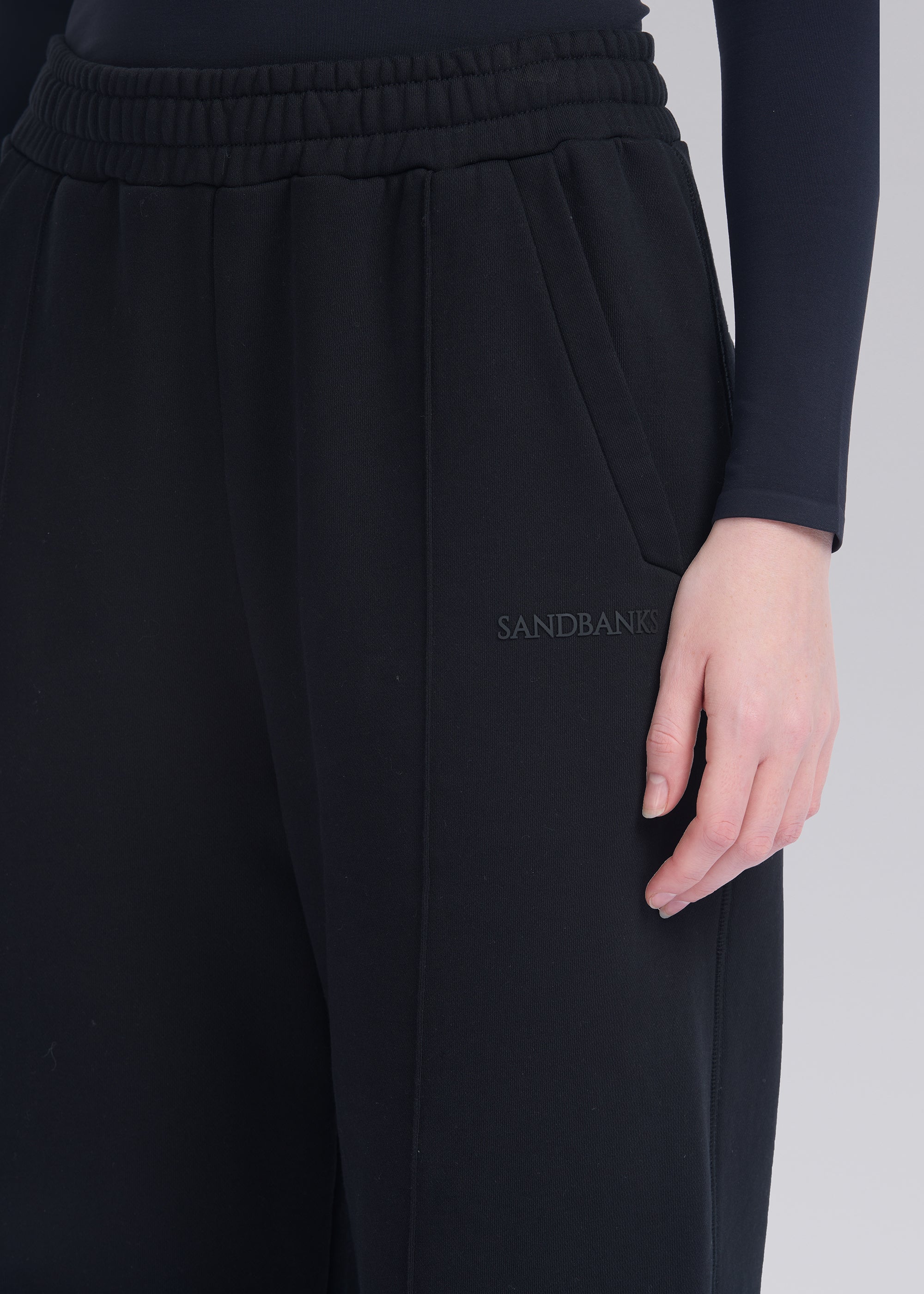 Our women's Sandbanks wide leg track pants in black are constructed with a 400gsm diagonal knitted fabric that features a slight brushed back for a superior soft feeling and warmth, whilst remaining breathable. Made from 100% BCI Cotton with a tonal Sandbanks raised rubber print, and internal tri-colour flat draw cord.