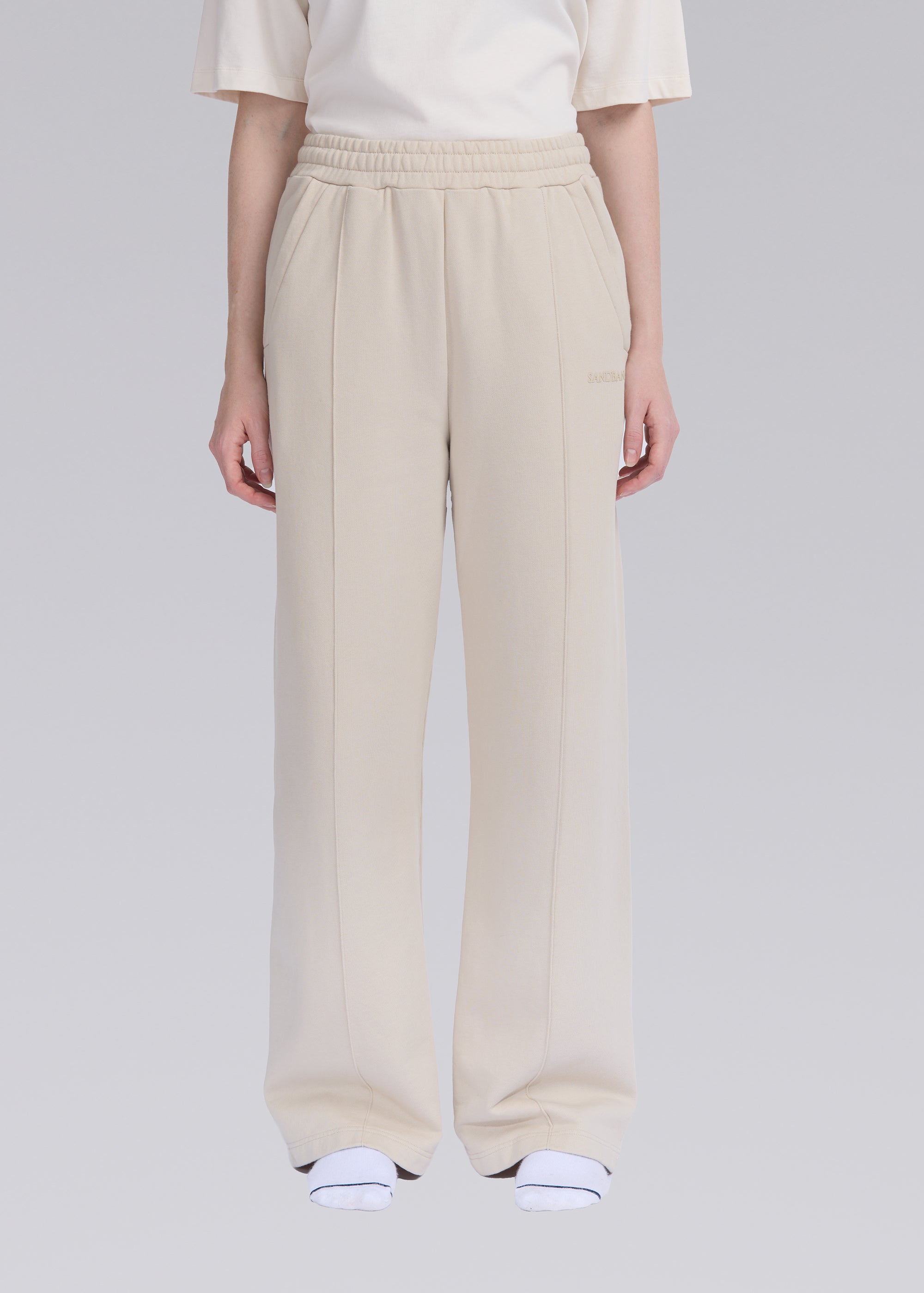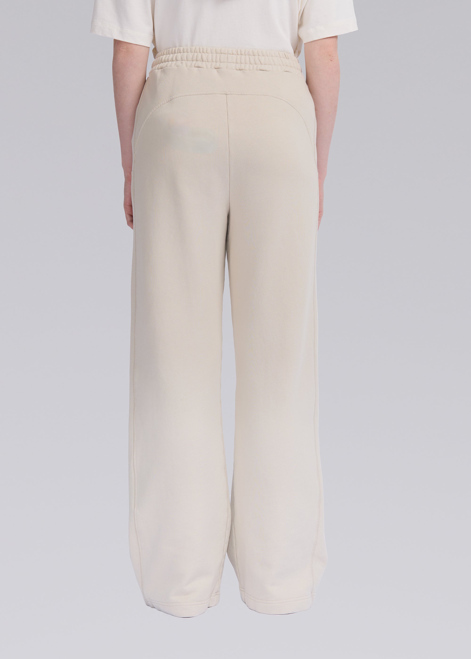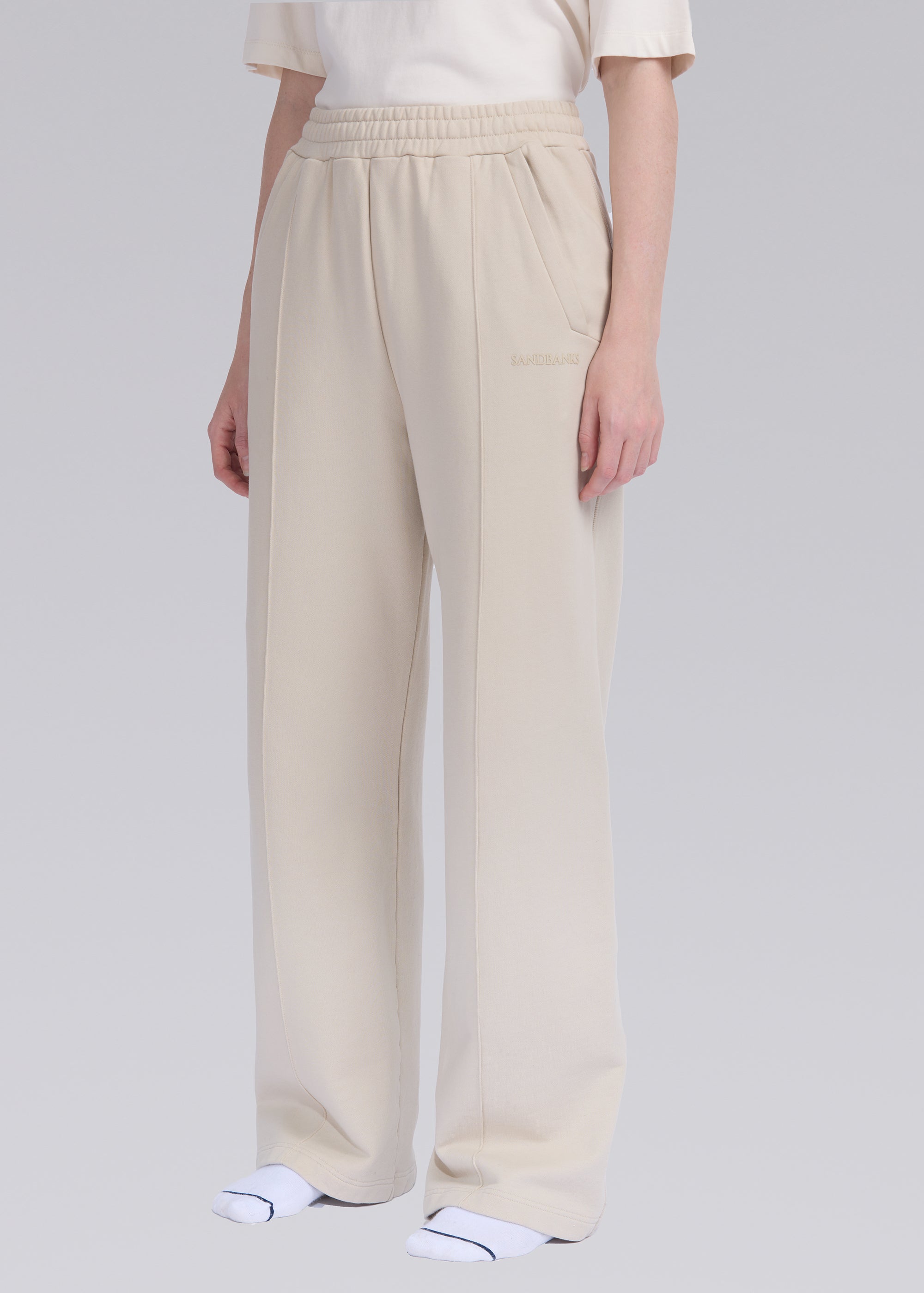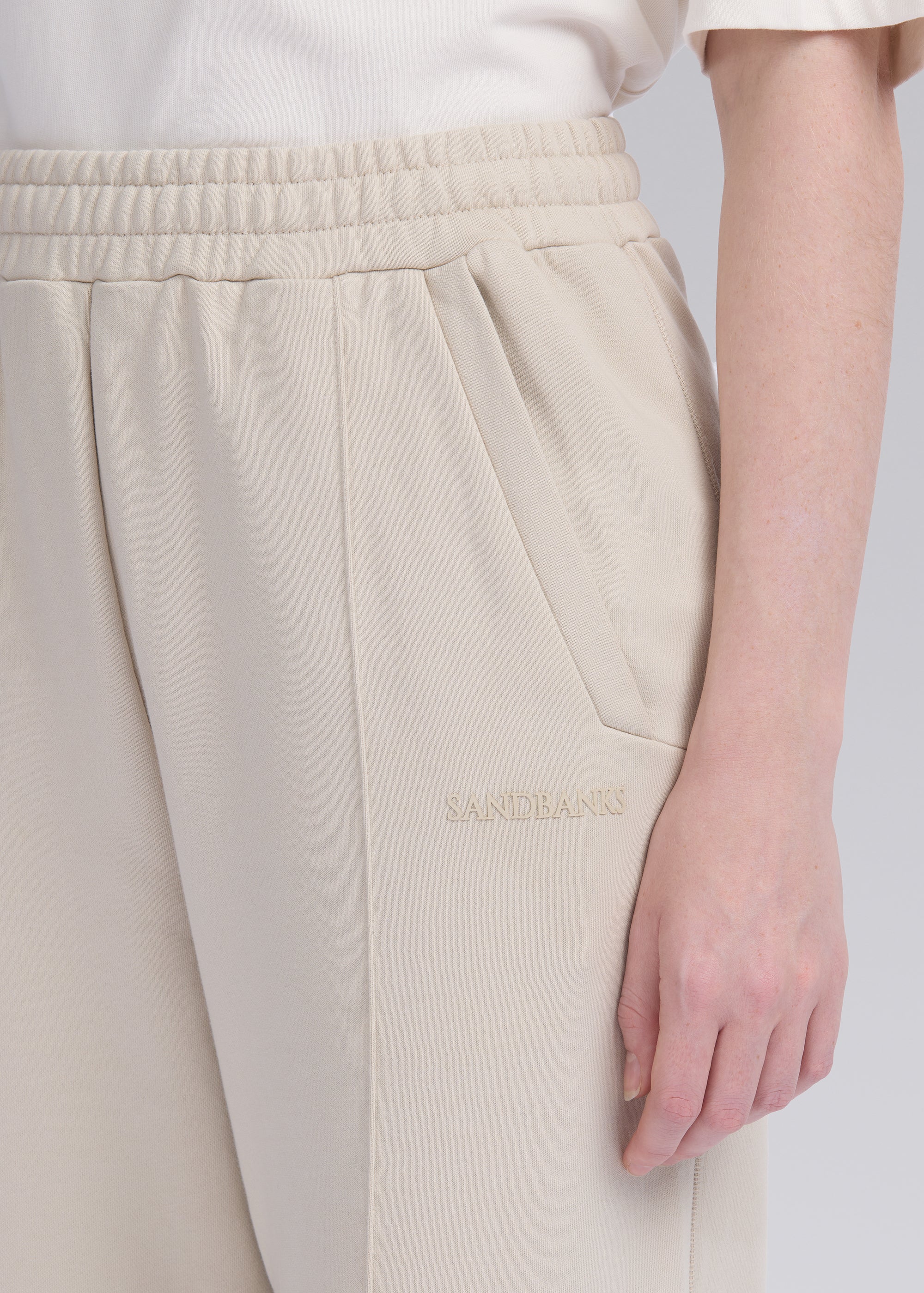 Our women's Sandbanks wide leg track pants in stone are constructed with a 400gsm diagonal knitted fabric that features a slight brushed back for a superior soft feeling and warmth, whilst remaining breathable. Made from 100% BCI Cotton with a tonal Sandbanks raised rubber print, and internal tri-colour flat draw cord.