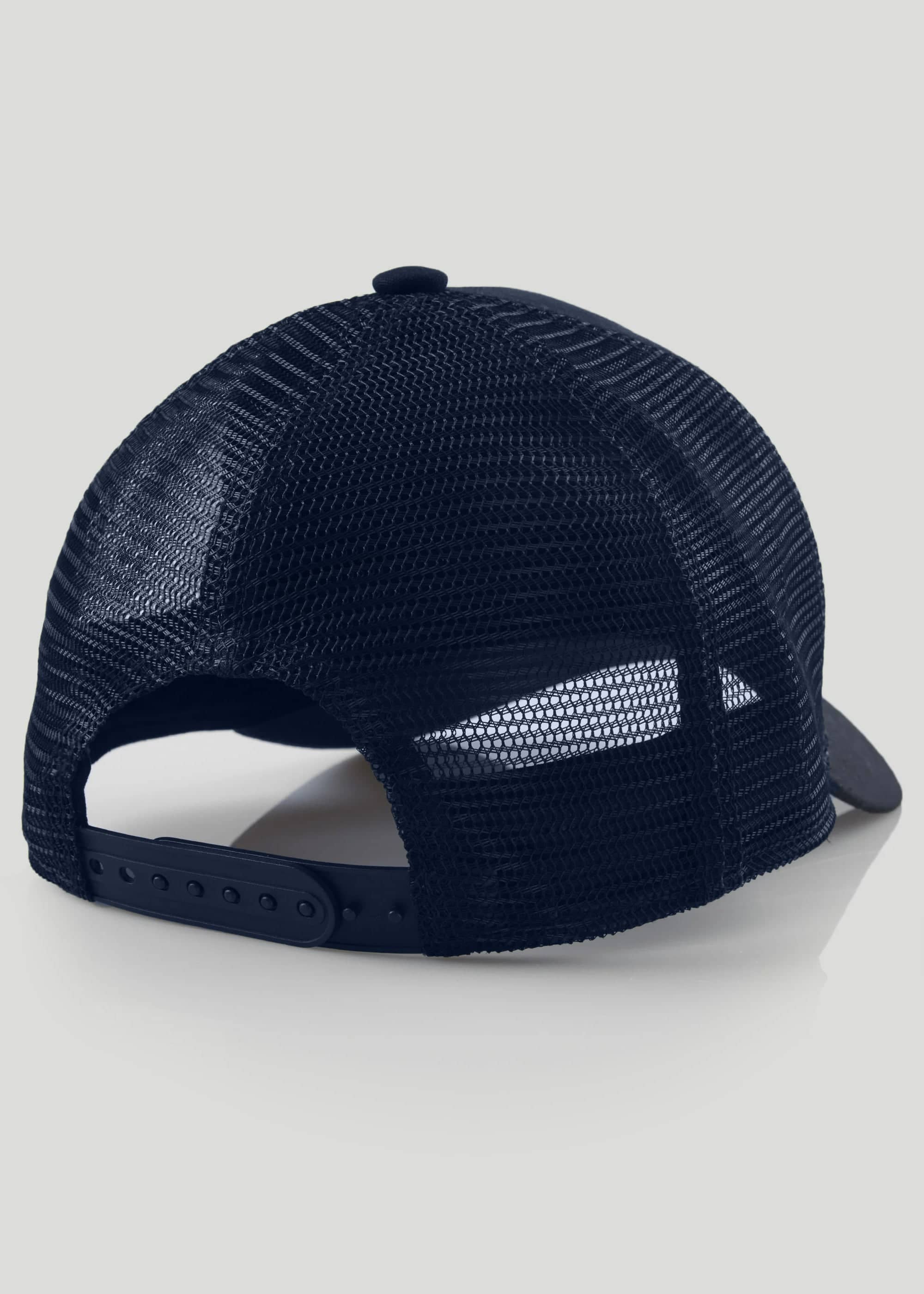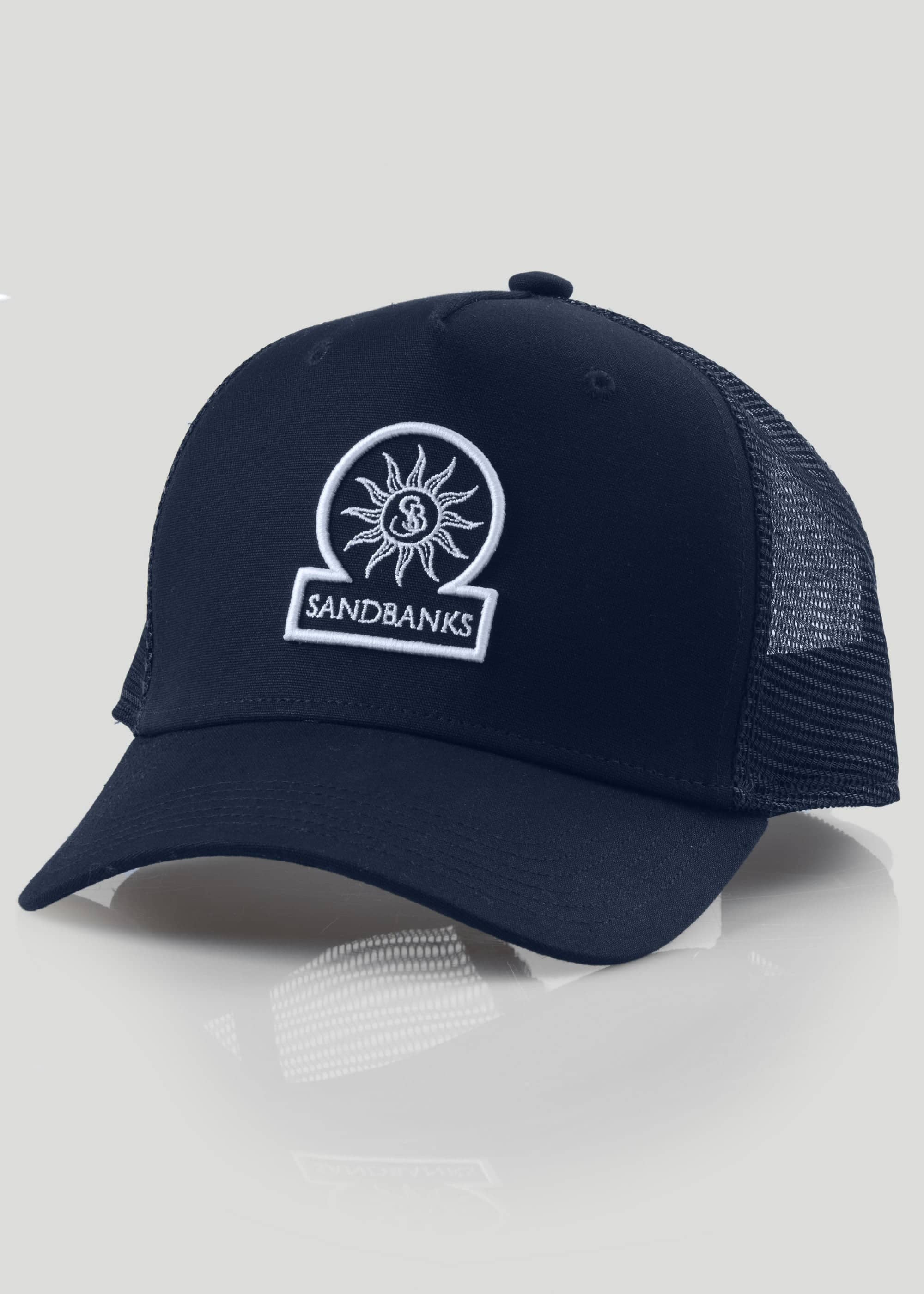 Sandbanks Badge Logo mesh back cap in navy made from 100% organic cotton featuring white embroidered badge logo.