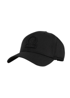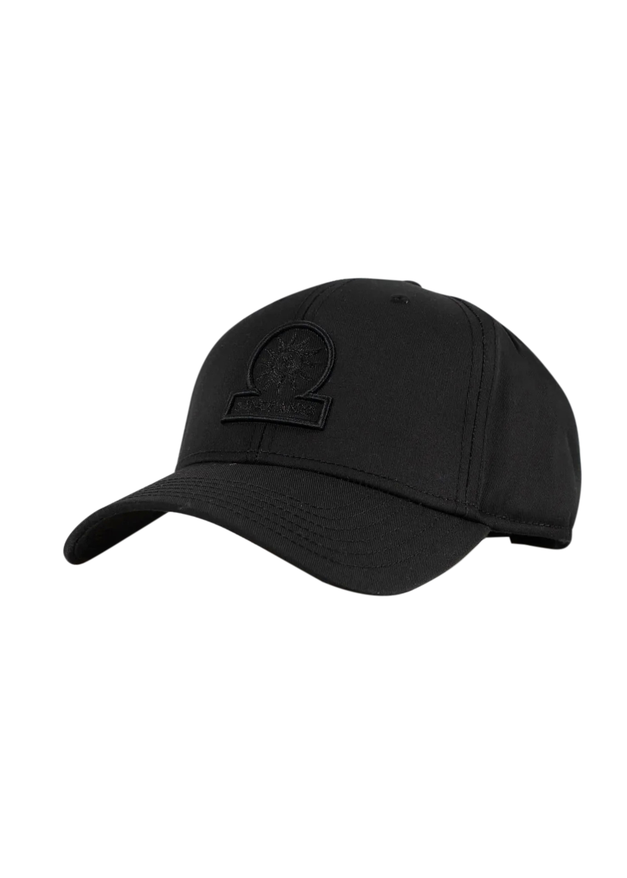 Sandbanks Badge Logo strap-back cap in black with black badge and black embroidered logo made entirely from recycled polyester (plastic bottles) and features, knitted tri-colour rear strap and laser engraved SB logo fastener in gun metal.