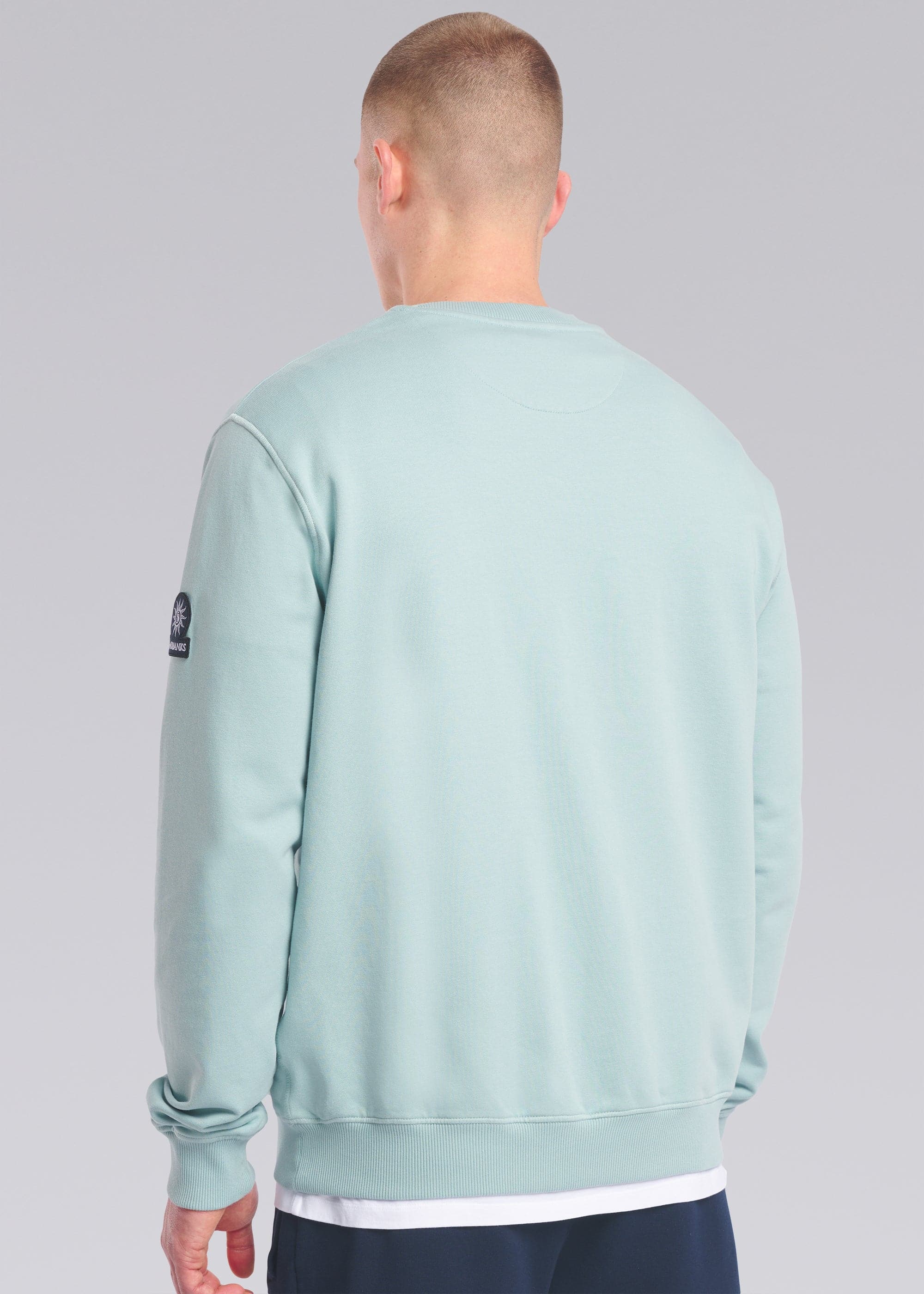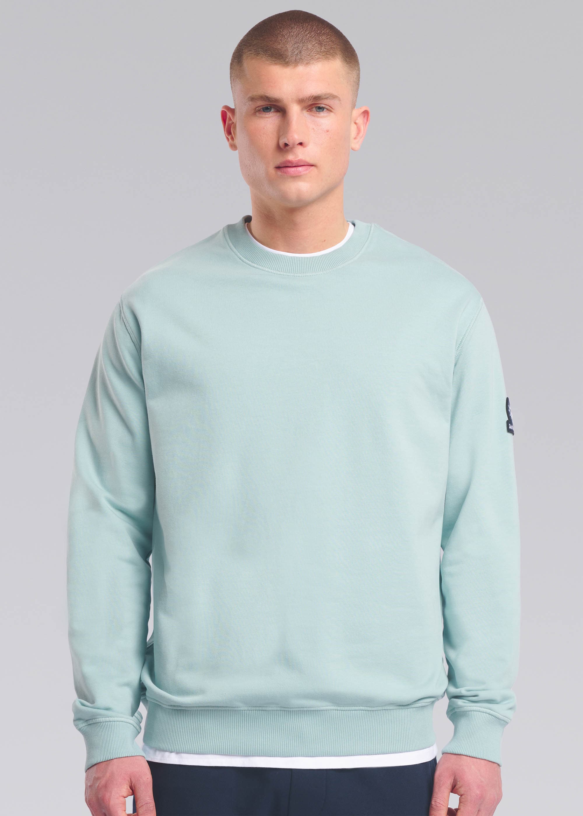 Our new and improved men's Sandbanks badge logo sweatshirt in steel blue. This garment has been upgraded with a 380gsm diagonal knitted fabric that features a slight brushed back for a superior soft feeling and warmth, whilst remaining breathable. Made from a 95% cotton 5% elastane for improved feel, shape retention and finished with a sleeve embroidered badge logo and cover stitch details.