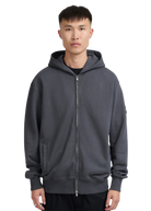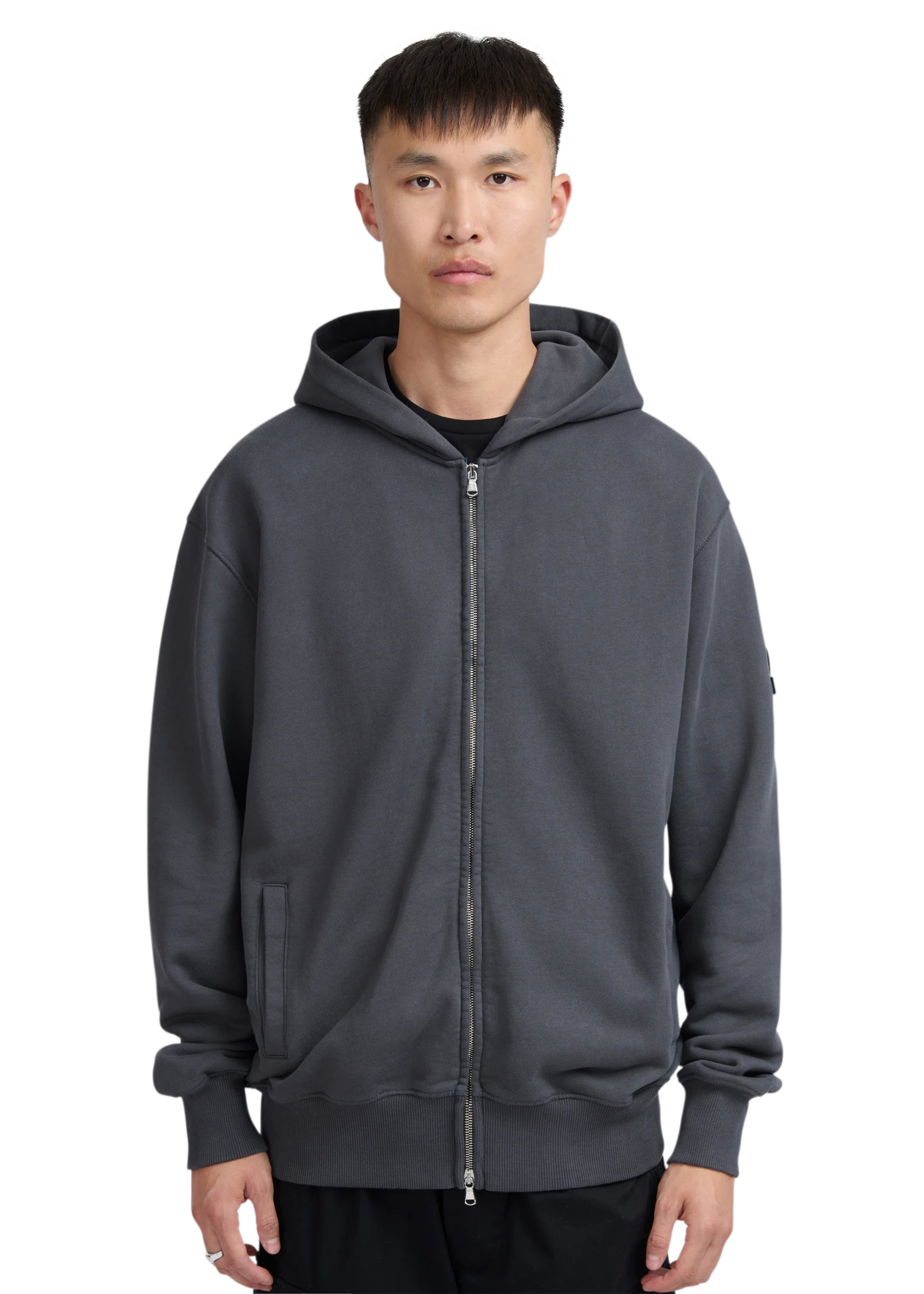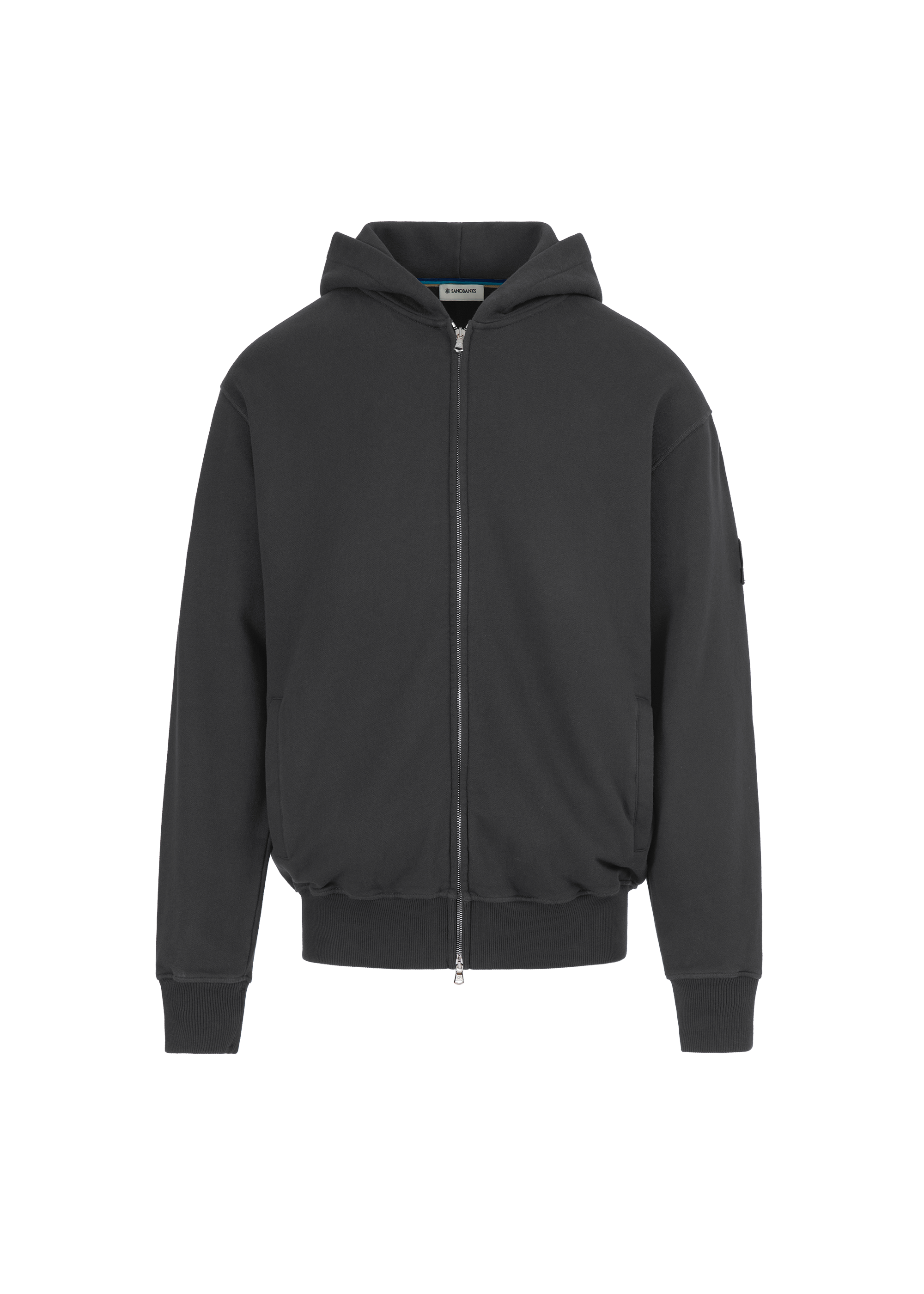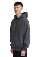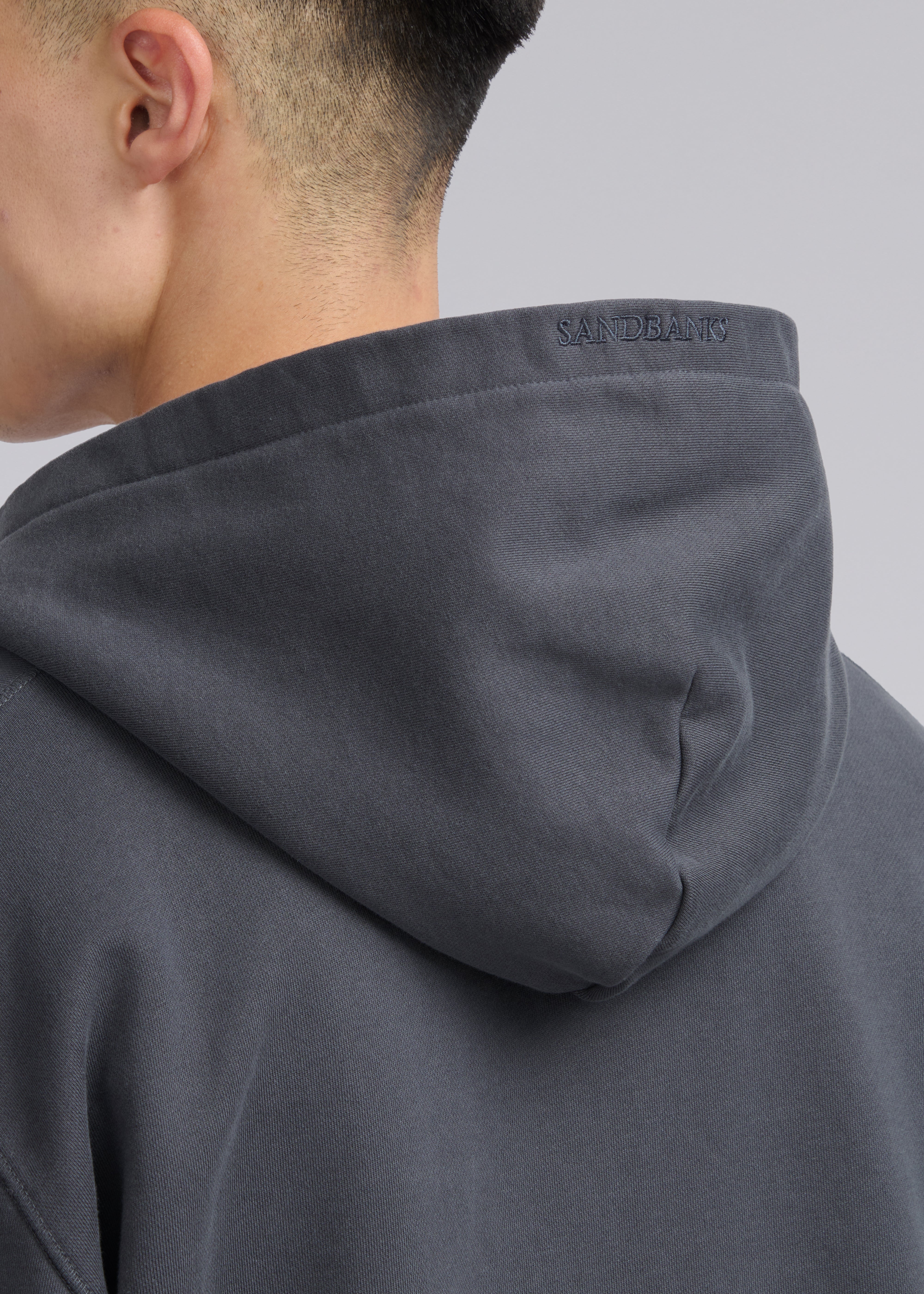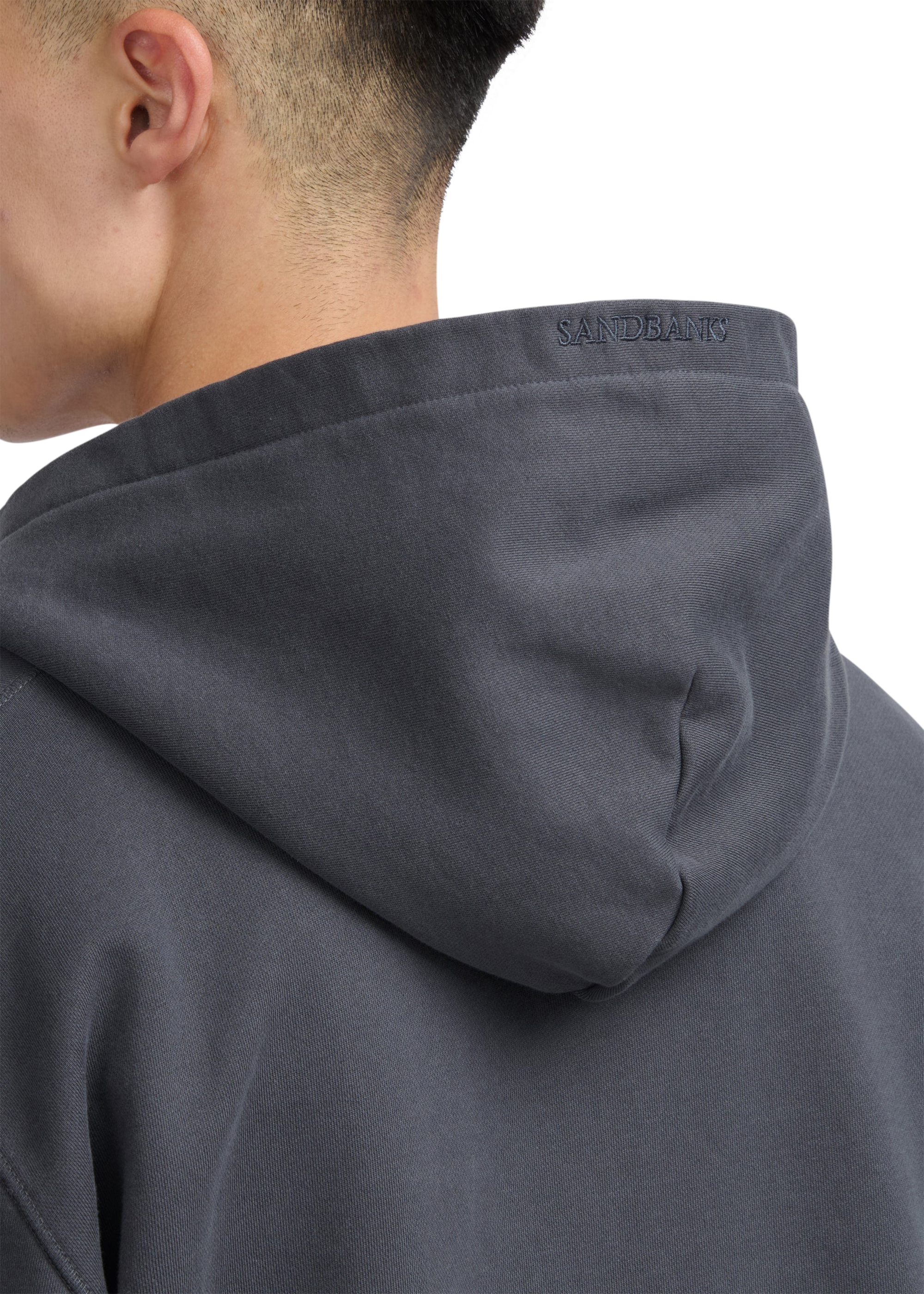Our men's Sandbanks badge logo zip hoodie in anthracite is constructed with a 400gsm diagonal knitted fabric that features a slight brushed back for a superior soft feeling and warmth, whilst remaining breathable. Made from 100% BCI Cotton with a sleeve embroidered badge logo and a silver Lampo two way zip.
