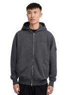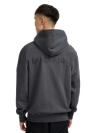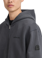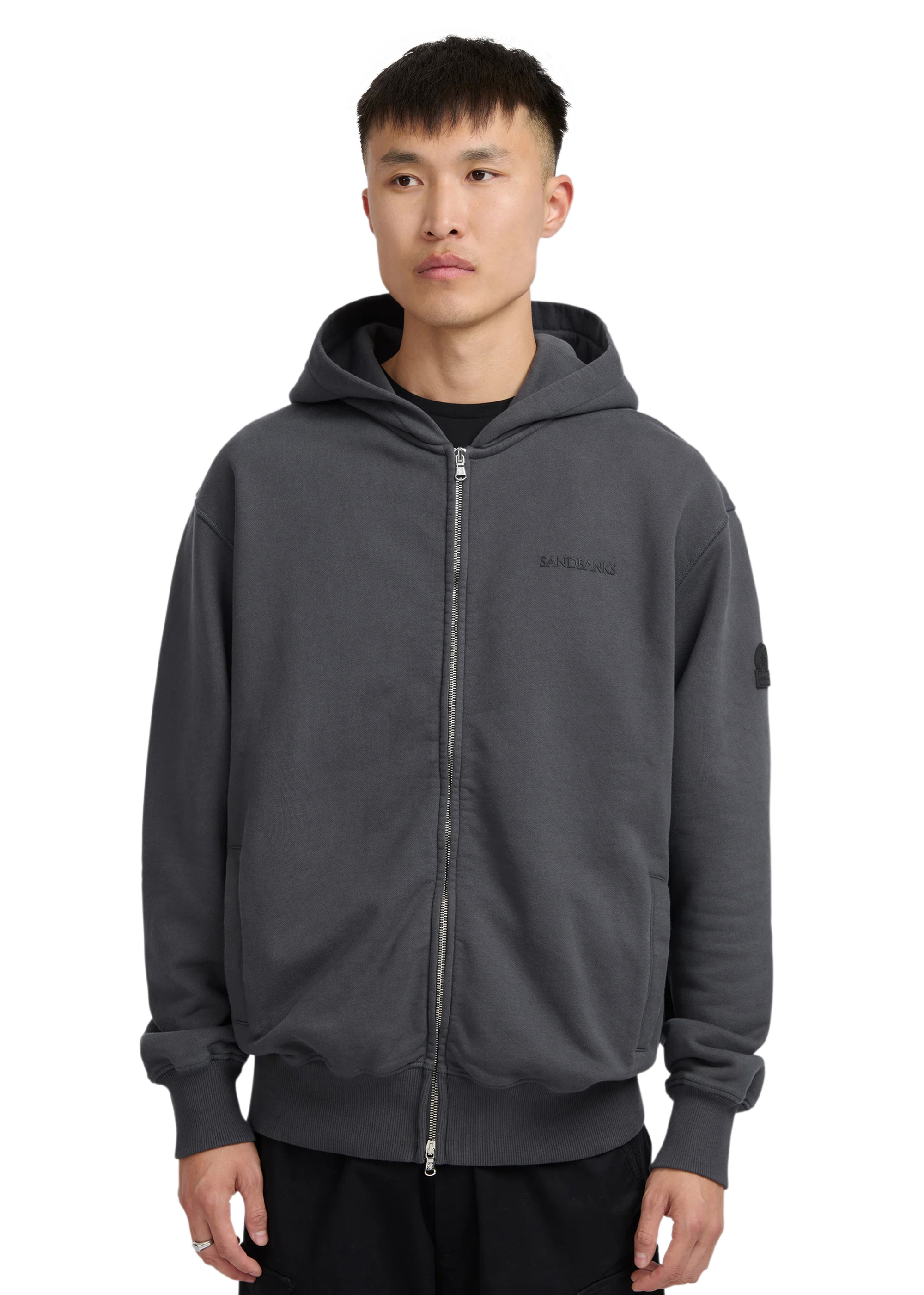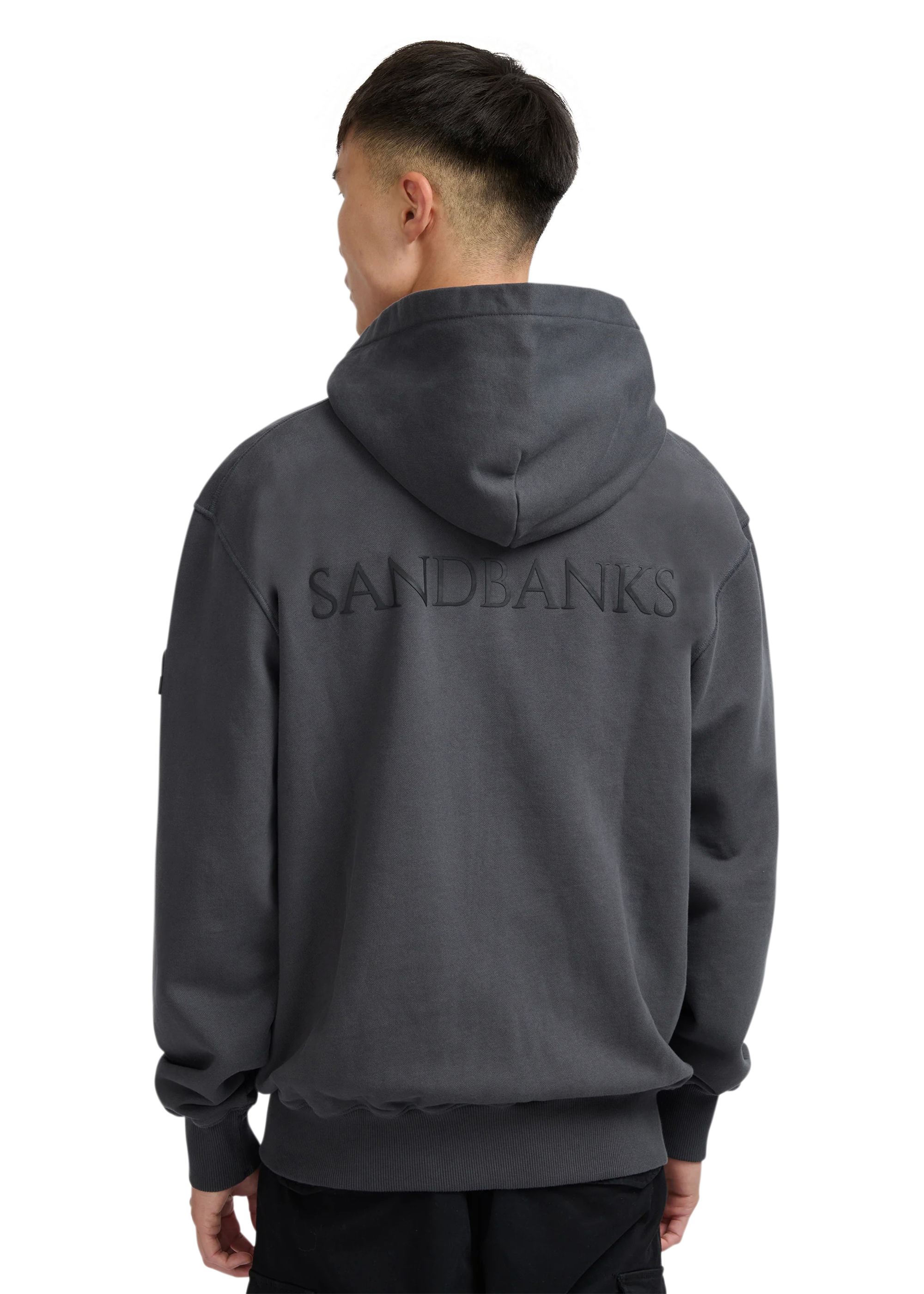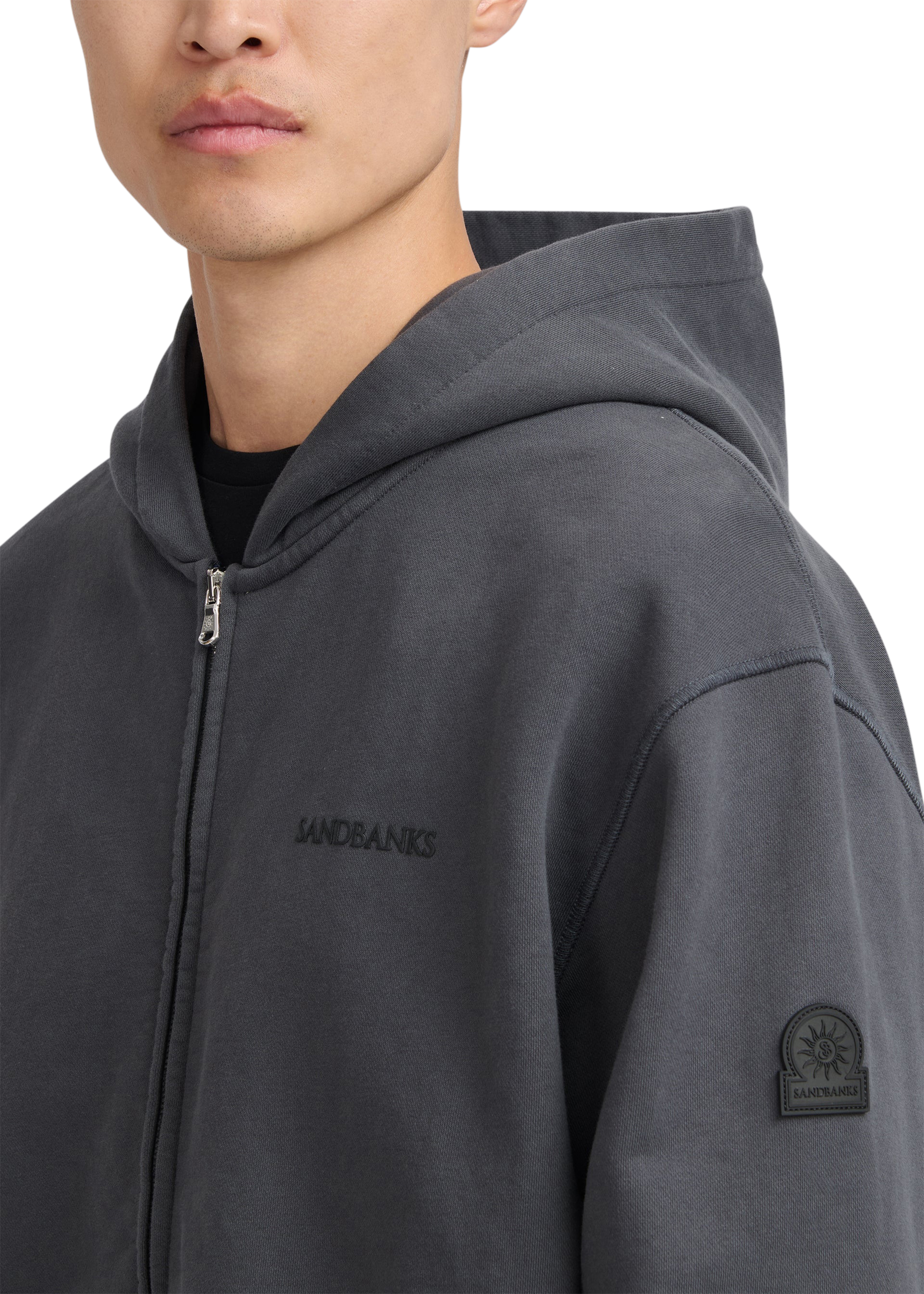 Our men's Sandbanks printed zip hoodie in anthracite is constructed with a 400gsm diagonal knitted fabric that features a slight brushed back for a superior soft feeling and warmth, whilst remaining breathable. Made from 100% BCI Cotton with statement Sandbanks raised rubber prints, tonal rubberised sleeve badge logo and a silver Lampo two way zip.