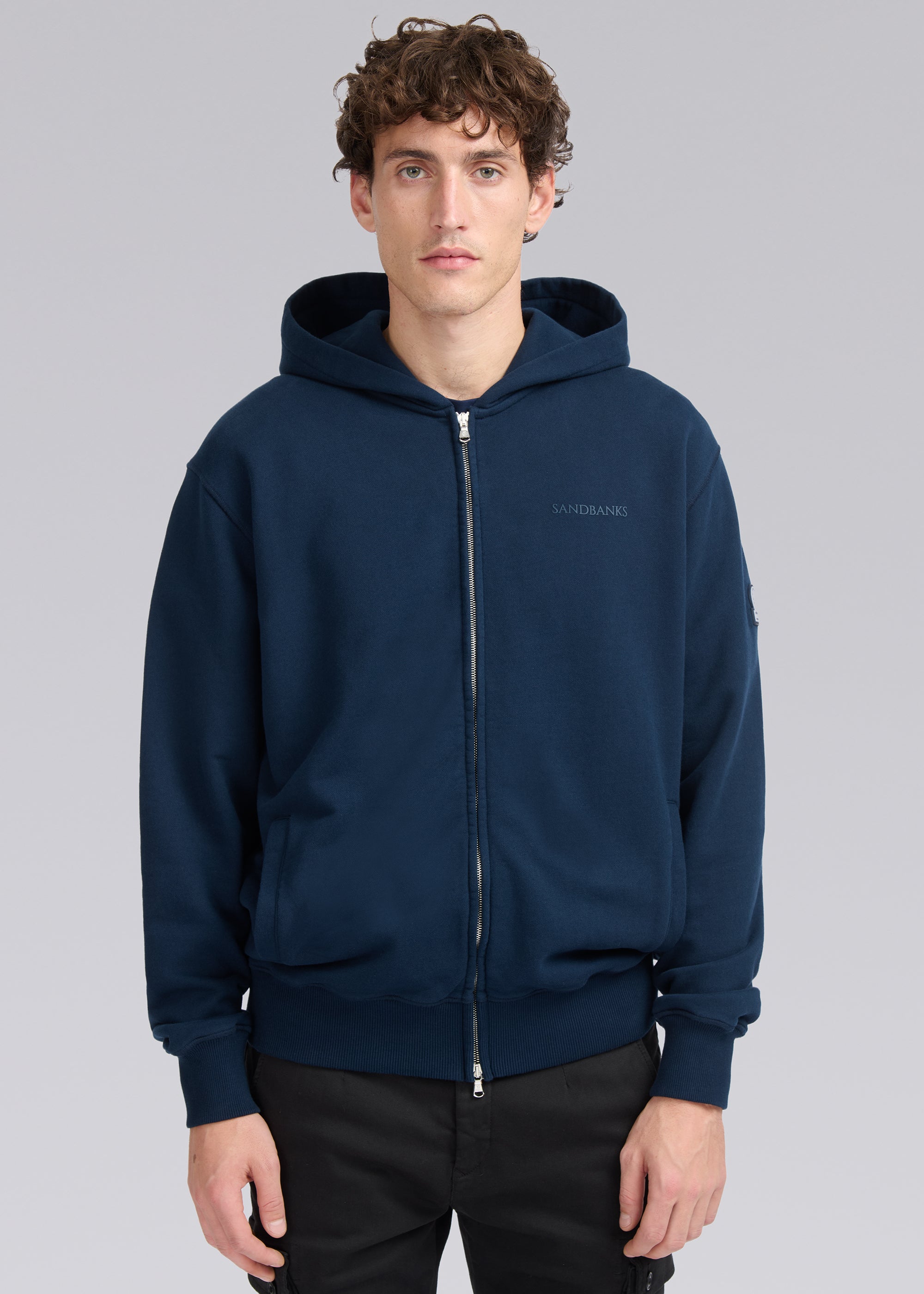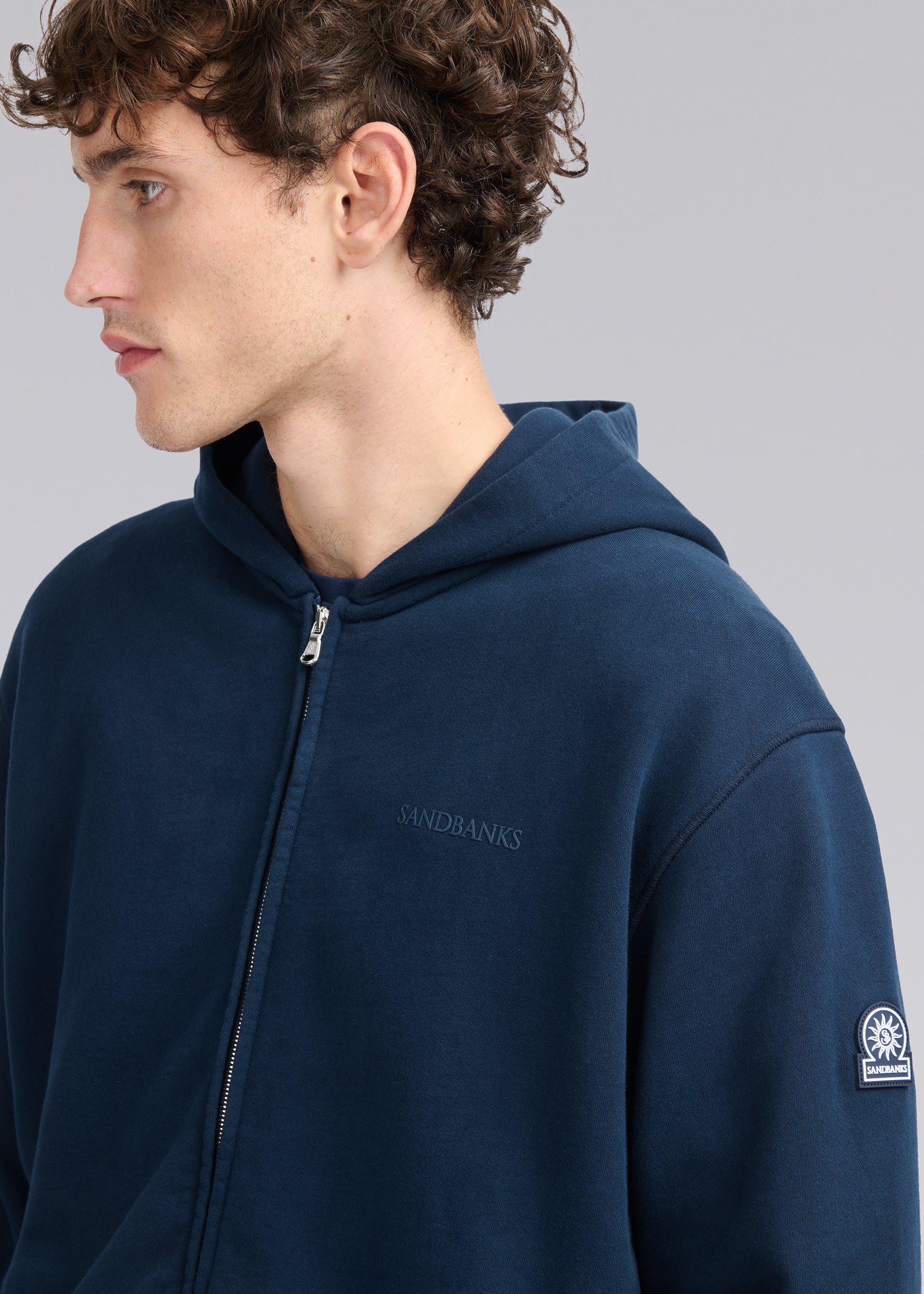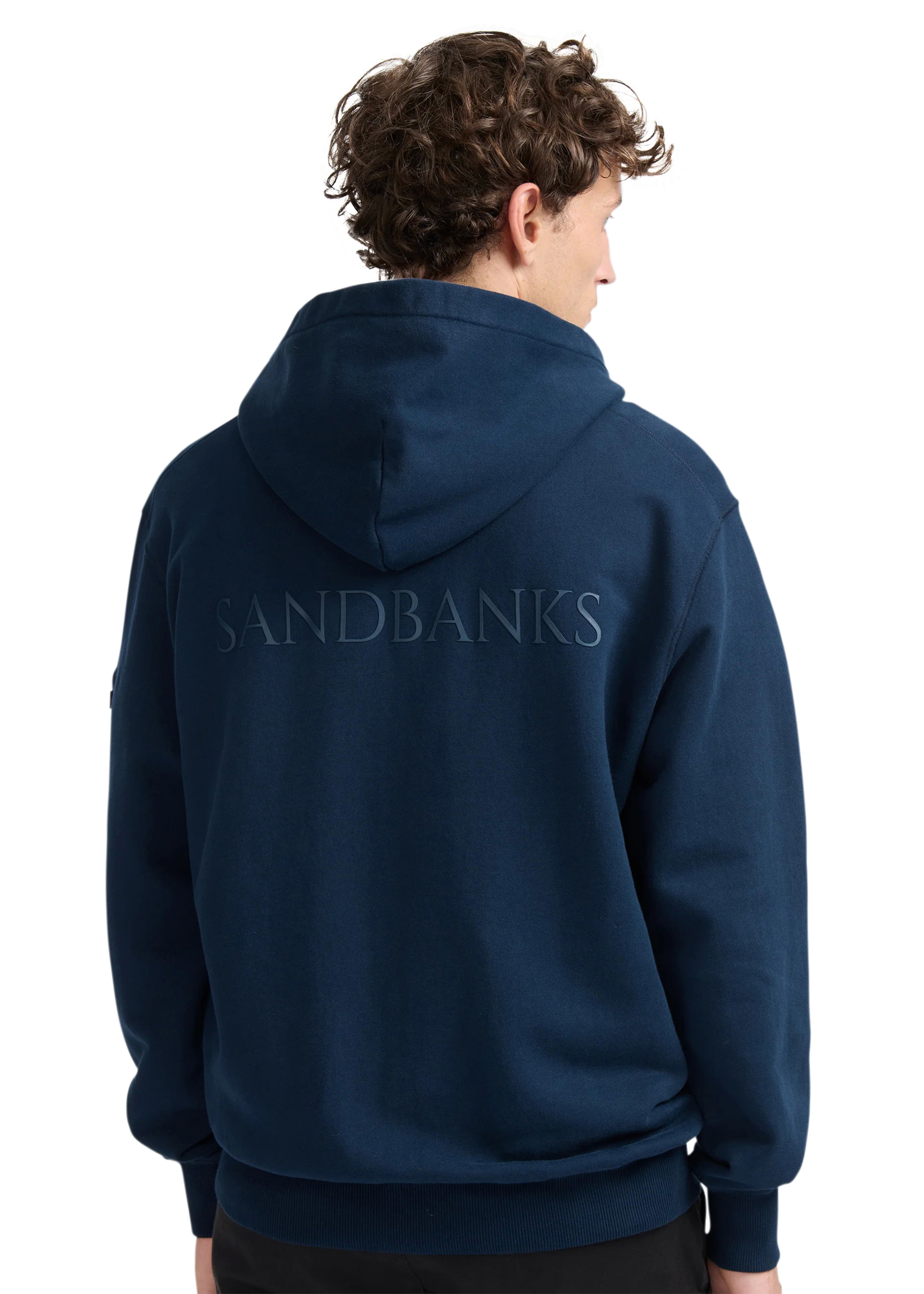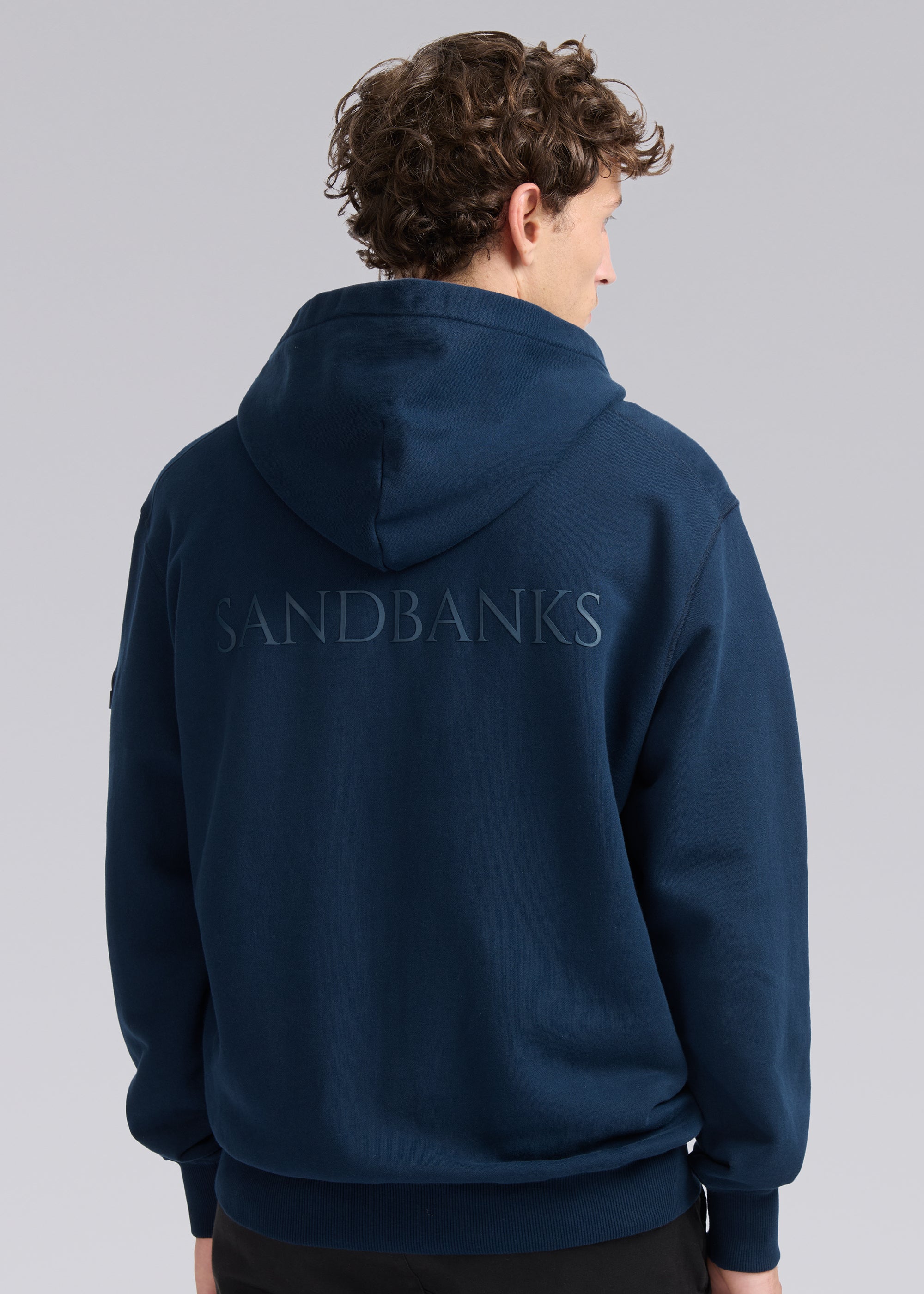 Our men's Sandbanks printed zip hoodie in navy is constructed with a 400gsm diagonal knitted fabric that features a slight brushed back for a superior soft feeling and warmth, whilst remaining breathable. Made from 100% BCI Cotton with statement Sandbanks raised rubber prints, tonal rubberised sleeve badge logo and a silver Lampo two way zip.
