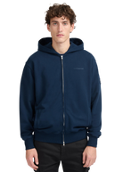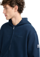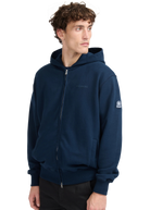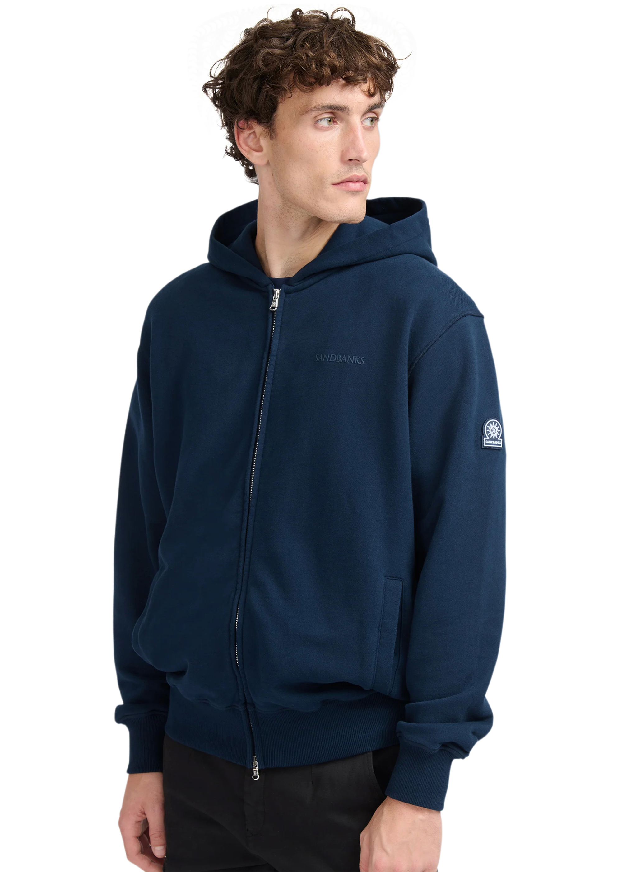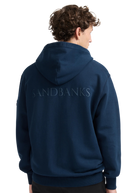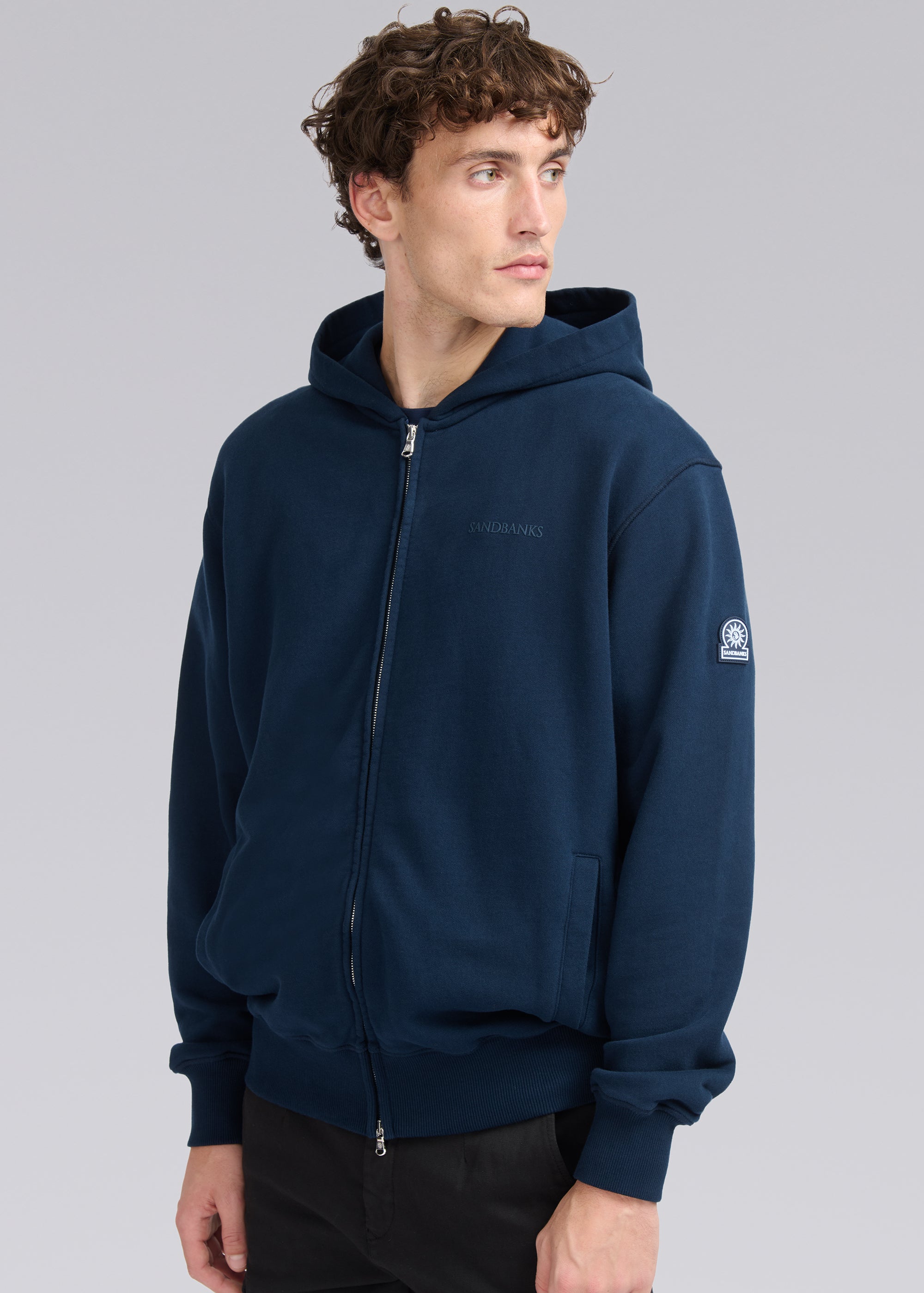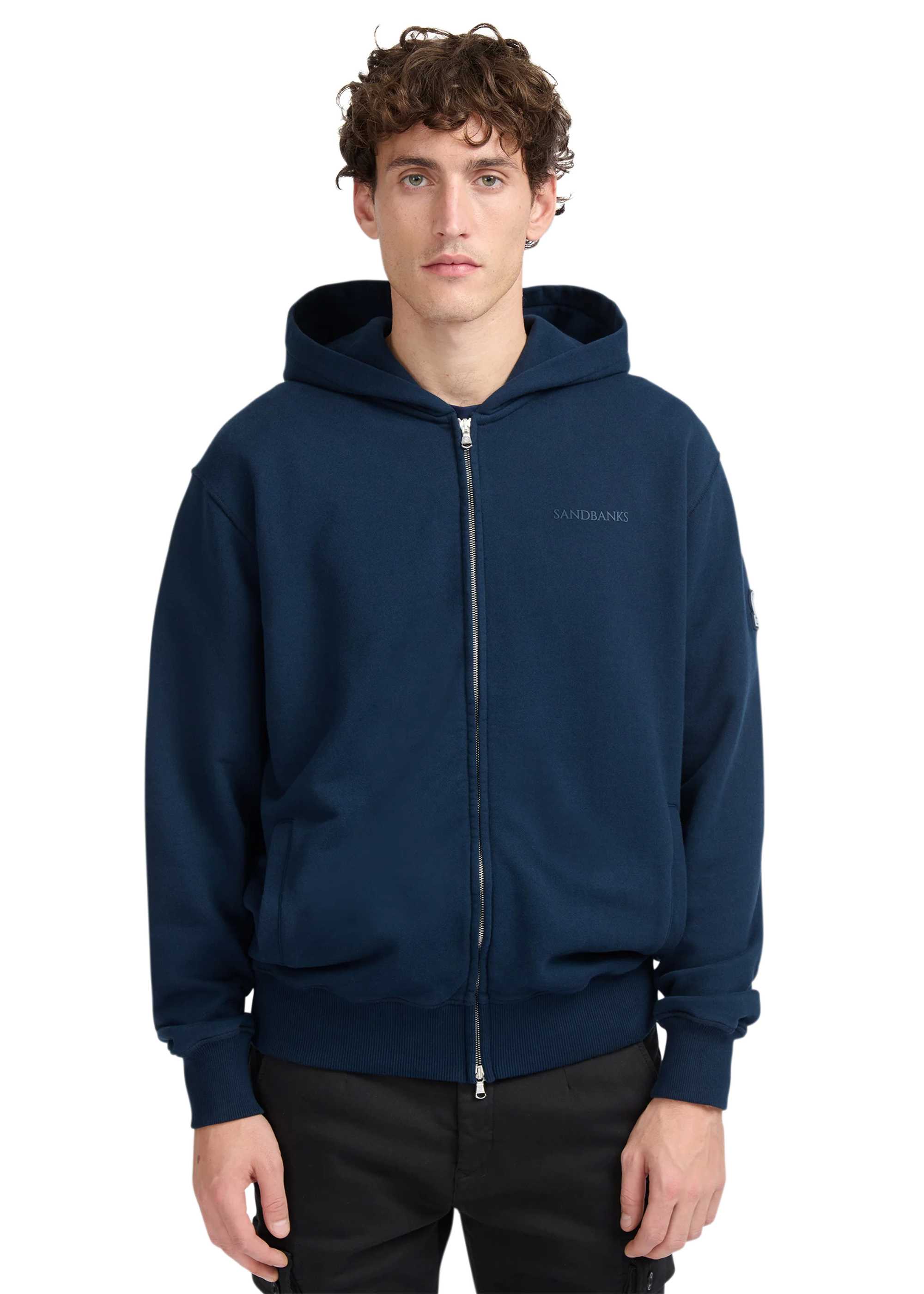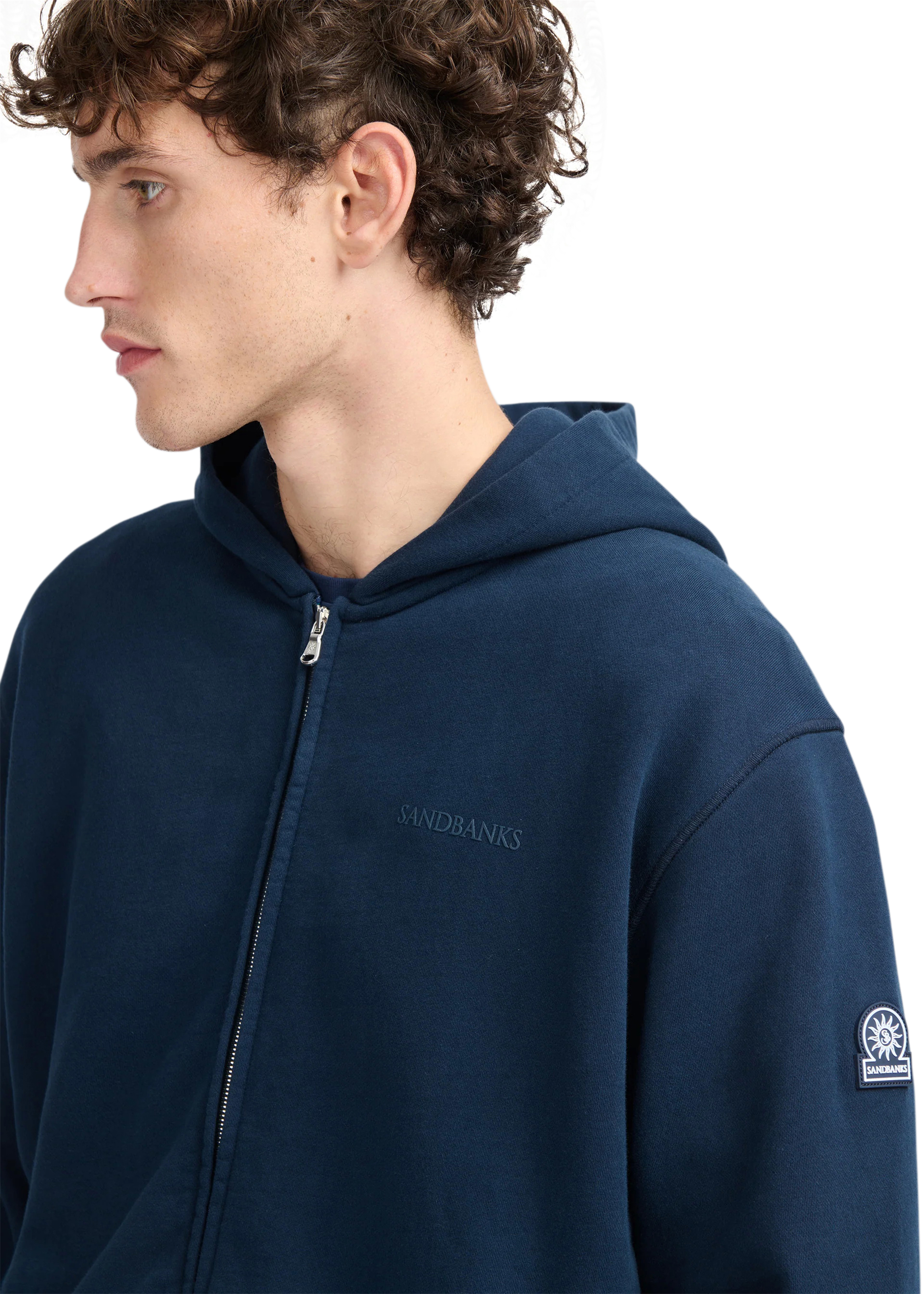 Our men's Sandbanks printed zip hoodie in navy is constructed with a 400gsm diagonal knitted fabric that features a slight brushed back for a superior soft feeling and warmth, whilst remaining breathable. Made from 100% BCI Cotton with statement Sandbanks raised rubber prints, tonal rubberised sleeve badge logo and a silver Lampo two way zip.