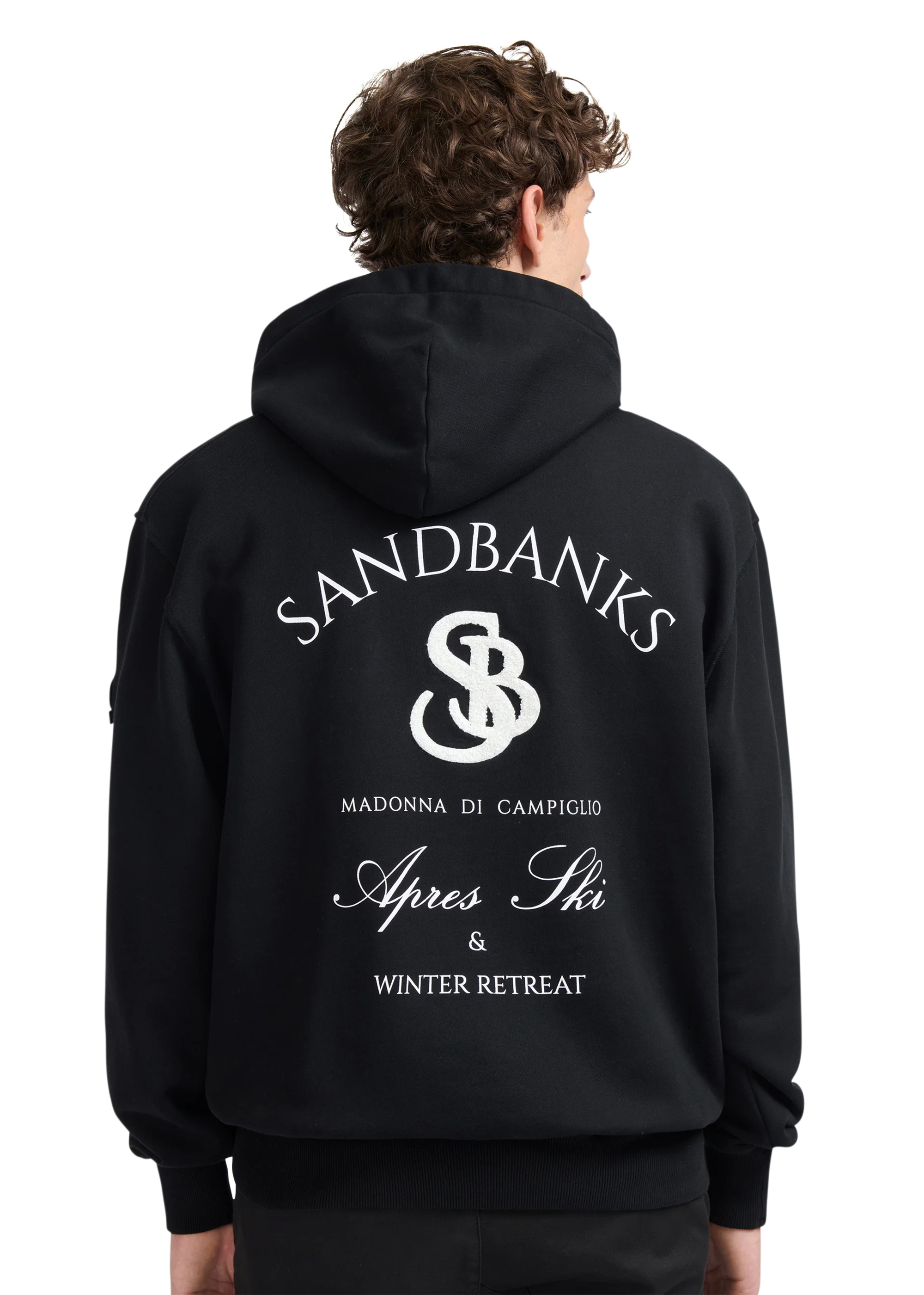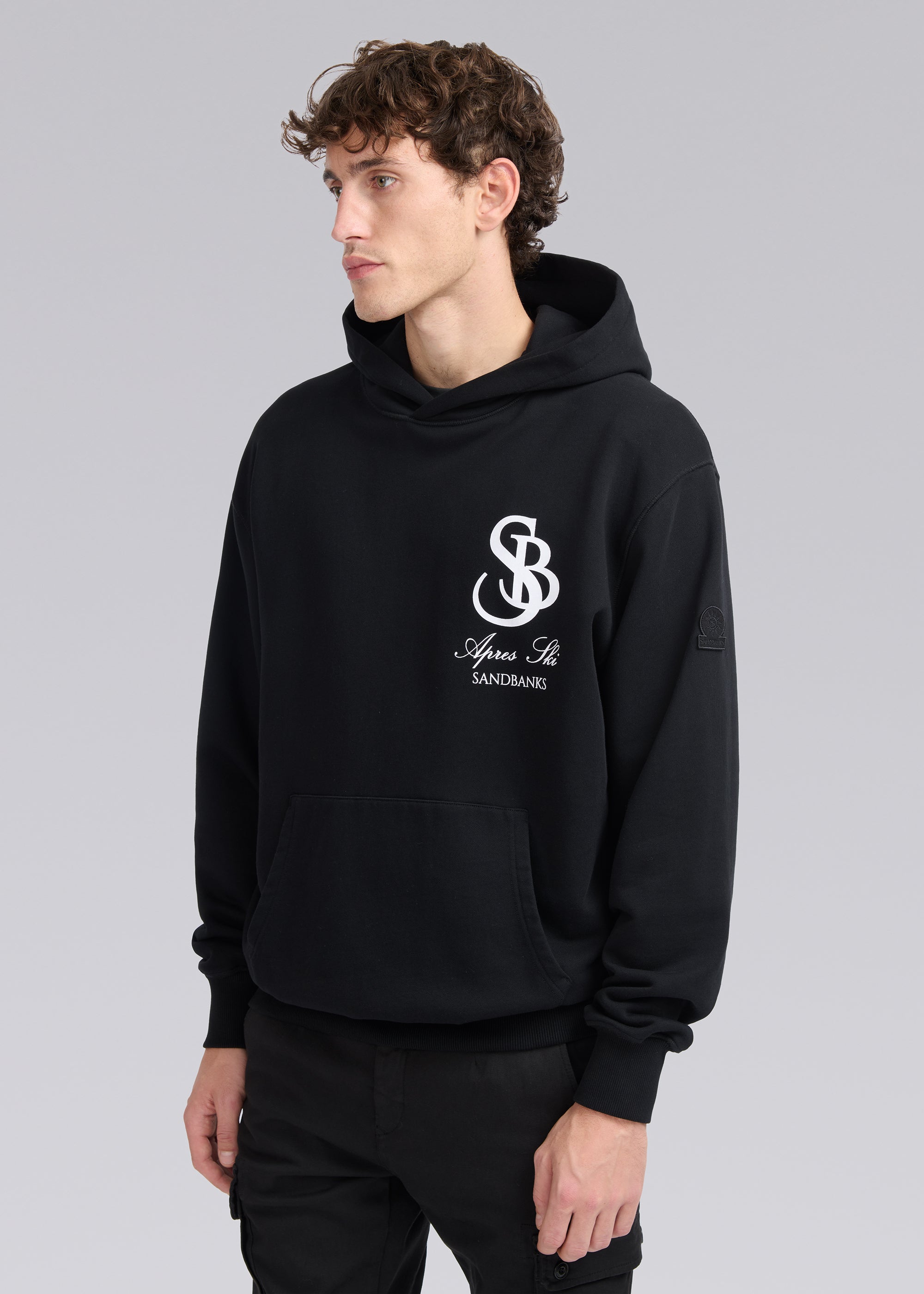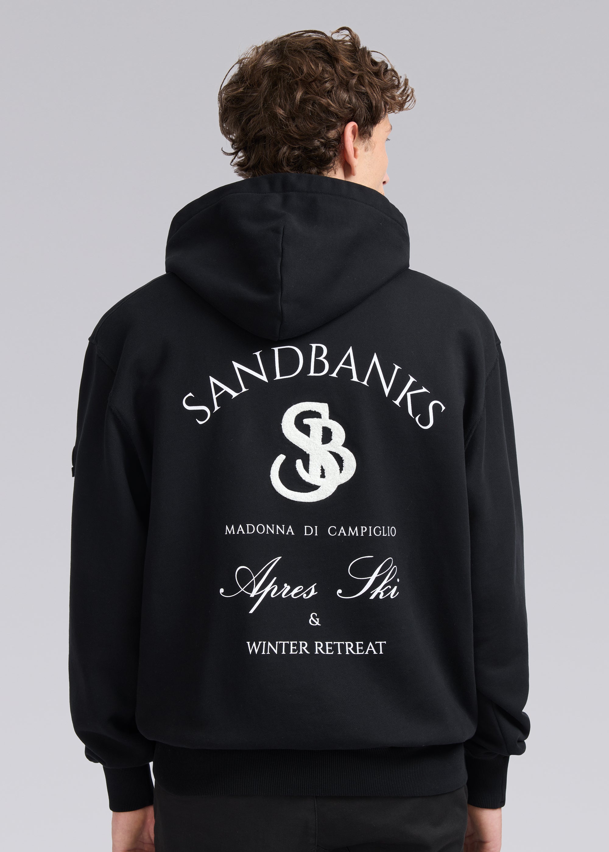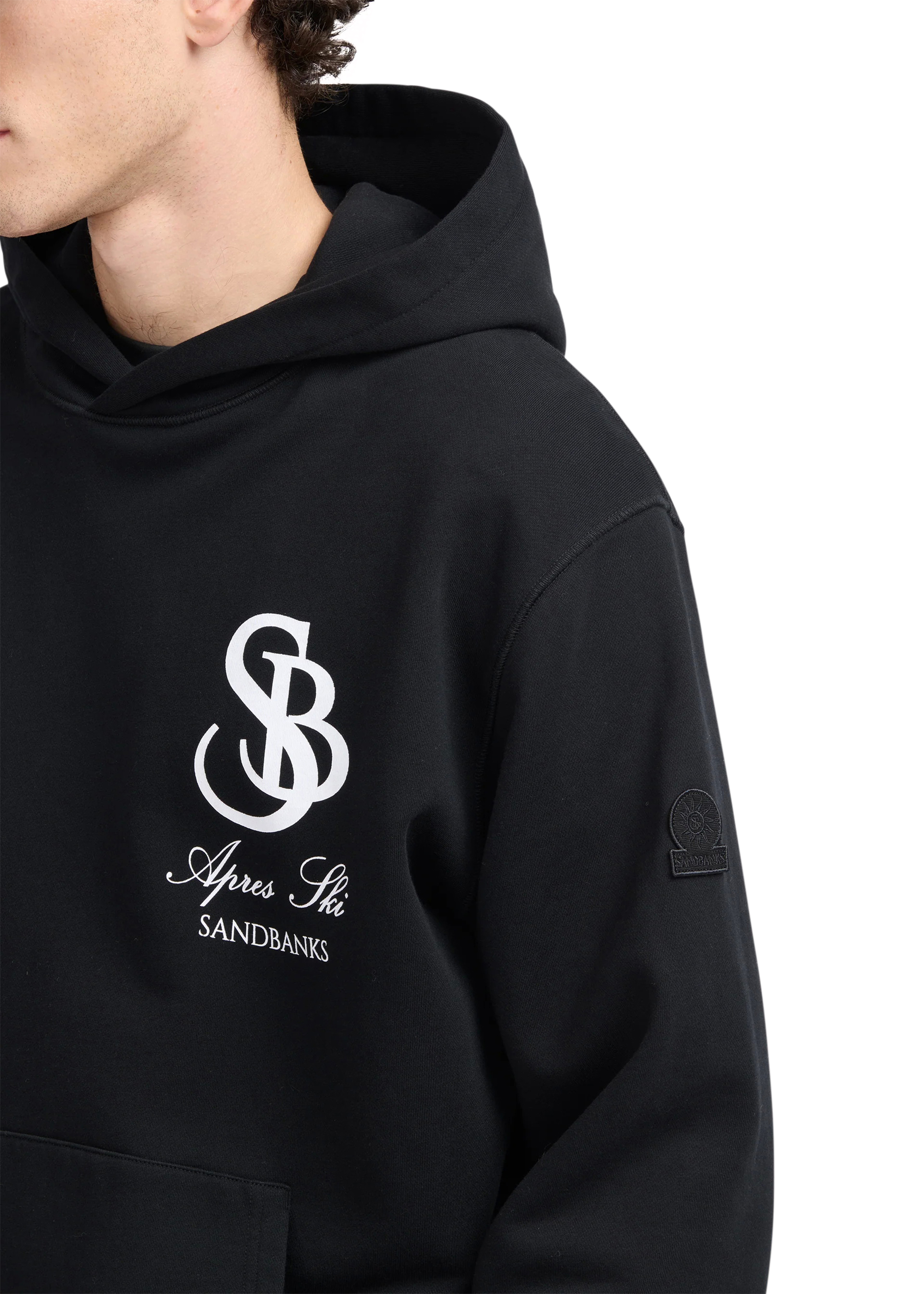 Our Sandbanks SB Après Ski hoodie in black is constructed with a 400gsm diagonal knitted fabric that features a slight brushed back for a superior soft feeling and warmth, whilst remaining breathable. Made from 100% BCI Cotton with tonal sleeve embroidered badge logo and statement white SB Après print finished with boucle SB on the back. This edit captures the essence of outdoor exploration and the thrill of adventure, bringing the spirit of the mountains and the freedom of the open air into everyday wear.