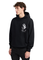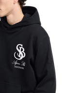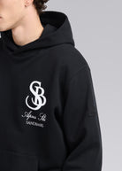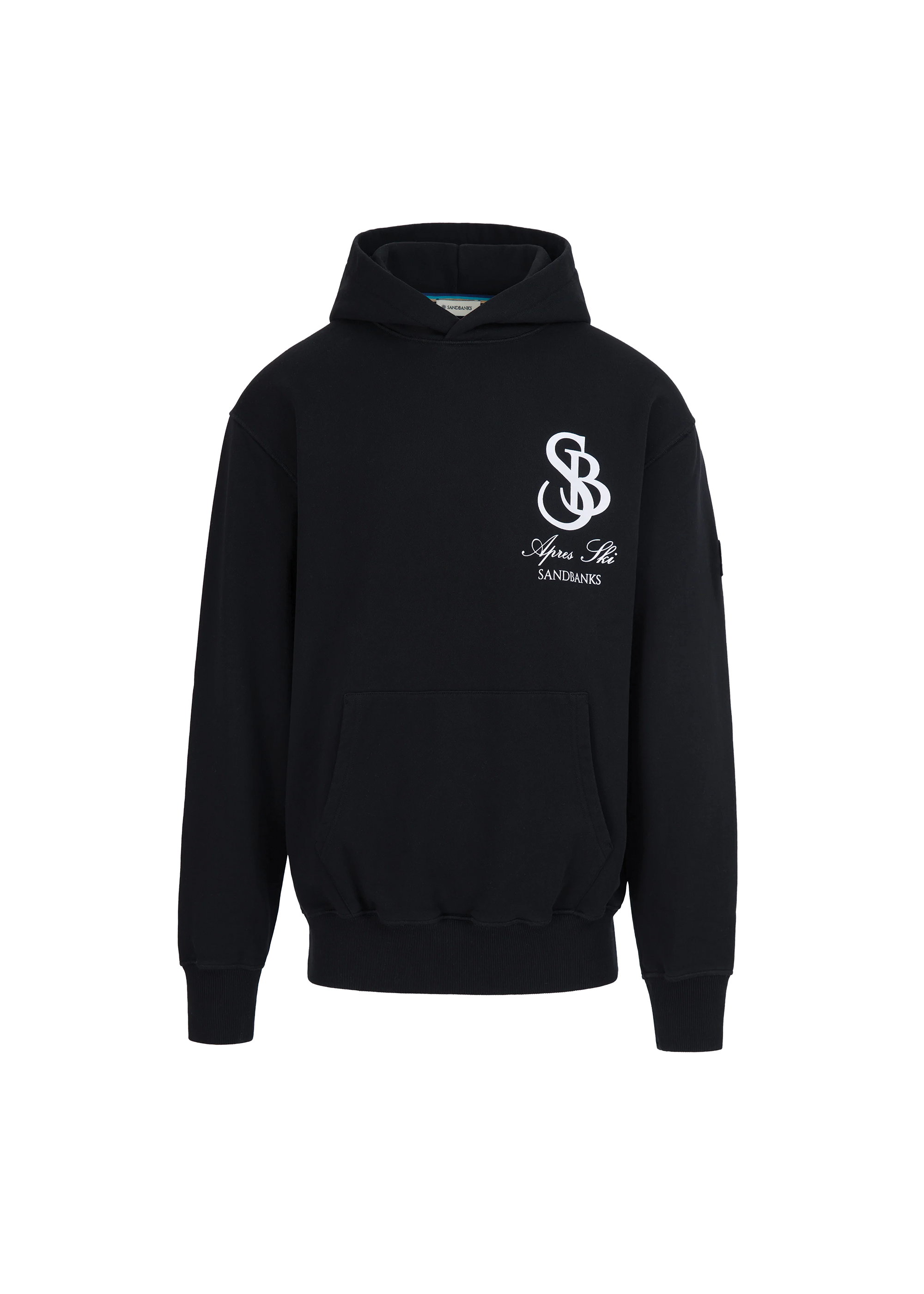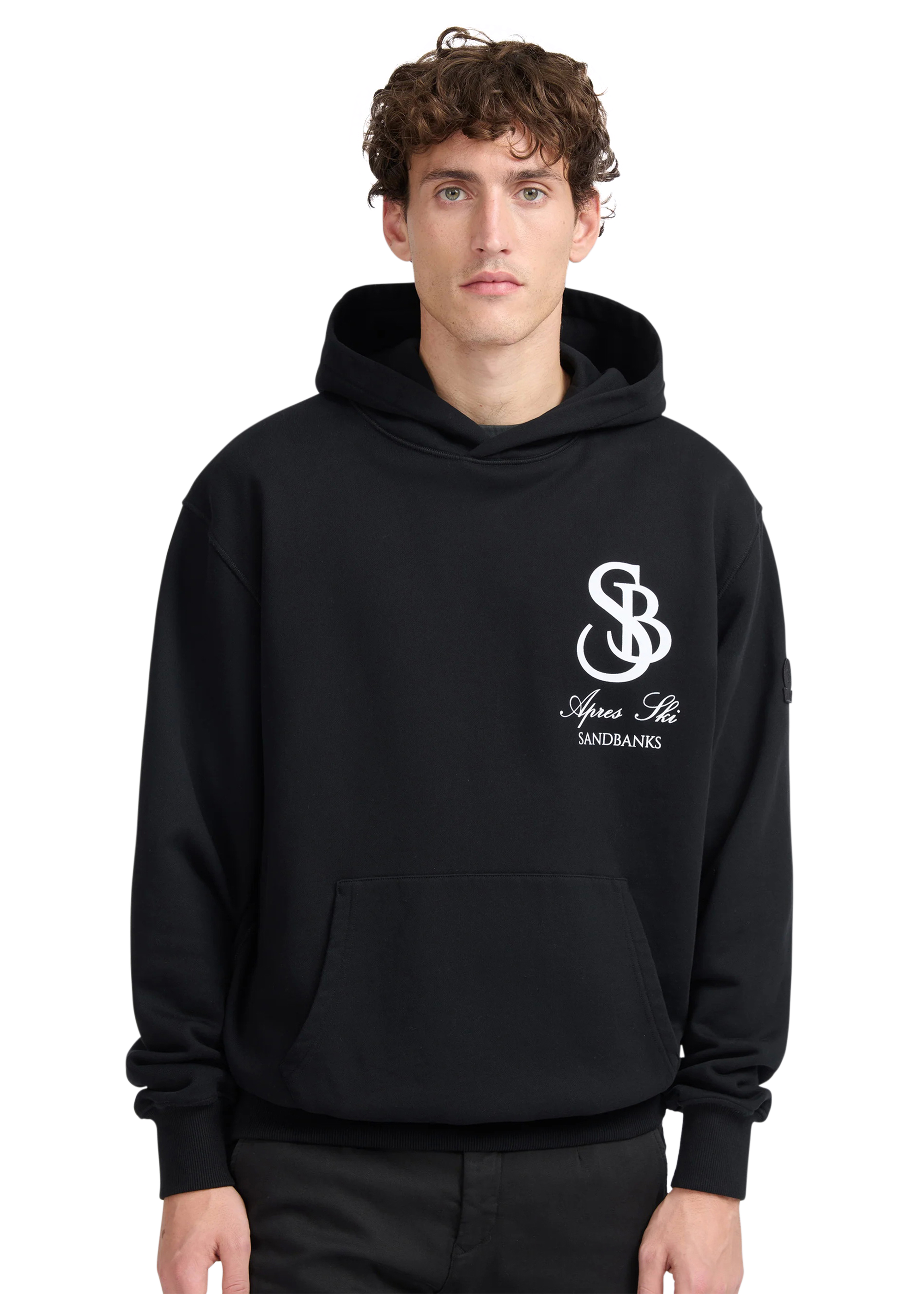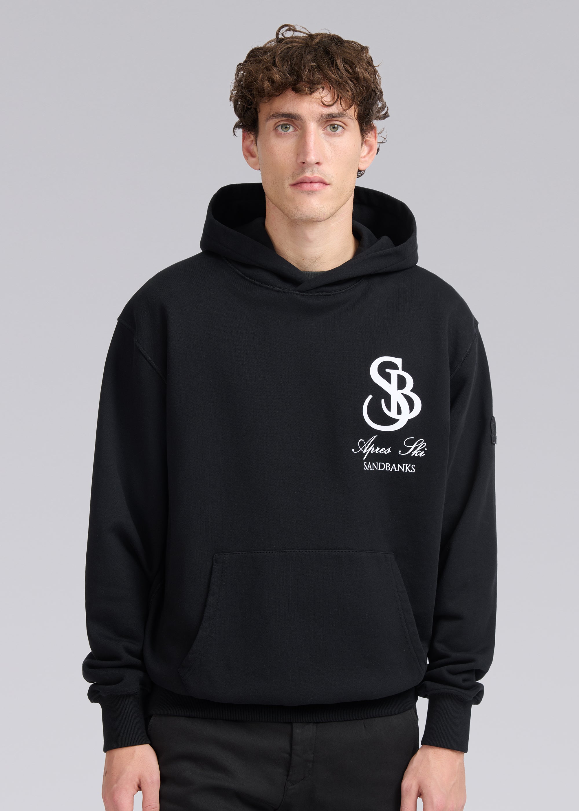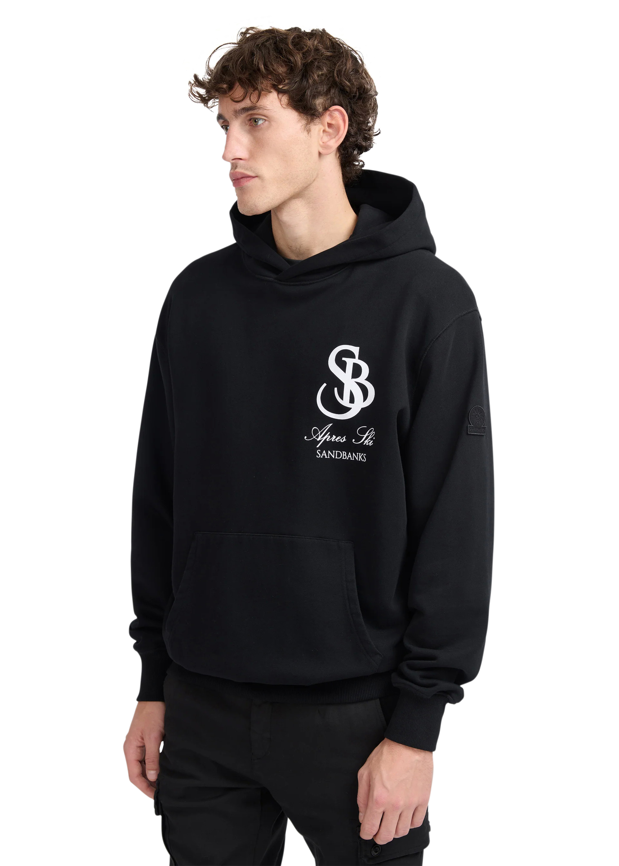 Our Sandbanks SB Après Ski hoodie in black is constructed with a 400gsm diagonal knitted fabric that features a slight brushed back for a superior soft feeling and warmth, whilst remaining breathable. Made from 100% BCI Cotton with tonal sleeve embroidered badge logo and statement white SB Après print finished with boucle SB on the back. This edit captures the essence of outdoor exploration and the thrill of adventure, bringing the spirit of the mountains and the freedom of the open air into everyday wear.