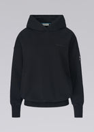 Our women's Sandbanks badge logo hoodie in black is constructed with 400gsm diagonal knitted fabric that features a slight brushed back for a superior soft feeling and warmth, whilst remaining breathable. Made from 100% BCI Cotton with a sleeve embroidered badge logo and cover stitch details.