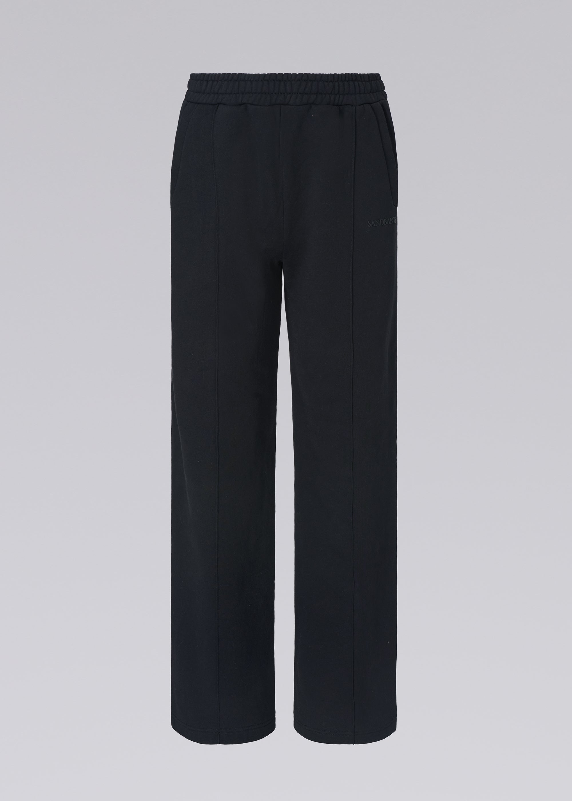Our women's Sandbanks wide leg track pants in black are constructed with a 400gsm diagonal knitted fabric that features a slight brushed back for a superior soft feeling and warmth, whilst remaining breathable. Made from 100% BCI Cotton with a tonal Sandbanks raised rubber print, and internal tri-colour flat draw cord.