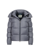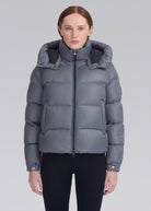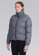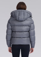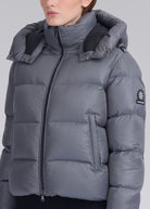 Sandbanks Aurora puffer jacket for women in charcoal, crafted from lightweight Italian fabric made from recycled polyester and filled with eco-down made from recycled plastic bottles. This women's short puffer features a black contrast colour lining, Lampo Italian 2-way central zip, side zip pockets with fleece lining, removable hood, elasticated hem, adjustable cuffs, gun metal components, embroidered Sandbanks logo placket and embroidered badge logo.