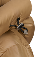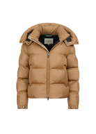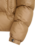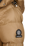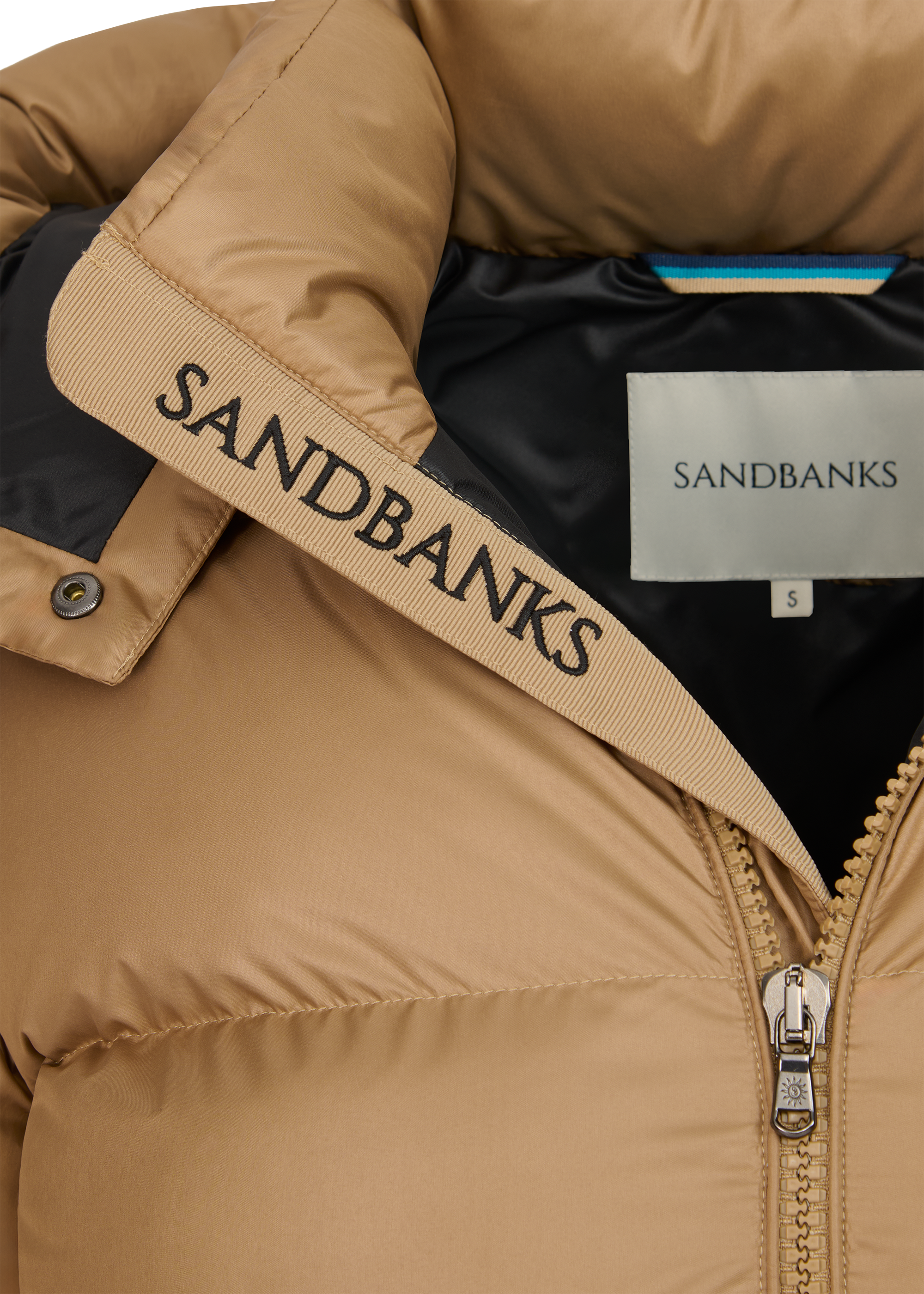Sandbanks Aurora puffer jacket for women in gold, crafted from lightweight Italian fabric made from recycled polyester and filled with eco-down made from recycled plastic bottles. This women's short puffer features a contrast colour lining, Lampo Italian 2-way central zip, side zip pockets with fleece lining, removable hood, elasticated hem, adjustable cuffs, gun metal components, embroidered Sandbanks logo placket and embroidered badge logo.
