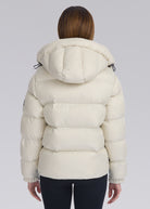 Sandbanks Aurora puffer jacket for women in stone, crafted from lightweight Italian fabric made from recycled polyester and filled with eco-down made from recycled plastic bottles. This women's short puffer features a rich brown contrast colour lining, Lampo Italian 2-way central zip, side zip pockets with fleece lining, removable hood, elasticated hem, adjustable cuffs, gun metal components, embroidered Sandbanks logo placket and embroidered badge logo.