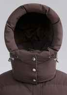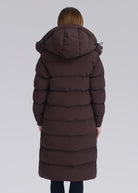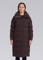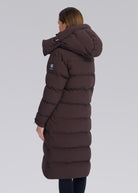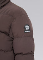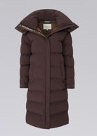 Sandbanks Haven oversized long puffer jacket for women is made almost entirely from recycled plastic bottles. With a brown outer shell fabric, this jacket has high thermal retention, and features statement Sandbanks embroidery details.