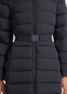 Sandbanks women's belted mid puffer in navy, a lightweight recycled natural down filled puffer jacket made from a lustrous soft shell 4-way stretch water resistant fabric. This jacket benefits from a removable zip off hood, cosy fleece lined pockets and elasticated belt with metal laser engraved clasp in a rubberised finish.